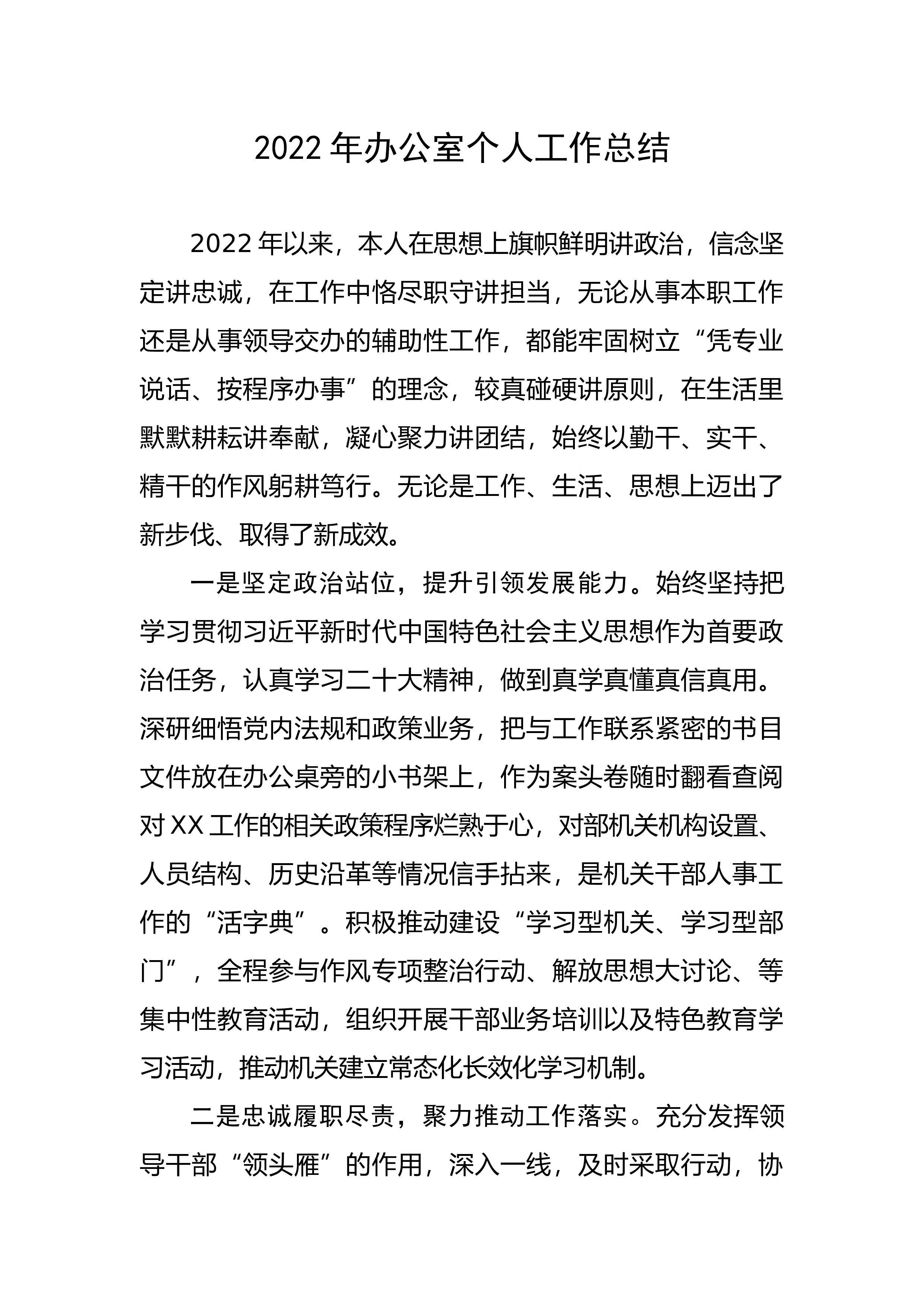 2022年办公室个人工作总结2022年以来,本人在思想上旗帜鲜明讲政治,信念坚定讲忠诚,在工作中恪尽职守讲担当,无论从事本职工作还是从事领导交办的辅助性工作,都能牢固树立“凭专业说话、按程序办事”的理念,较真碰硬讲原则,在生活里默默耕耘讲奉献,