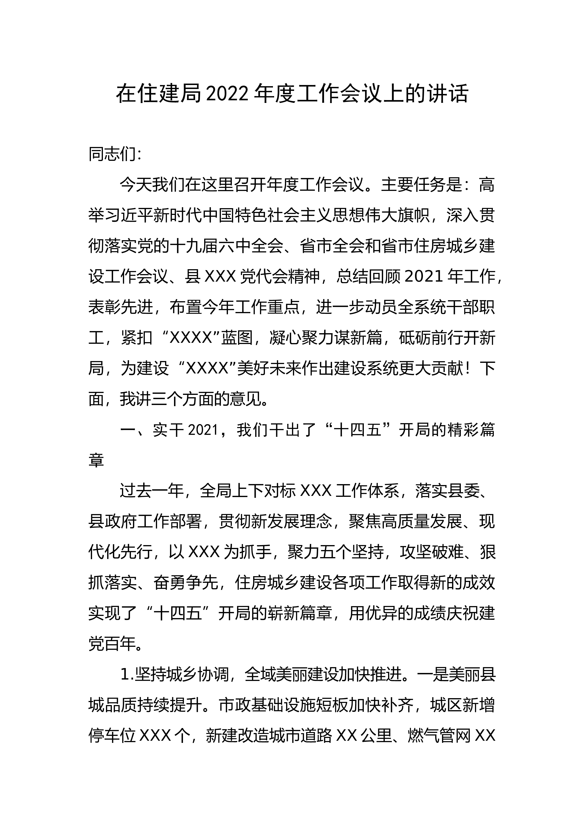 在住建局2022年度工作会议上的讲话同志们:今天我们在这里召开年度工作会议。主要任务是:高举习近平新时代中国特色社会主义思想伟大旗帜,深入贯彻落实党的十九届六中全会、省市全会和省市住房城乡建设工作会议、县XXX党代会精神,总结回顾2021年工作,表彰先进,布置今年工作重点,进一步动员全系统干部职工,紧扣“XXXX”蓝图,