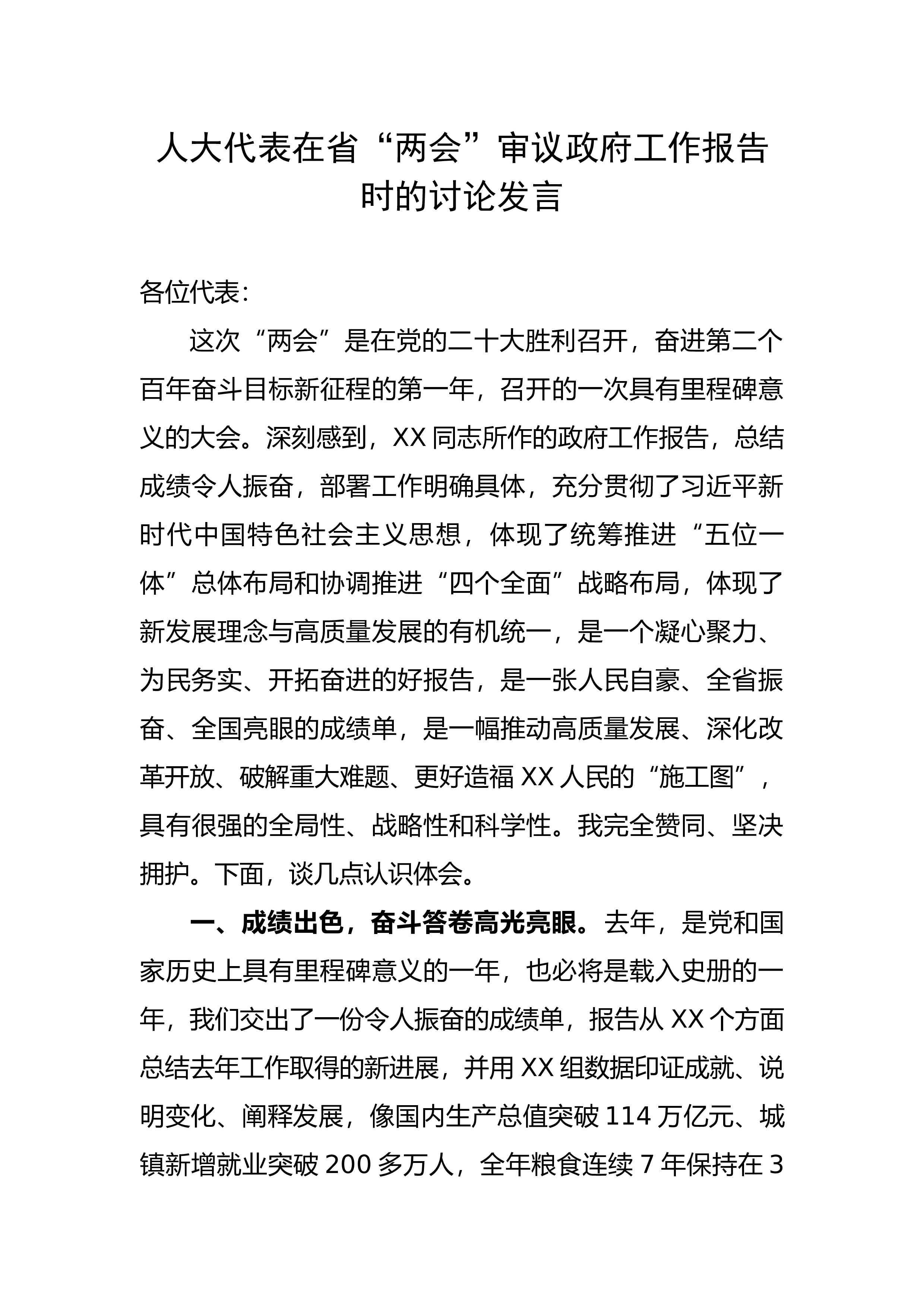 人大代表在省“两会”审议政府工作报告时的讨论发言各位代表:这次“两会”是在党的二十大胜利召开,奋进第二个百年奋斗目标新征程的第一年,召开的一次具有里程碑意义的大会。深刻感到,XX同志所作的政府工作报告,总结成绩令人振奋,部署工作明确具体,充分贯彻了习近平新时代中国特色社会主义思想,体现了统筹推进“五位一体”总体布局和协调推进“四个全面”战略布局,体现了新发展理念与高质量发展的有机统一,是一个