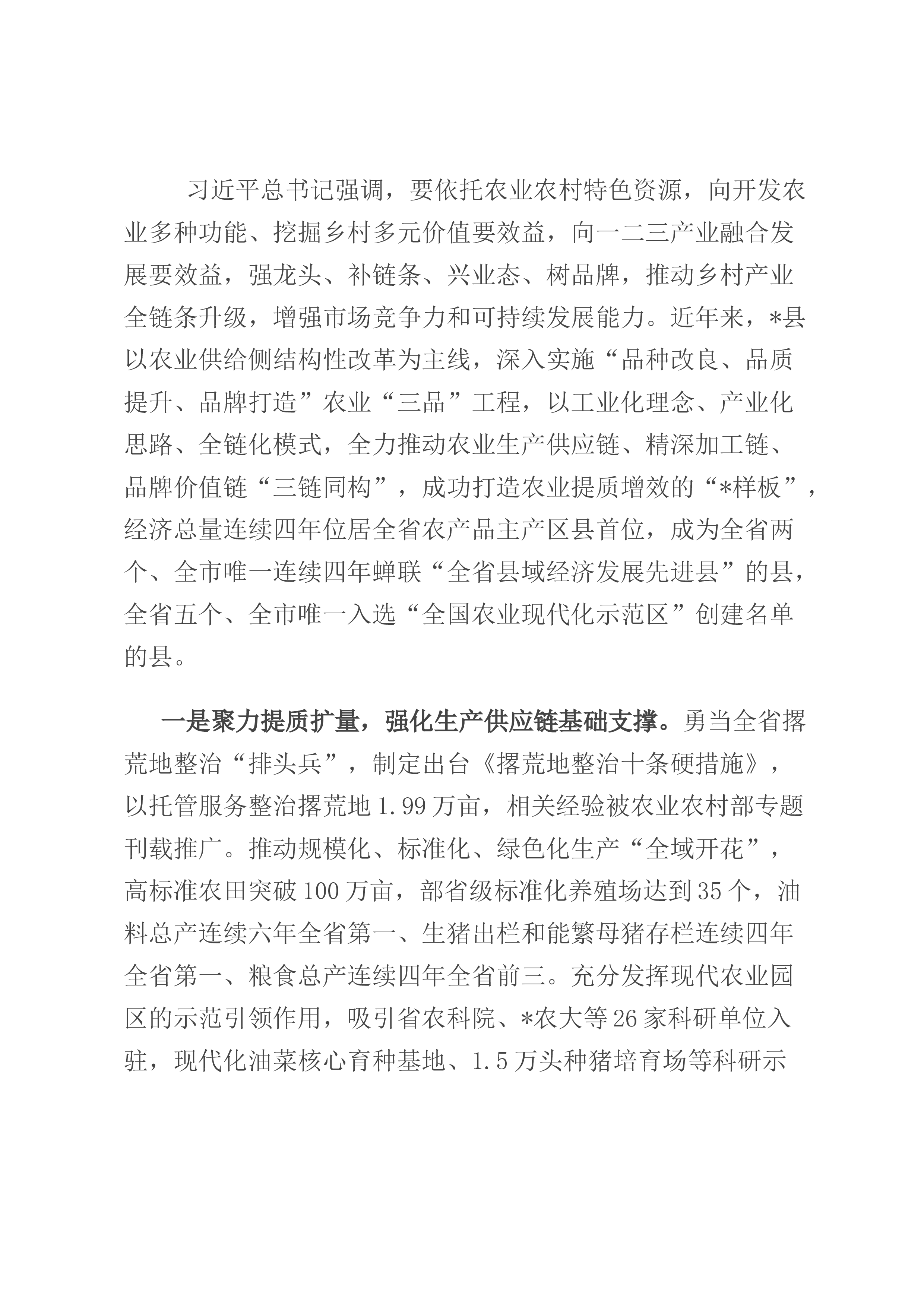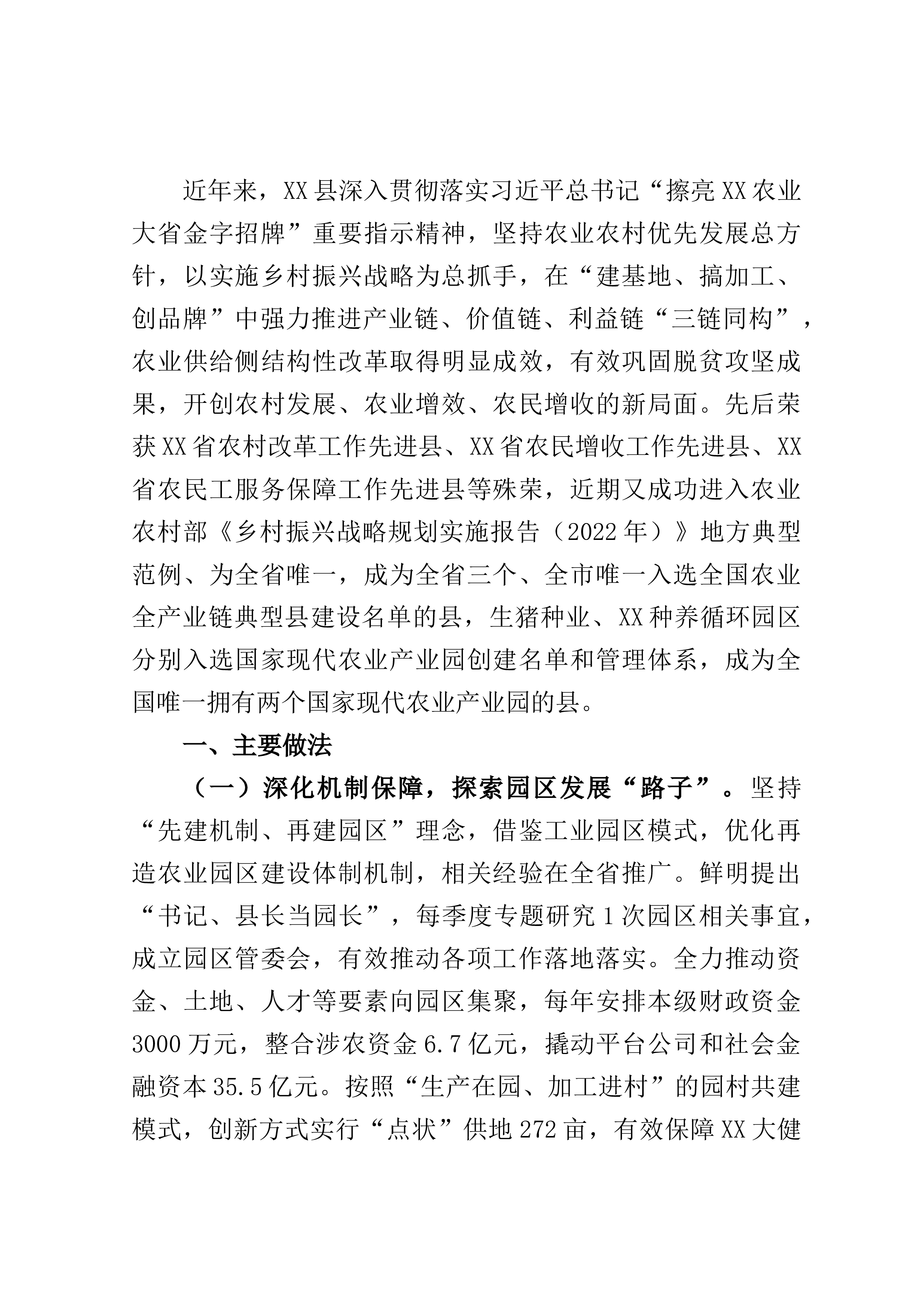 xxx镇党委认真学习贯彻习近平总书记关于加强基层治理的重要论述精神,坚持把党的领导贯穿乡村治理全过程各方面,对标对表、尽锐出战,坚持在健全完善体制机制上下功夫,在选优配强干部人才上出实招,在夯实农业农村根基上求突破,推动党建引领乡村治理高质推进、高效落实。2022年荣获全区乡村治理示范镇称号。赋能增效让乡村治理更具活力。突出统筹推进。构建党委牵头抓总、领导分片包干、干部包网格工作体系,建立“清单式”乡村治理模式,分村域分类别制定示范创建、提质增效、破题攻坚3个责任清单,配套产业发展、乡村建设、基层治理等9项破题任务,形成一体谋划、一体部署、一体落实工作格局。开设“xxx青年理论微讲堂”,自上而...