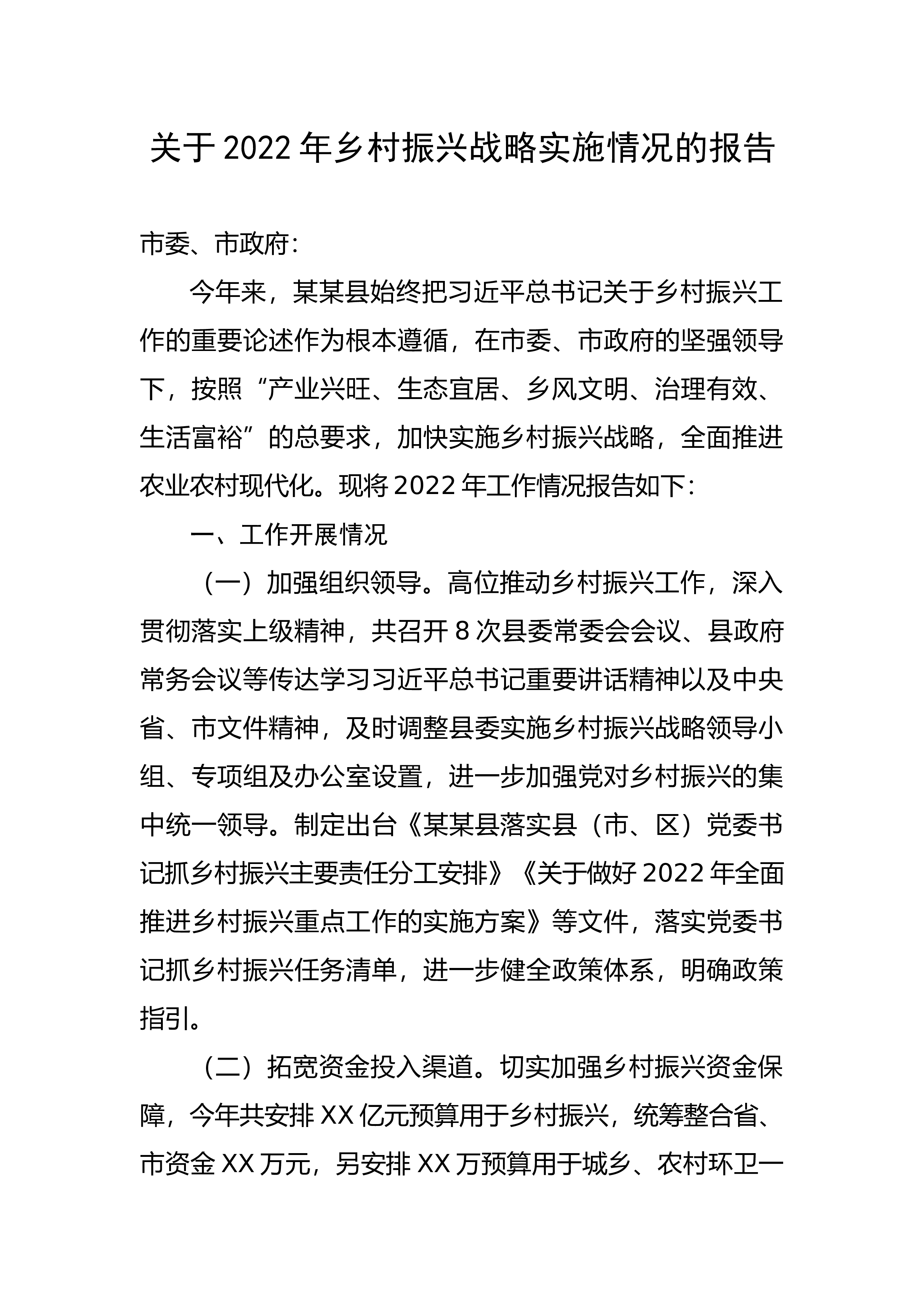 现代化。现将2022年工作情况报告如下:一、工作开展情况(一)加强组织领导。高位推动乡村振兴工作,深入贯彻落实上级精神,共召开8次县委常委会会议、县政府常务会议等传达学习习近平总书记重要讲话精神以及中央省、市文件精神,及时调整县委实施乡村振兴战略领导小组、专项组及办公室设置,进一步加强党对乡村振兴的集中统一领导。制定出台《某某县落实县(市、...