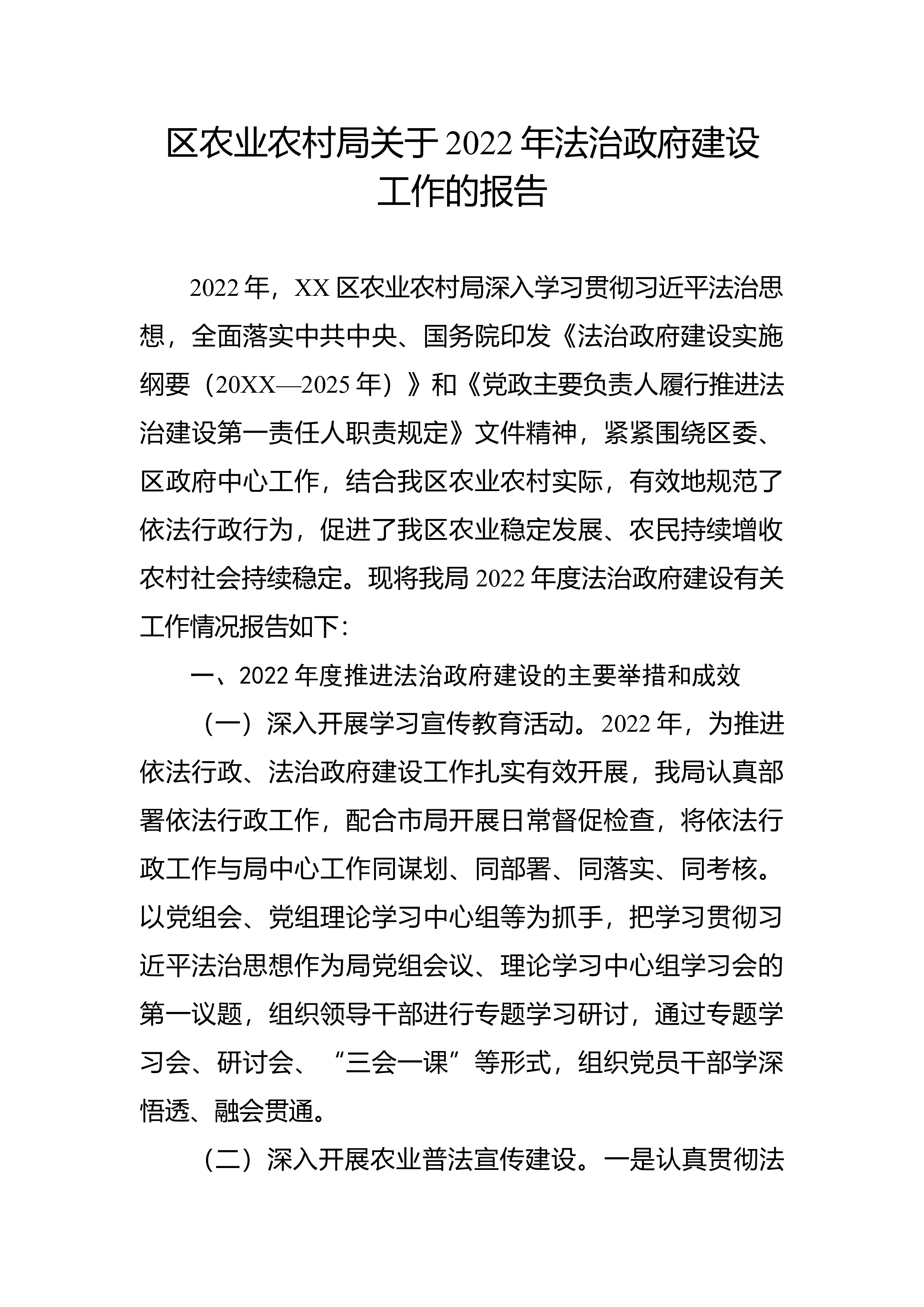 局关于2022年法治政府建设工作的报告2022年,XX区