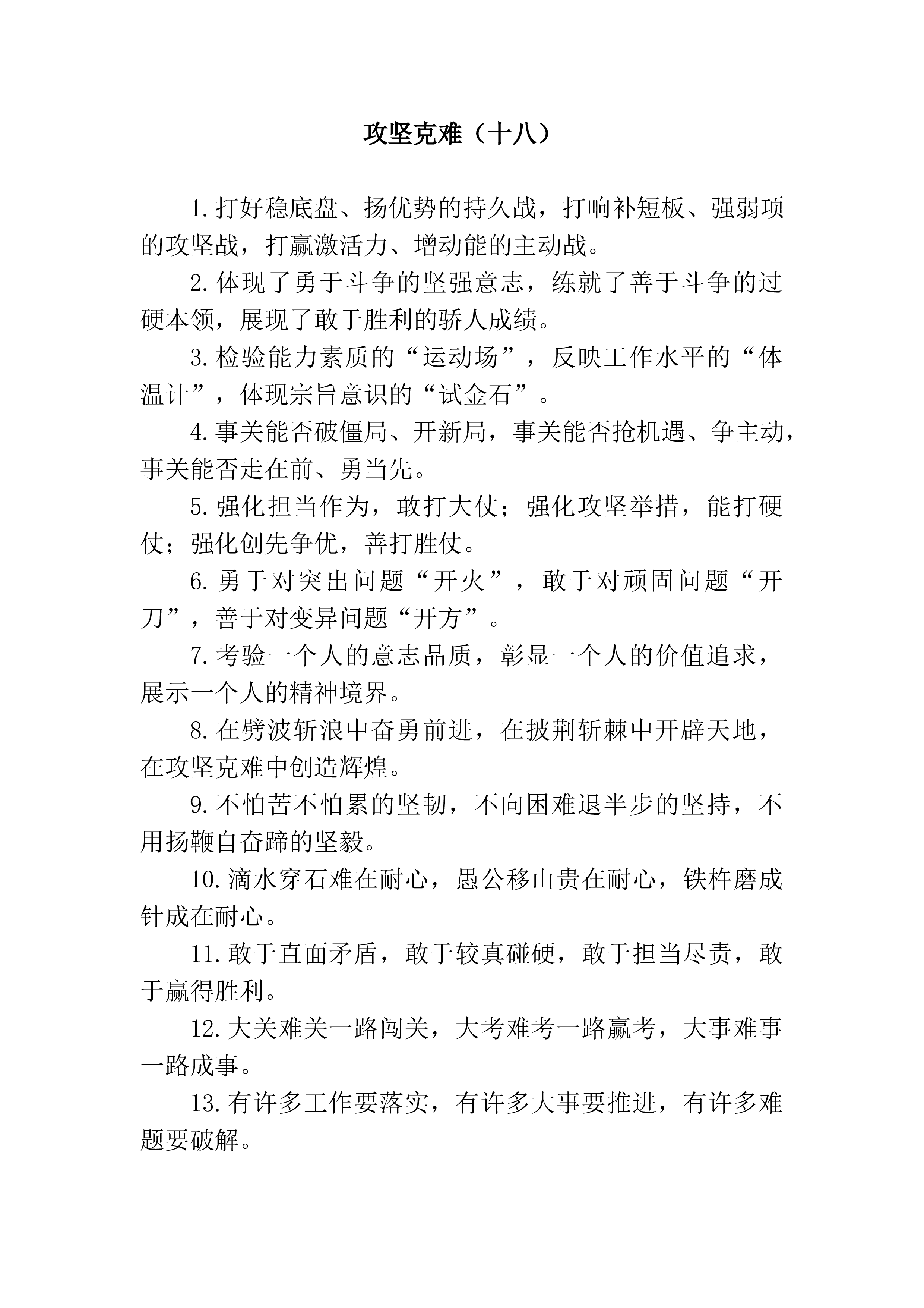 督查考核类排比句40例1.“面上推”和“点上抓”相结合,“强震慑”和“勤教育”相结合,“当下改”与“长久立”相结合,“内监督”与“外监督”相结合。2.在学习教育上持续用功,在查摆问题上持续发力,在整改落实上持续深化,在行动载体上持续强化,在破解难题上持续攻坚。3.以“入脑入心”的标准抓学习,以“刀刃向内”的决心查问题,以“一抓到底”的态度促整改。4.从考核中总结经验、坚定信心,从考核中找准问题、自我反省,从考核中认清形势、找准定位。5.在定量的指标上力争得满分,在定性的指标上努力进前列,在底线指标上不发生颠覆性错误。6.坚持统筹推进抓整改,坚持以上率下抓整改,坚持跟踪督办抓整改,坚持标本兼治抓...
