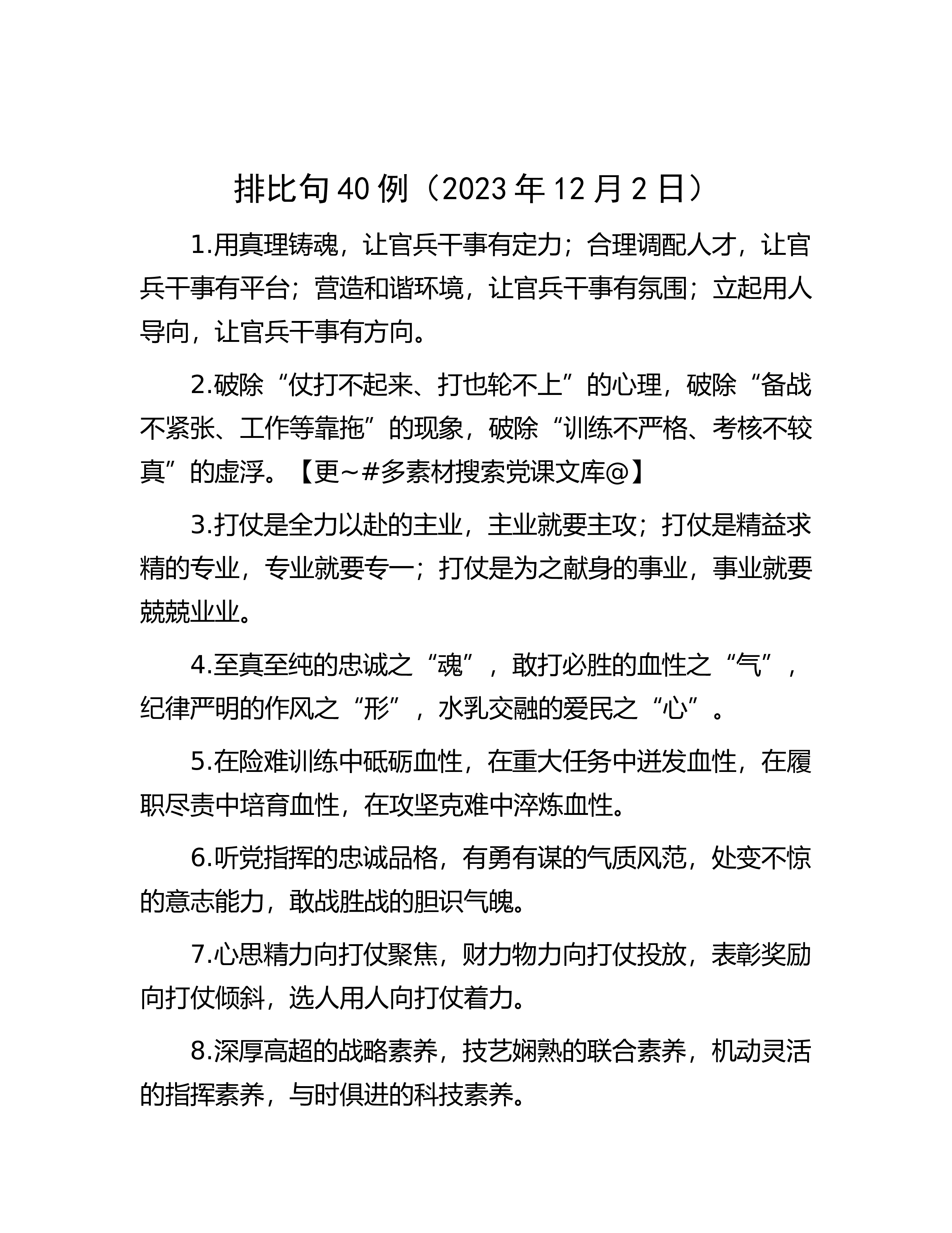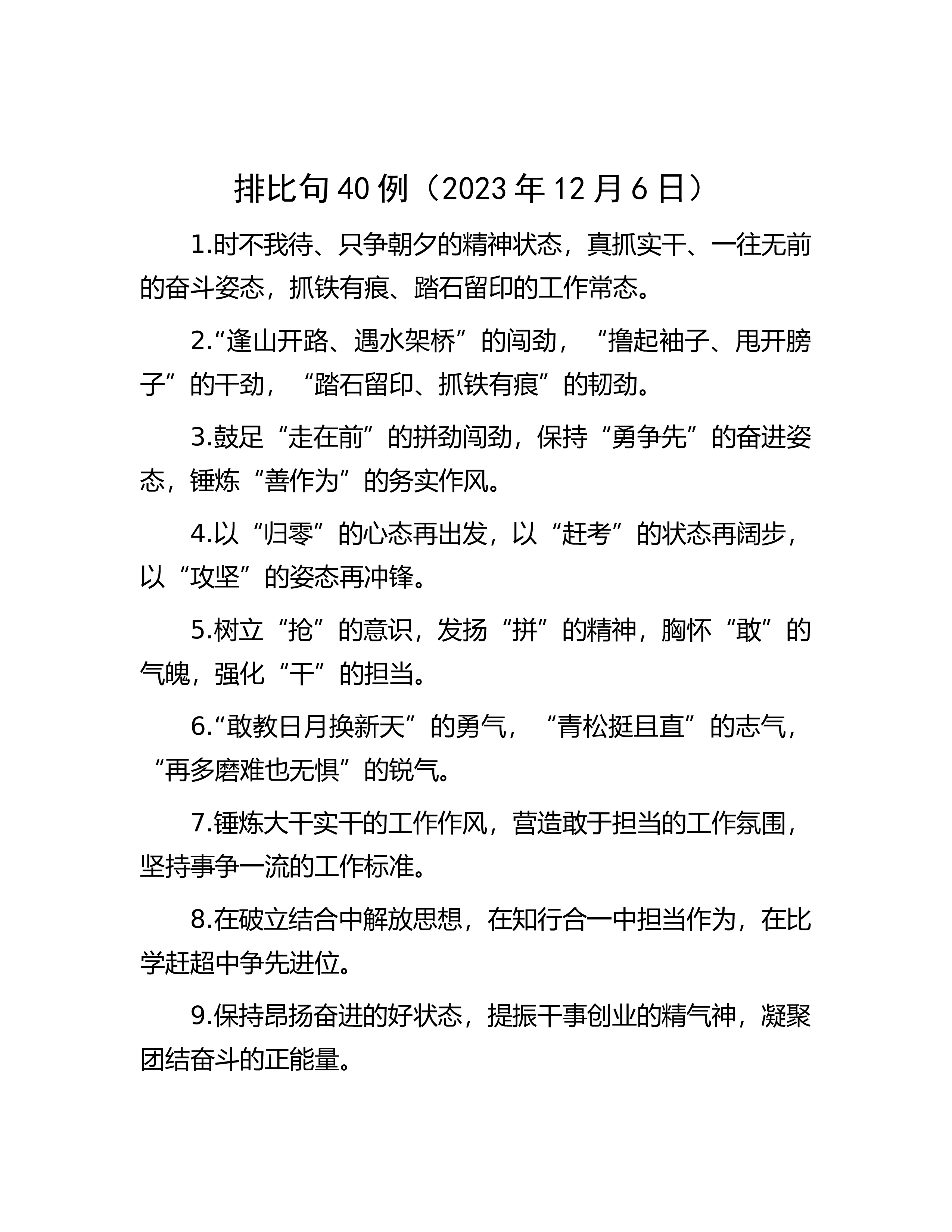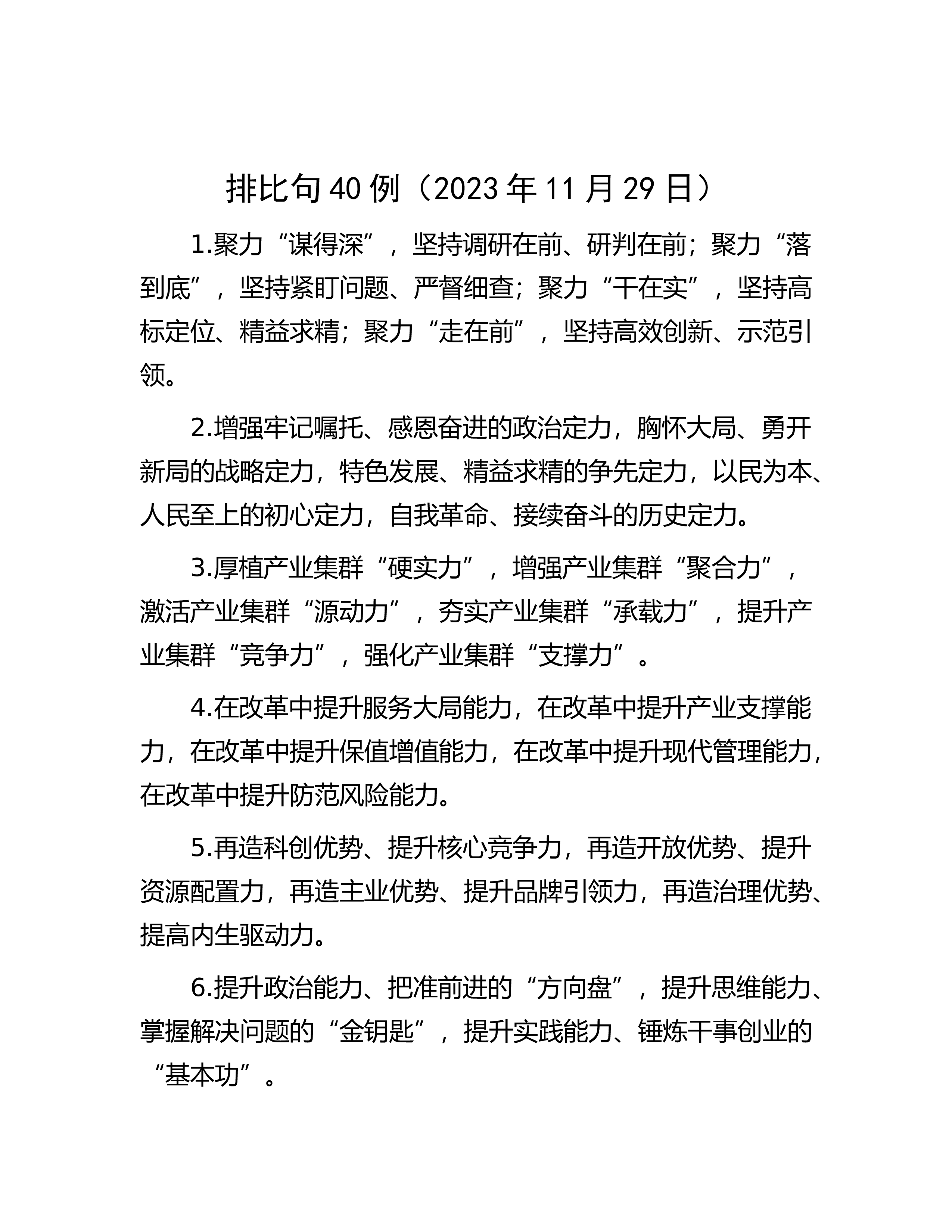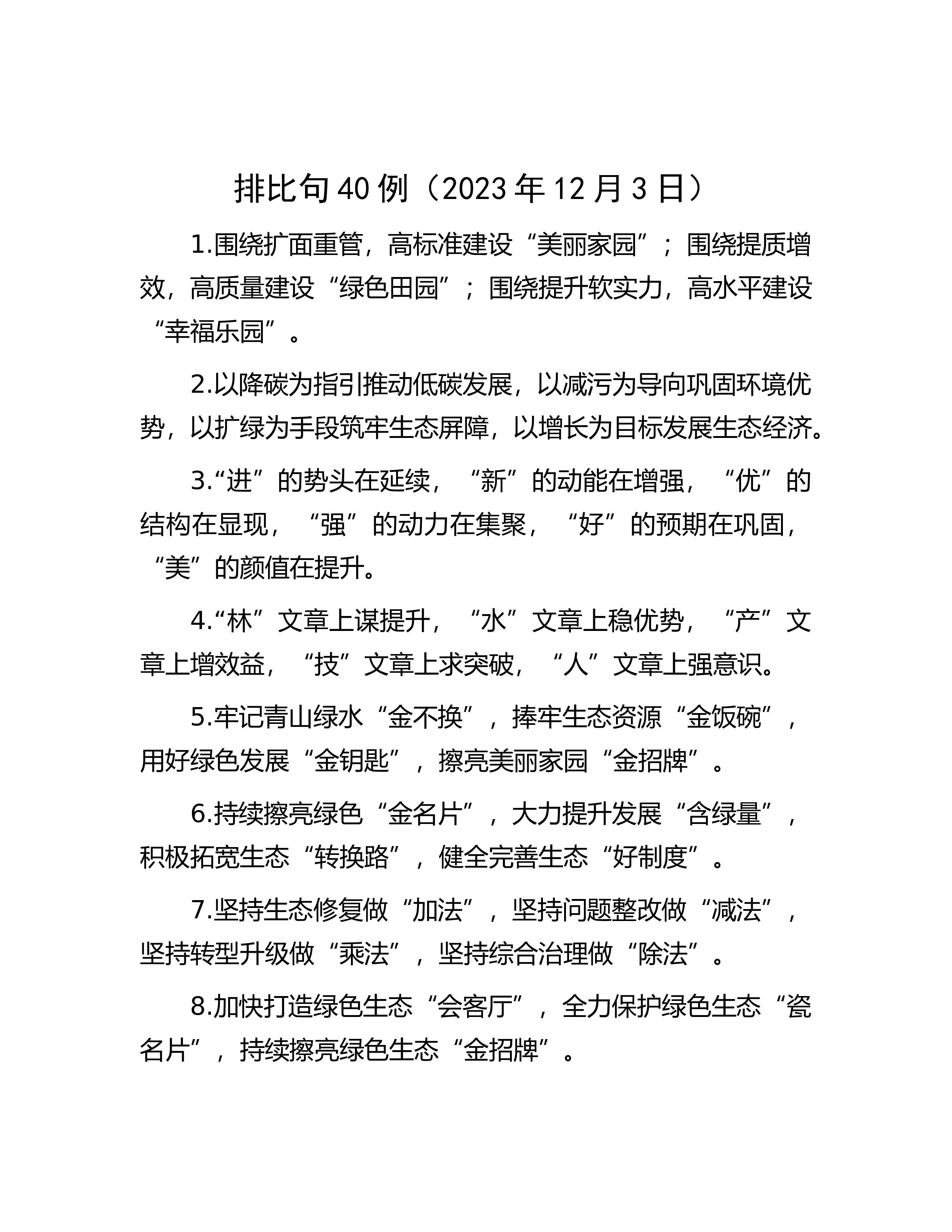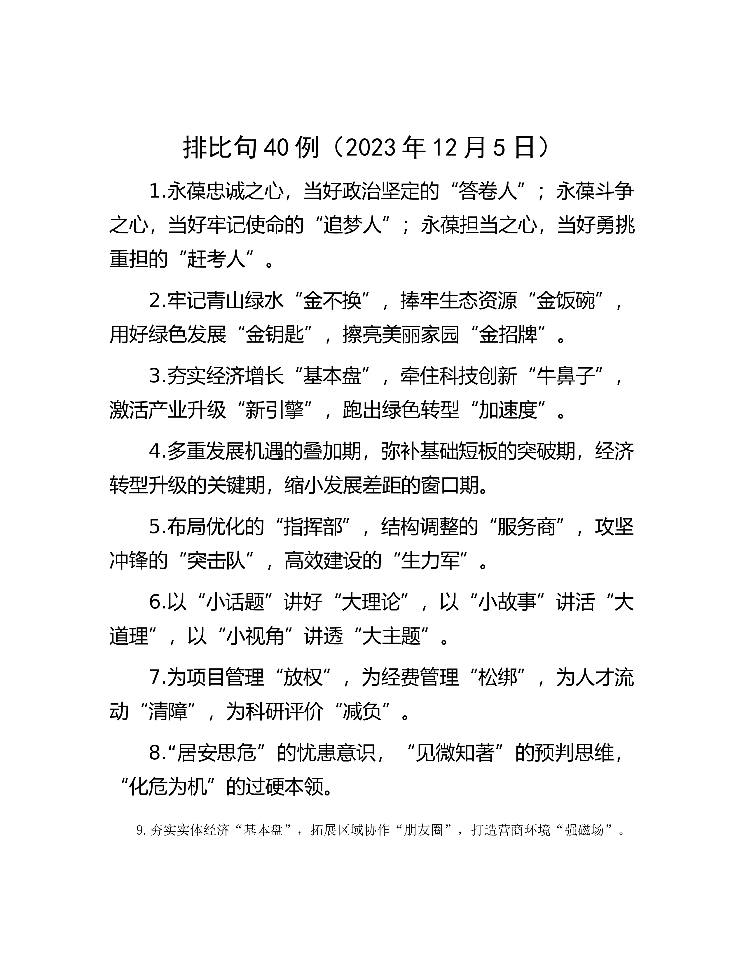 排比句40例(2023年12月7日)1.在经济发展中发挥了“护佑”作用,在民生保障中发挥了“卫士”作用,在风险防范中发挥了“尖兵”作用,在反腐倡廉中发挥了“利剑”作用。2.看发现的苗头有没有“死灰复燃”“春风吹又生”,看解决的问题是否“改头换面”“新瓶装老酒”,看开出的药方有没有“药到病除”“治病又救人”。3.锤炼党性、铸牢忠诚的有利契机,武装头脑、凝心铸魂的重要载体,破解难题、推动发展的有效实践,自我革命、纯洁队伍的有力举措。4.强化“当下改”,压实主体责任;拧紧“责任链”,加强日常监督;着眼“长久立”,深化系统治理。5.惩治腐败绝不是“办案了事”,筑牢堤坝绝不是“就腐治腐”,从严管党治吏绝...