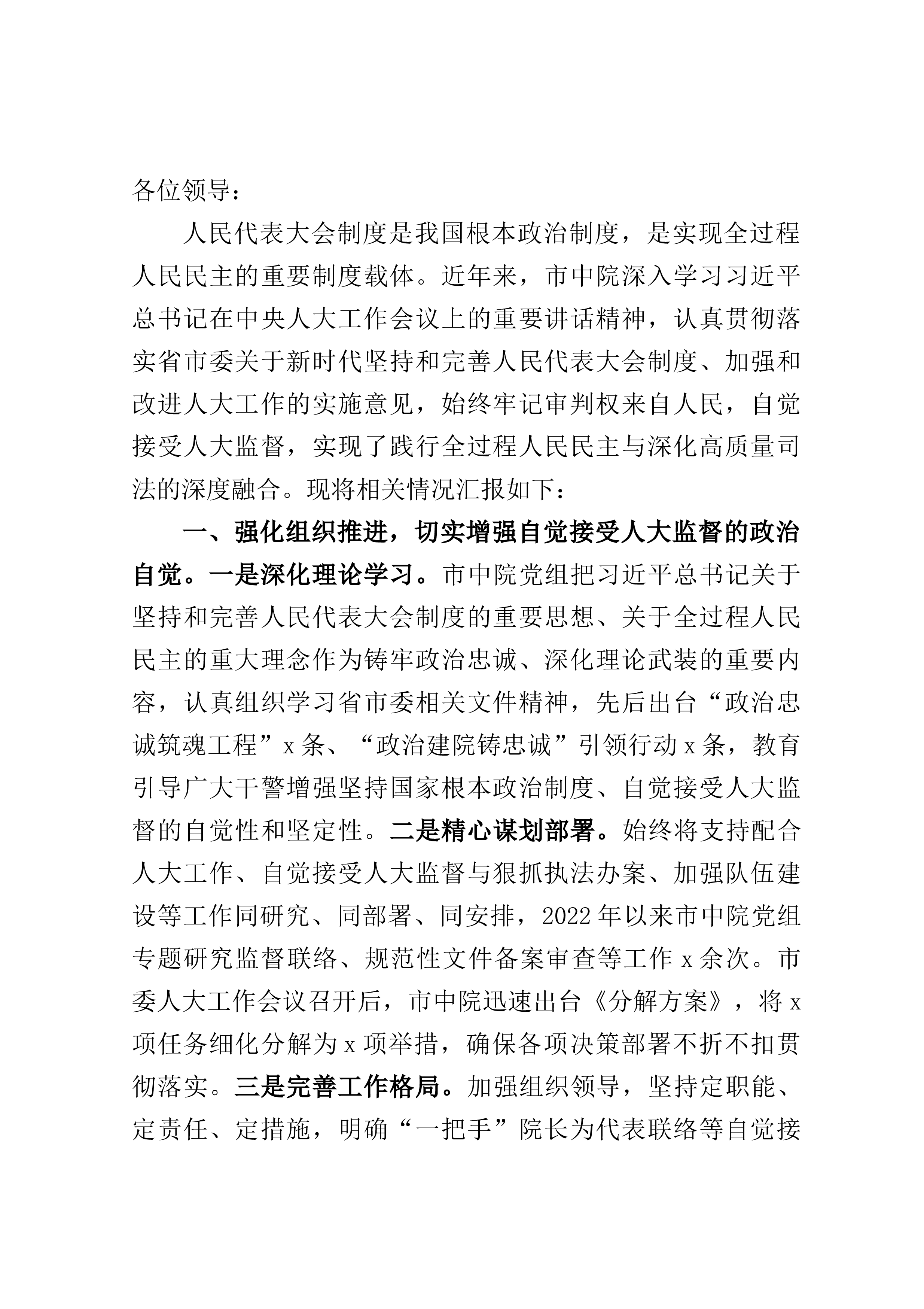 各位领导:人民代表大会制度是我国根本政治制度,是实现全过程人民民主的重要制度载体。近年来,市中院深入学习习近平总书记在中央人大工作会议上的重要讲话精神,认真贯彻落实省市委关于新时代坚持和完善人民代表大会制度、加强和改进人大工作的实施意见,始终牢记审判权来自人民,自觉接受人大监督,实现了践行全过程人民民主与深化高质量司法的深度融合。现将相关情况汇报如下:一、强化组织推进,切实增强自觉接受人大监督的政治自觉。一是深化理论学习。市中院党组把习近平总书记关于坚持和完善人民代表大会制度的重要思想、关于全过程人民民主的重大理念作为铸牢政治忠诚、深化理论武装的重要内容,认真组织学习省市委相关文件精神,先后出...