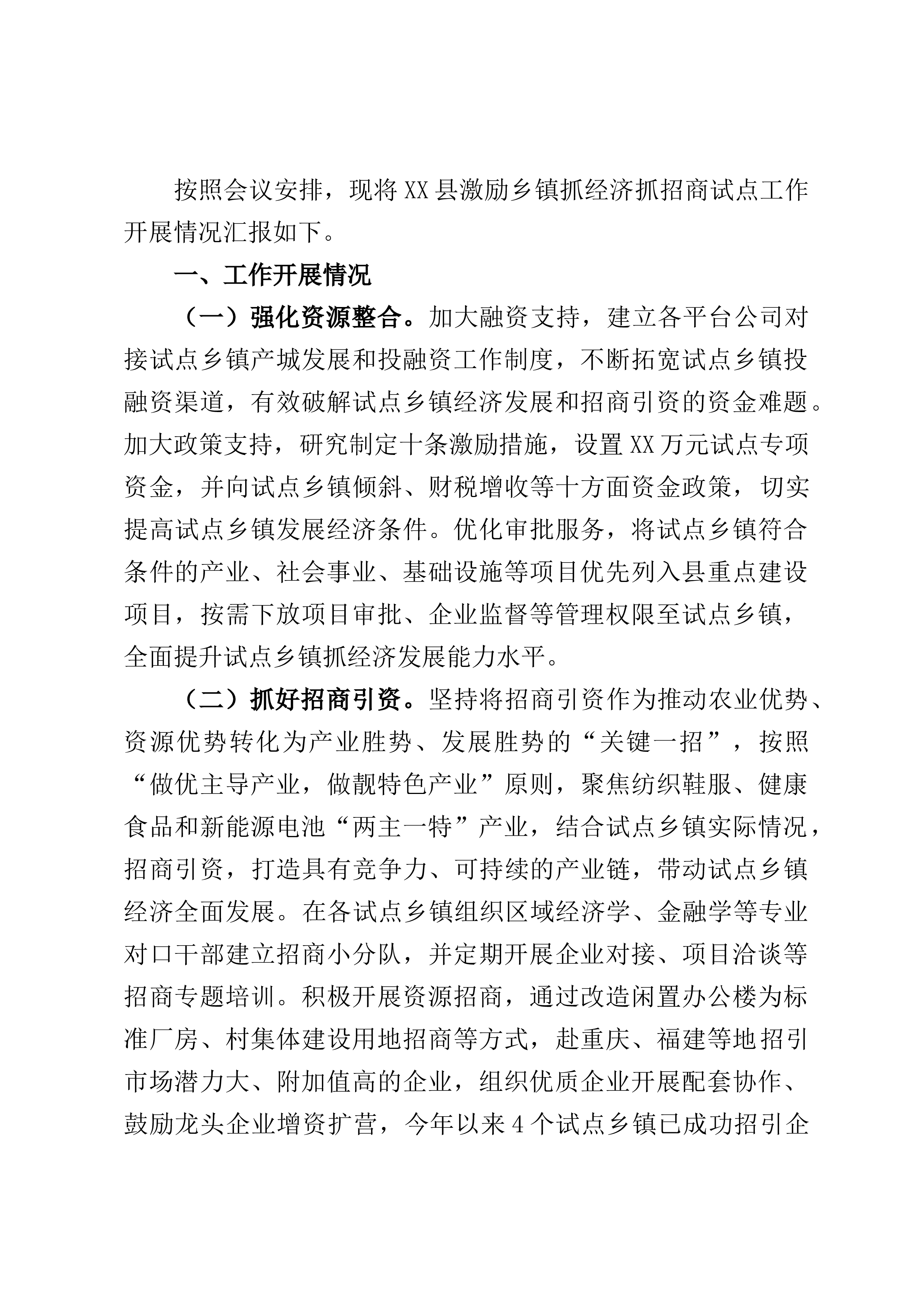 按照会议安排,现将XX县激励乡镇抓经济抓招商试点工作开展情况汇报如下。一、工作开展情况(一)强化资源整合。加大融资支持,建立各平台公司对接试点乡镇产城发展和投融资工作制度,不断拓宽试点乡镇投融资渠道,有效破解试点乡镇经济发展和招商引资的资金难题。加大政策支持,研究制定十条激励措施,设置XX万元试点专项资金,并向试点乡镇倾斜、财税增收等十方面资金政策,切实提高试点乡镇发展经济条件。优化审批服务,将试点乡镇符合条件的产业、社会事业、基础设施等项目优先列入县重点建设项目,按需下放项目审批、企业监督等管理权限至试点乡镇,全面提升试点乡镇抓经济发展能力水平。(二)抓好招商引资。坚持将招商引资作为推动农业...