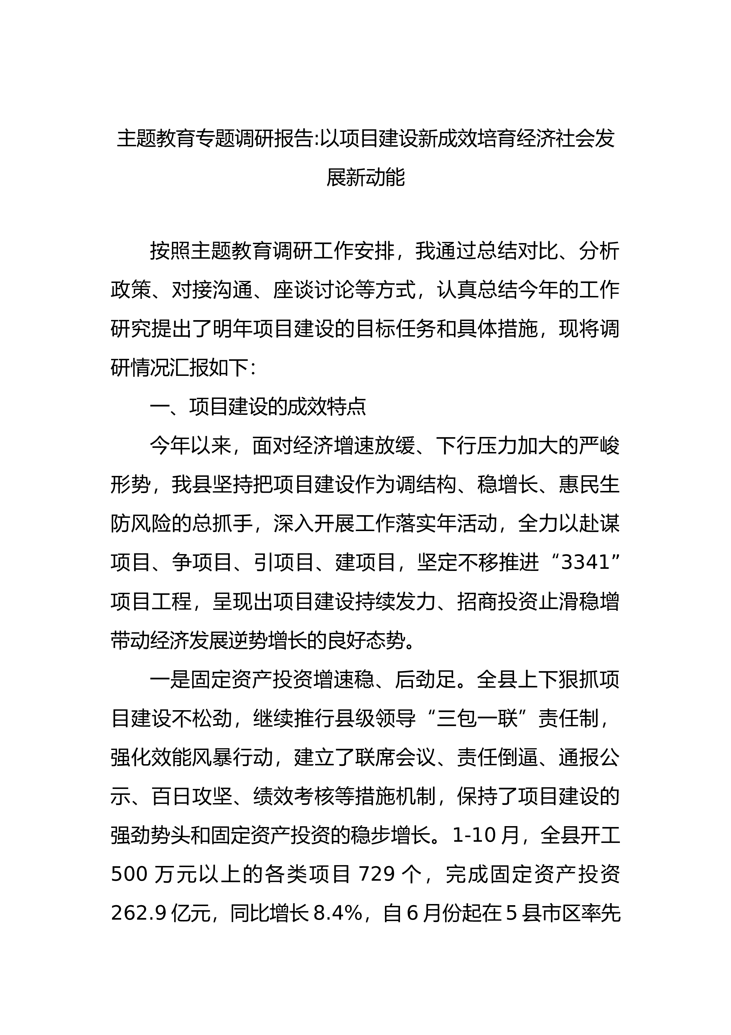 主T教育专题调研报告:以项目建设新成效培育经济社会发展新动能按照主T教育调研工作安排,我通过总结对比、分析政策、对接沟通、座谈讨论等方式,认真总结今年的工作研究提出了明年项目建设的目标任务和具体措施,现将调研情况汇报如下:一、项目建设的成效特点今年以来,面对经济增速放缓、下行压力加大的严峻形势,我县坚持把项目建设作为调结构、稳增长、惠民生防风险的总抓手,深入开展工作落实年活动,全力以赴谋项目、争项目、引项目、建项目,坚定不移推进“3341”项目工程,呈现出项目建设持续发力、招商投资止滑稳增带动经济发展逆势增长的良好态势。一是固定资产投资增速稳、后劲足。全县上下狠抓项目建设不松劲,继续推行县级领...