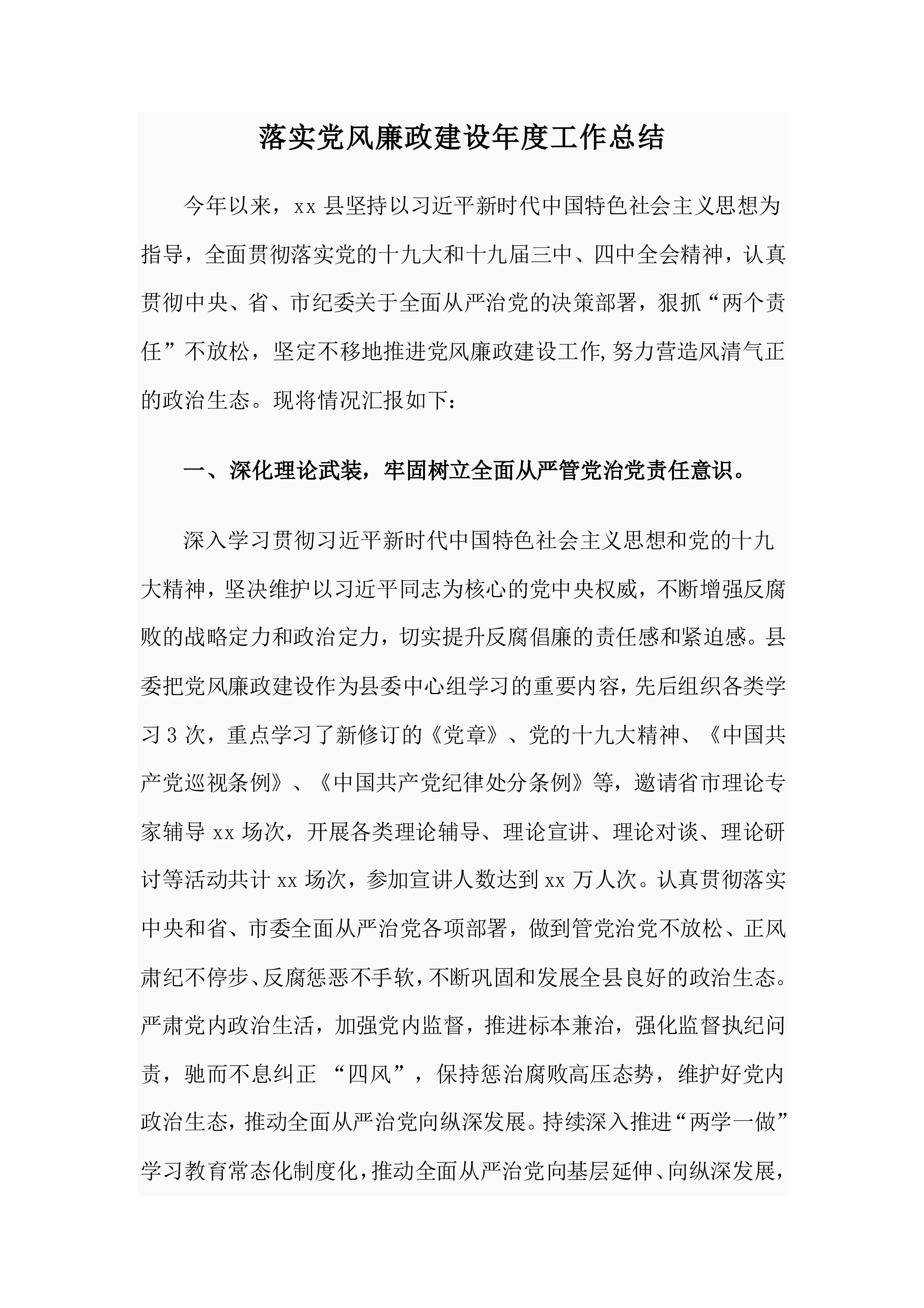 关于贯彻落实党风廉政建设主体责任的实施意见为认真贯彻落实省市县委对党风廉政建设的决策部署,全面落实县政府党风廉政建设主体责任,根据县委《关于落实党风廉政建设主体责任的意见》,结合县政府工作实际,现提出如下实施意见。一、指导思想坚持以习近平新时代中国特色社会主义思想为指导,全面贯彻党的十九大、十九届历次全会和中央、省、市、县纪委全会精神,自觉捍卫“两个确立”,增强“四个意识”,坚定“四个自信”,做到“两个维护”,坚持党要管党、从严治党方针,坚持一手抓发展、一手抓廉政总体思路,坚持“五个从严、五个过硬”具体要求,把落实政府主体责任作为重要战略举措,以厘清责任为基本前提,以健全制度为根本保障,以责任...