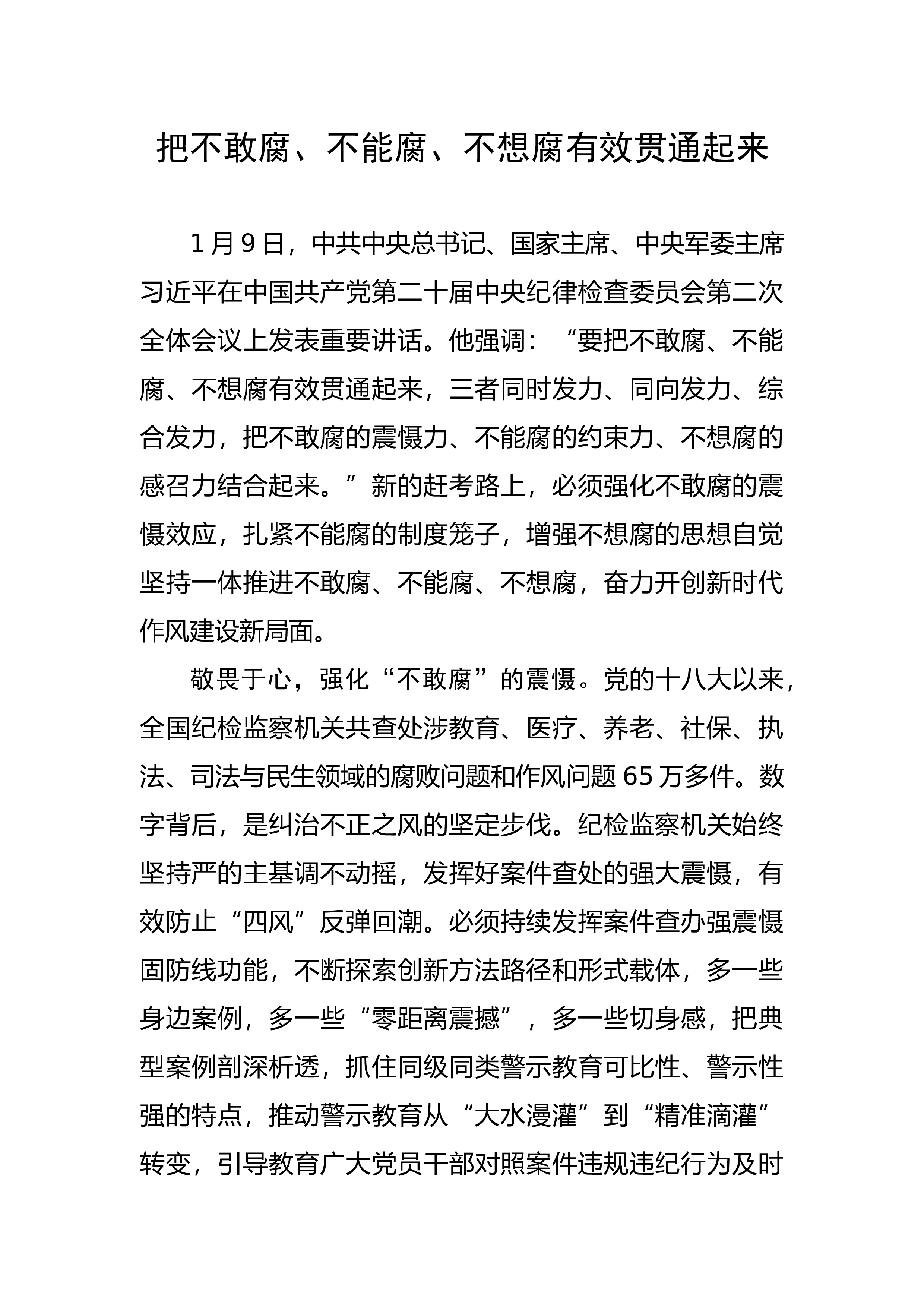 把不敢腐、不能腐、不想腐有效贯通起来1月9日,中共中央总书记、国家主席、中央军委主席习近平在中国共产党第二十届中央纪律检查委员会第二次