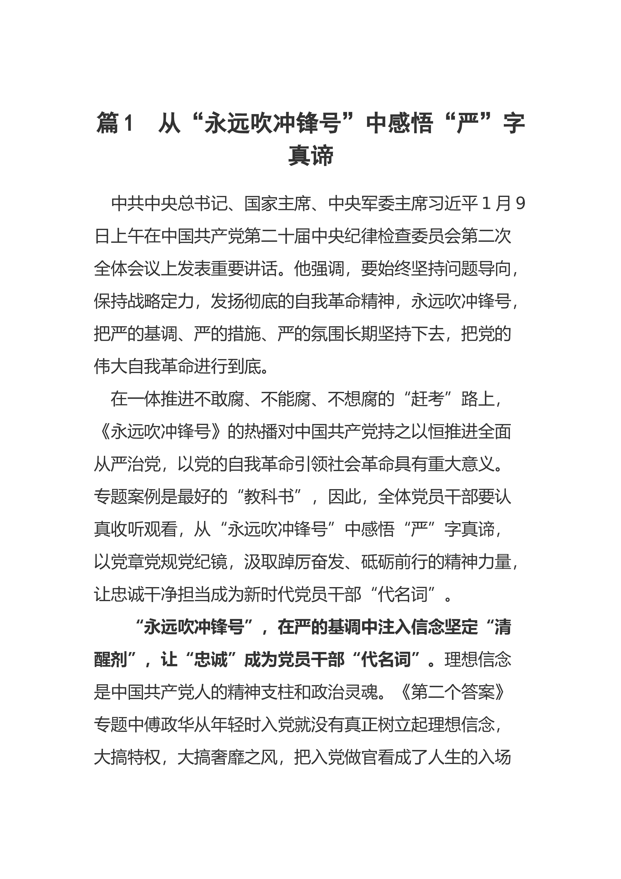 篇1从“永远吹冲锋号”中感悟“严”字真谛 中共中央总书记、国家主席、中央军委主席习近平1月9日上午在中国共产党第二十届中央纪律检查委员会第二次