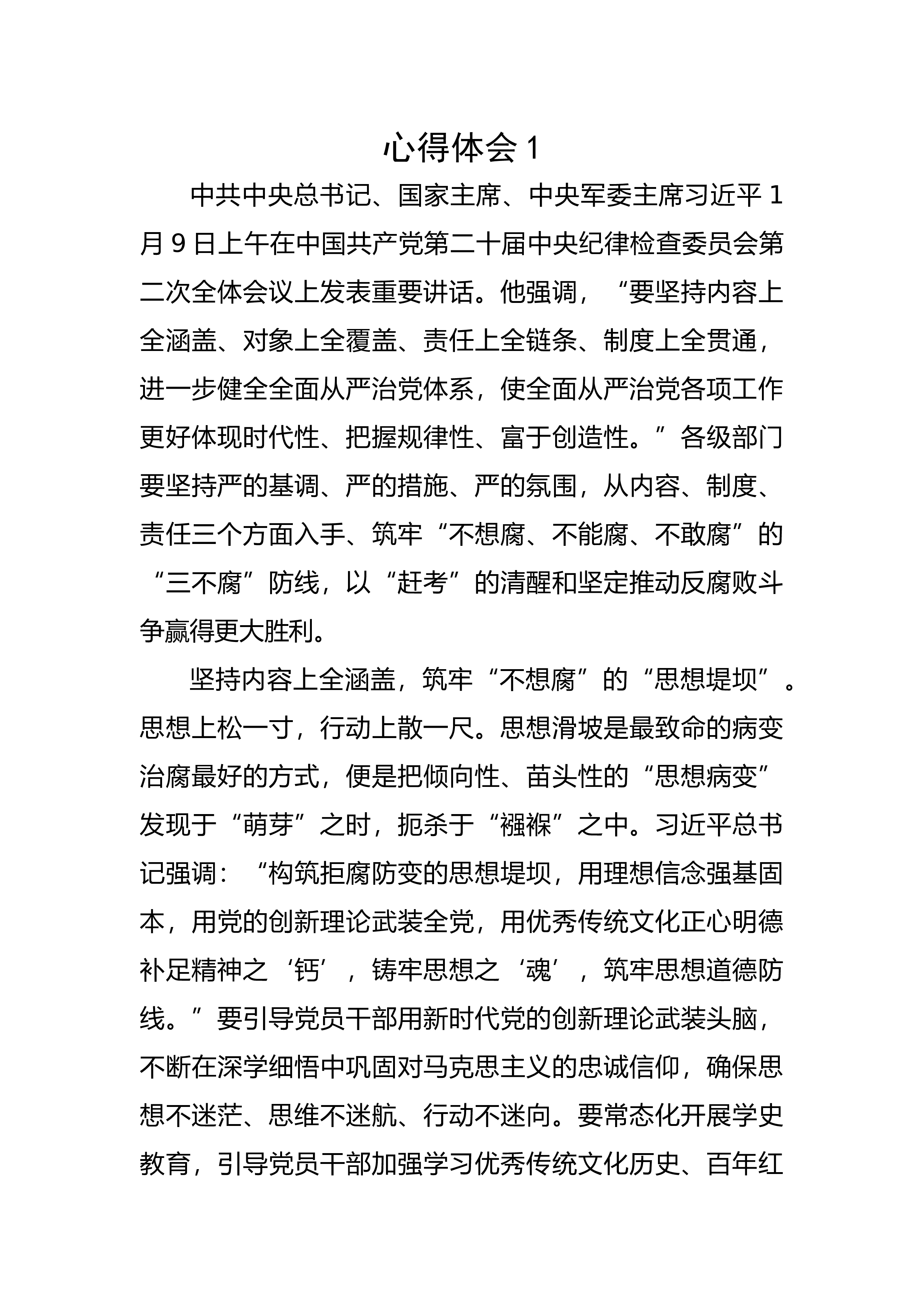 心得体会1中共中央总书记、国家主席、中央军委主席习近平1月9日上午在中国共产党第二十届中央纪律检查委员会第二次全体会议上发表重要讲话。他强调,“要坚持内容上全涵盖、对象上全覆盖、责任上全链条、制度上全贯通,进一步健全全面从严治党体系,使全面从严治党各项工作更好体现时代性、把握规律性、富于创造性。”各级部门要坚持严的基调、严的措施、严的氛围,从内容、制度、责任三个方面入手、筑牢“不想腐、不能腐、不敢腐”的“三不腐”防线,以“赶考”的清醒和坚定推动反腐败斗争赢得更大胜利。坚持内容上全涵盖,筑牢“不想腐”的“思想堤坝”。思想上松一寸,行动上散一尺。思想滑坡是最致命的病变治腐最好的方式,便是把倾向性、...