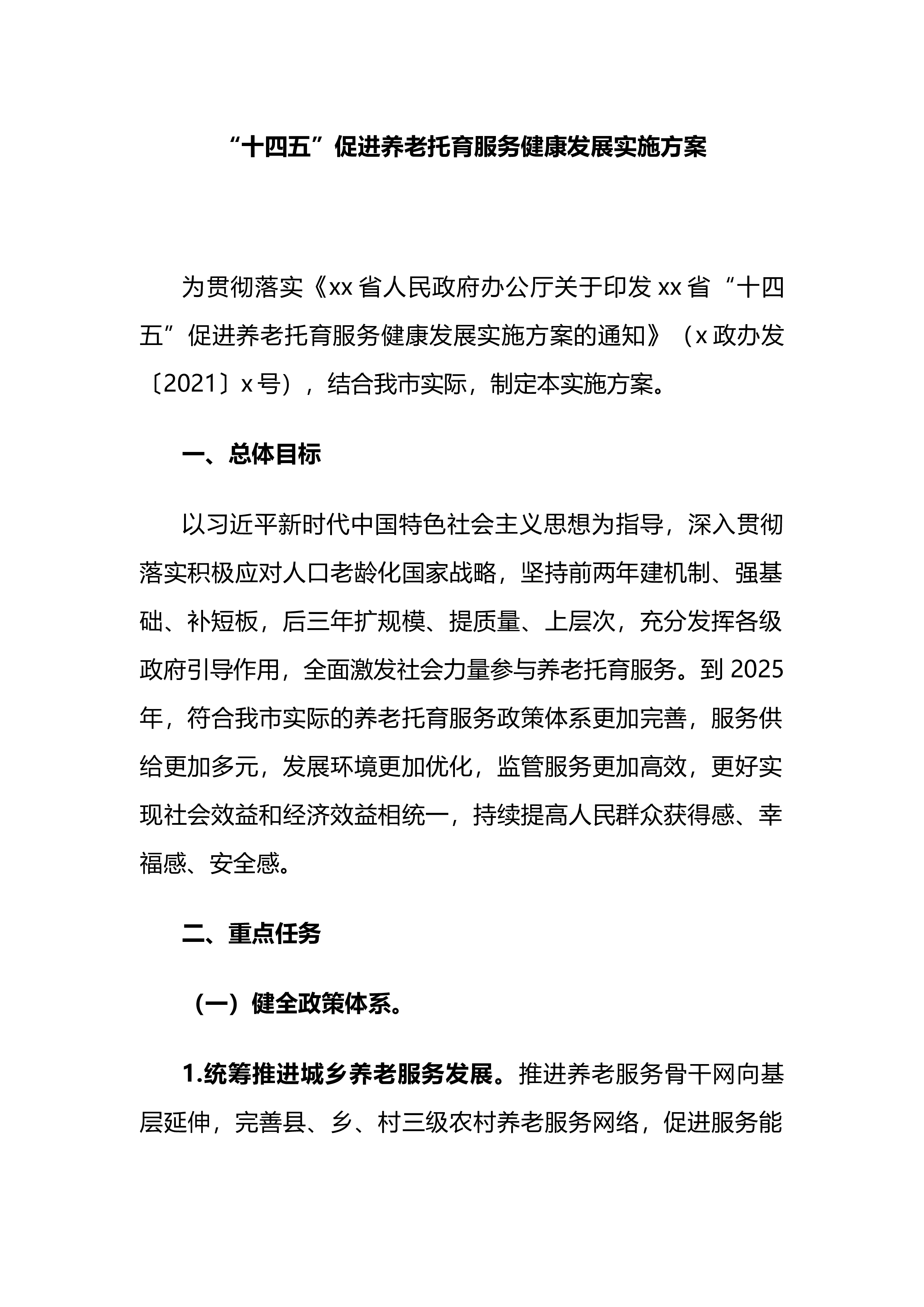 “十四五”促进养老托育服务健康发展实施方案为贯彻落实《xx省人民政府办公厅关于印发xx省“十四五”促进养老托育服务健康发展实施方案的通知》(x政办发〔2021〕x号),结合我市实际,制定本实施方案。一、总体目标以习近平新时代中国特色社会主义思想为指导,深入贯彻落实积极应对人口老龄化国家战略,坚持前两年建机制、强基础、补短板,后三年扩规模、提质量、上层次,充分发挥各级政府引导作用,全面激发社会力量参与养老托育服务。到2025年,符合我市实际的养老托育服务政策体系更加完善,服务供给更加多元,发展环境更加优化,监管服务更加高效,更好实现社会效益和经济效益相统一,持续提高人民群众获得感、幸福感、安全感...
