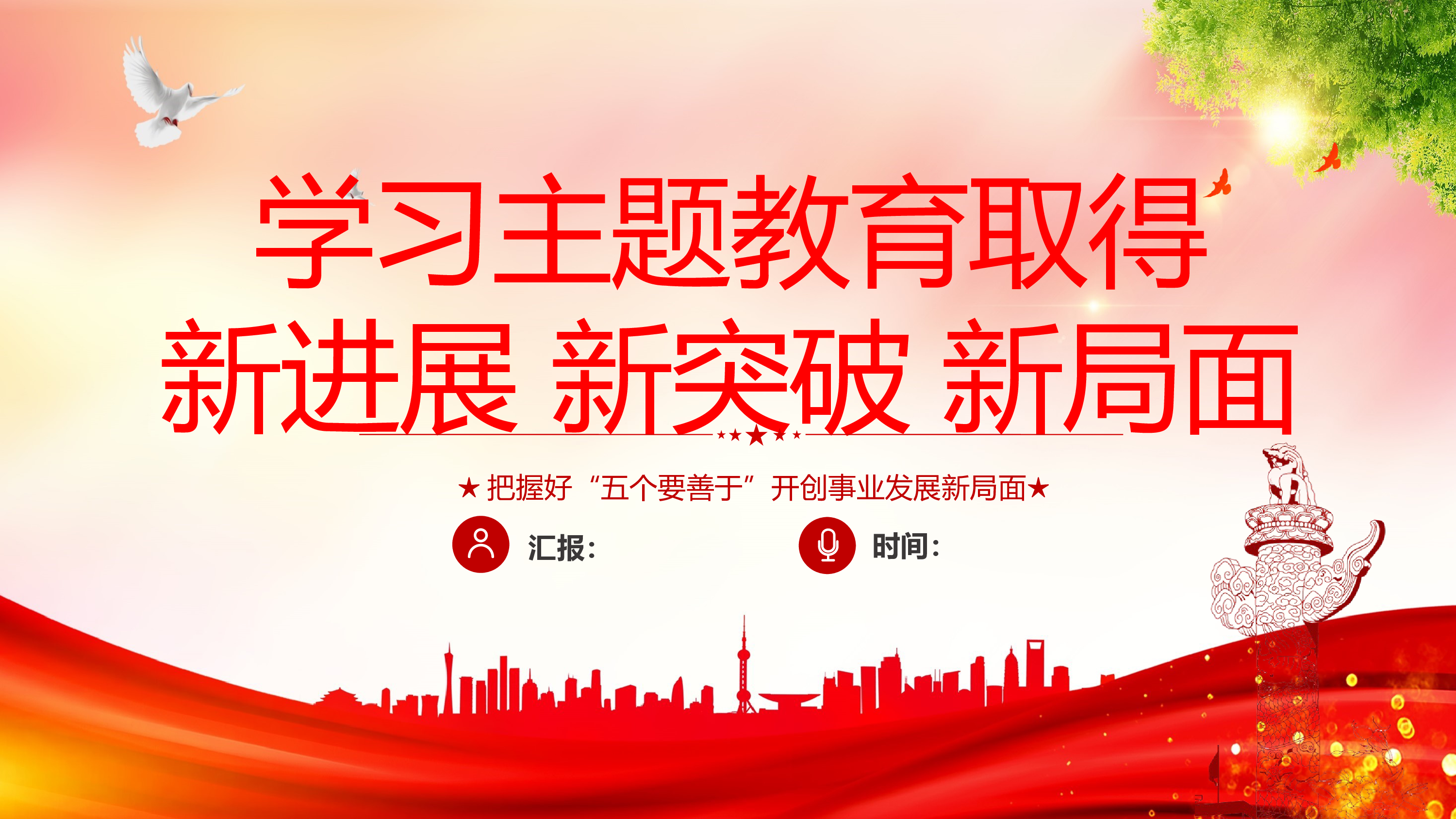 学习主T教育取得新进展新突破新局面★把握好“五个要善于”开创事业发展新局面★汇报:时间:前言导读/PREFACE以县处级以上领导干部为重点在全党深入开展学习贯彻习近平新时代中国特色社会主义思想主T教育,是贯彻落实党的二十大精神的重大举措,对于统一全党思想、解决党内存在的突出问题、始终保持党同人民群众血肉联系、推动党和国家事业发展,具有重要意义。2023年3月30日,二十届中共中央政治局就学习贯彻习近平新时代中国特色社会主义思想进行第四次集体学习,习近平总书记在主持学习时强调:“要善于运用新时代中国特色社会主义思想观察时代、把握时代、引领时代”,“要善于运用这一思想推进中国式现代化取得新进展、新...
