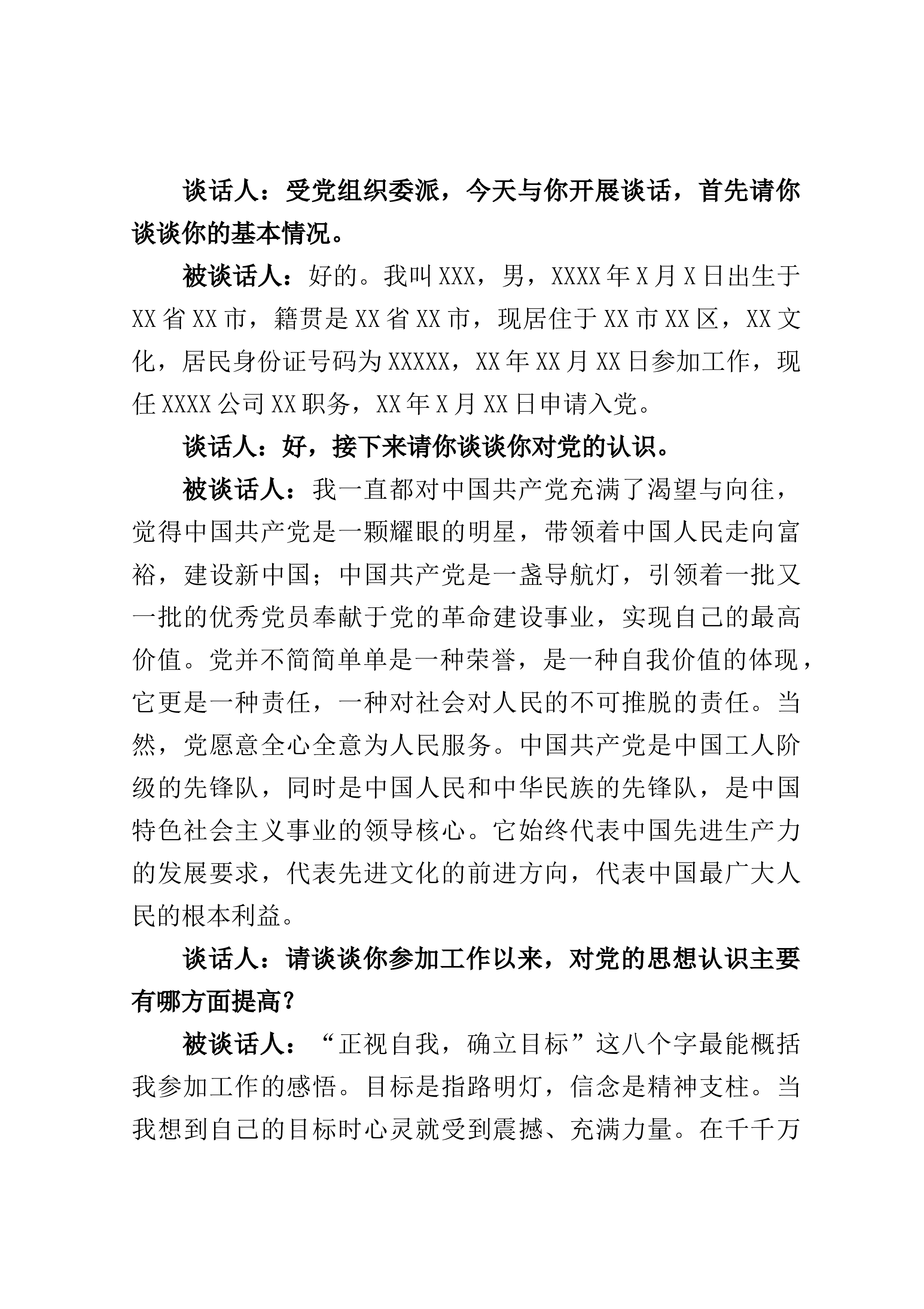 。谈话人:好,接下来请你谈谈你对党的认识。被谈话人:我一直都对中国共产党充满了渴望与向往,觉得中国共产党是一颗耀眼的明星,带领着中国人民走向富裕,建设新中国;中国共产党是一盏导航灯,引领着一批又一批的优秀党员奉献于党的革命建设事业,实现自己的最高价值。党并不简简单单是一种荣誉,是一种自我价值的体现,它更是...