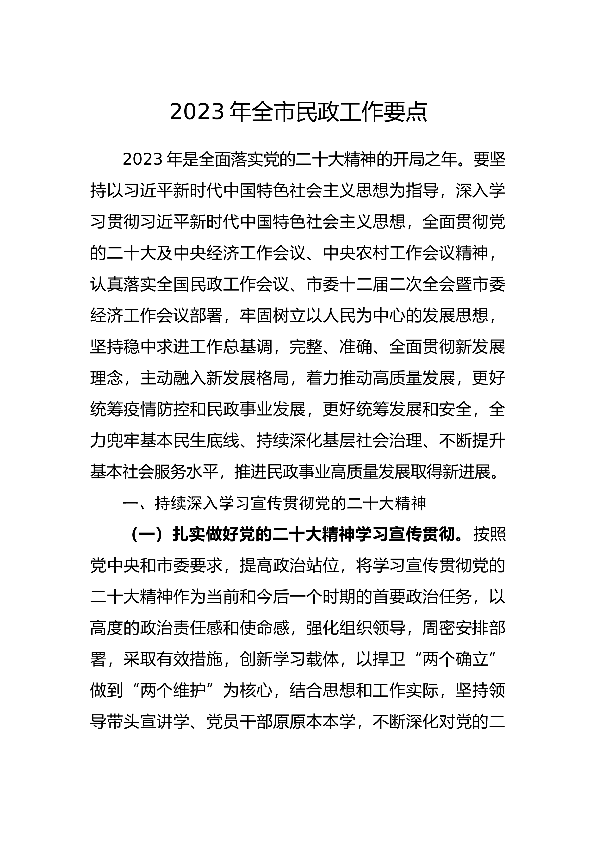2023年全市民政工作要点2023年是全面落实党的二十大精神的开局之年。要坚持以习近平新时代中国特色社会主义思想为指导,深入学习贯彻习近平新时代中国特色社会主义思想,全面贯彻党的二十大及中央经济工作会议、中央农村工作会议精神,认真落实全国民政工作会议、市委十二届二次全会暨市委经济工作会议部署,牢固树立以人民为中心的发展思想,坚持稳中求进工作总基调,完整、准确、全面贯彻新发展理念,主动融入新发展格局,着力推动高质量发展,更好统筹疫情防控和民政事业发展,更好统筹发展和安全,全力兜牢基本民生底线、持续深化基层