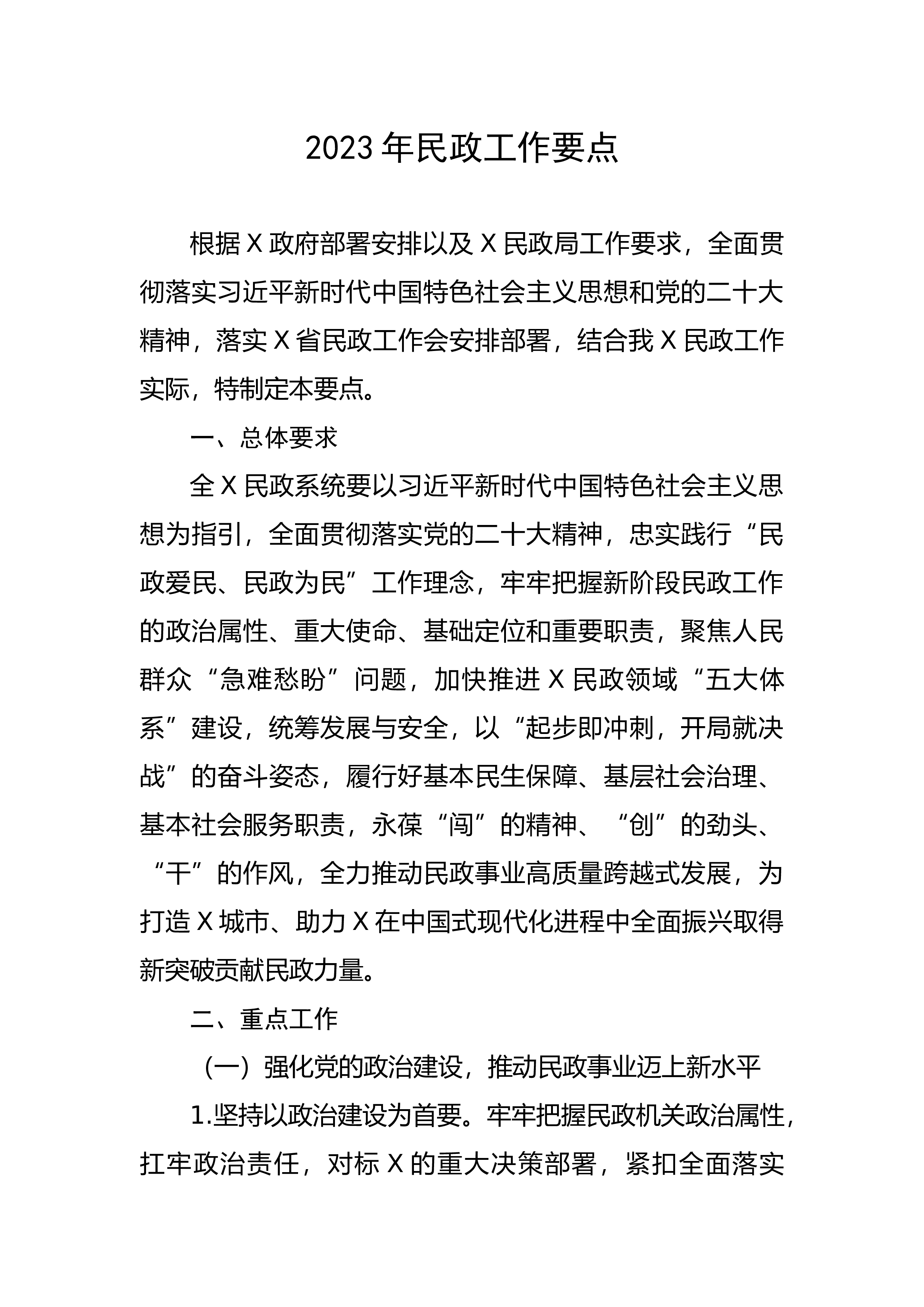 2023年民政工作要点根据X政府部署安排以及X民政局工作要求,全面贯彻落实习近平新时代中国特色社会主义思想和党的二十大精神,落实X省民政工作会安排部署,结合我X民政工作实际,特制定本要点。一、总体要求全X民政系统要以习近平新时代中国特色社会主义思想为指引,全面贯彻落实党的二十大精神,忠实践行“民政爱民、民政为民”工作理念,牢牢把握新阶段民政工作的政治属性、重大使命、基础定位和重要职责,聚焦人民群众“急难愁盼”问题,加快推进X民政领域“五大体系”建设,统筹发展与安全,以“起步即冲刺,开局就决战”的奋斗姿态,履行好基本民生保障、基层