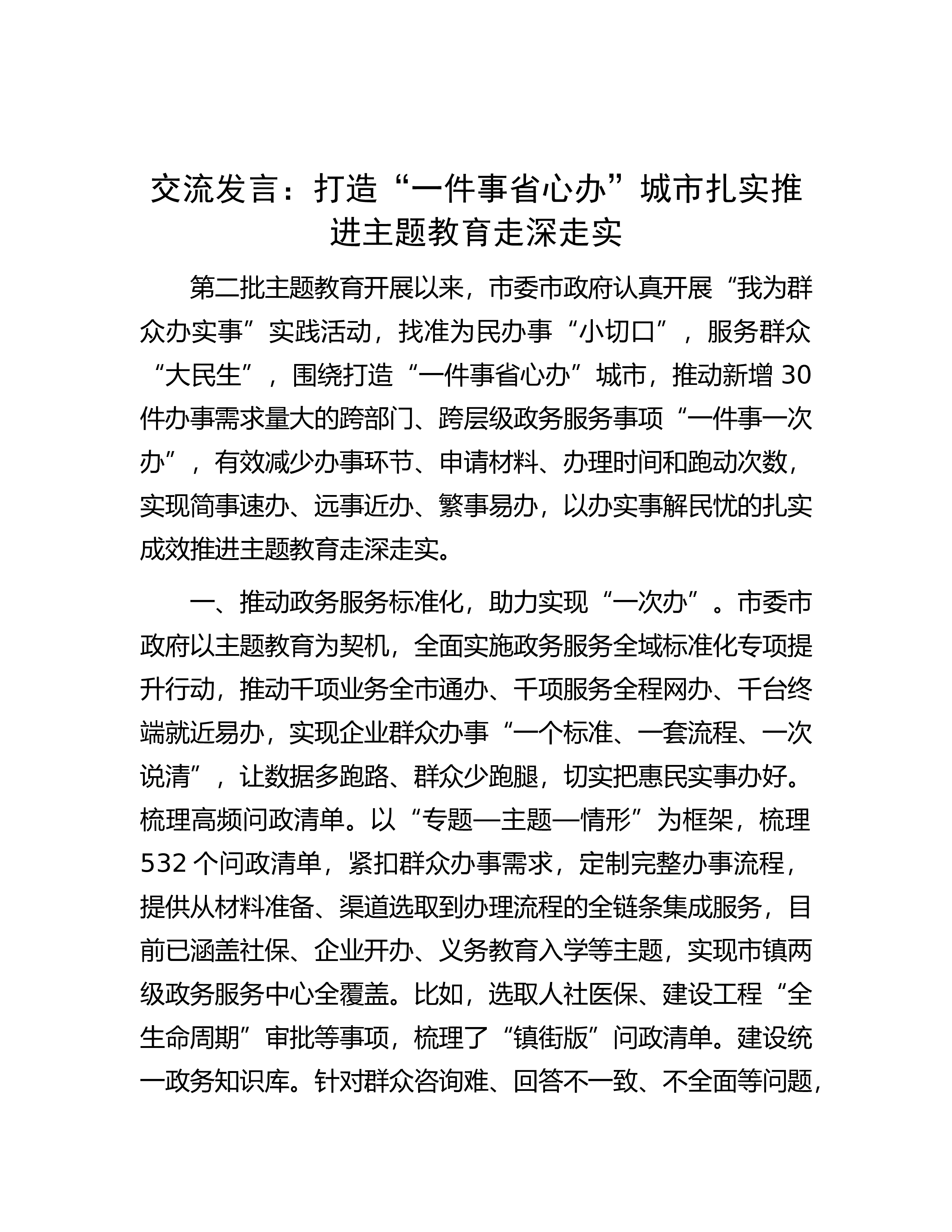 交流发言:打造“一件事省心办”城市扎实推进主T教育走深走实第二批主T教育开展以来,市委市政府认真开展“我为群众办实事”实践活动,找准为民办事“小切口”,服务群众“大民生”,围绕打造“一件事省心办”城市,推动新增30件办事需求量大的跨部门、跨层级政务服务事项“一件事一次办”,有效减少办事环节、申请材料、办理时间和跑动次数,实现简事速办、远事近办、繁事易办,以办实事解民忧的扎实成效推进主T教育走深走实。一、推动政务服务标准化,助力实现“一次办”。市委市政府以主T教育为契机,全面实施政务服务全域标准化专项提升行动,推动千项业务全市通办、千项服务全程网办、千台终端就近易办,实现企业群众办事“一个标准、...