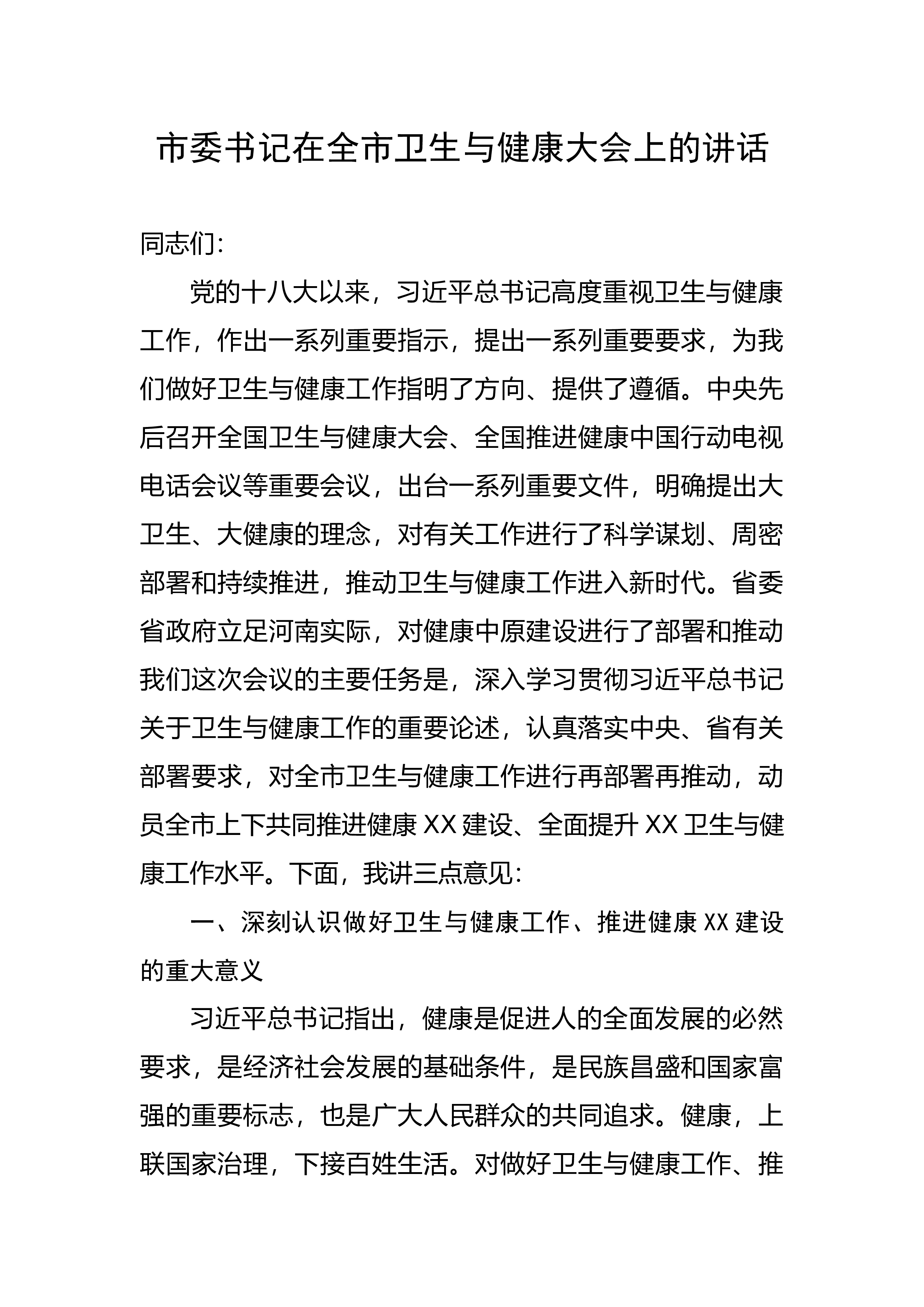 市委书记在全市卫生与健康大会上的讲话同志们:党的十八大以来,习近平总书记高度重视卫生与健康工作,作出一系列重要指示,提出一系列重要要求,为我们做好卫生与健康工作指明了方向、提供了遵循。中央先后召开全国卫生与健康大会、全国推进健康中国行动电视电话会议等重要会议,出台一系列重要文件,明确提出大卫生、大健康的理念,对有关工作进行了科学谋划、周密部署和持续推进,推动卫生与健康工作进入新时代。省委省政府立足河南实际,对健康中原建设进行了部署和推动我们这次会议的主要任务是,深入学习贯彻习近平总书记关于卫生与健康工作的重要论述,认真落实中央、省有关部署要求,对全市卫生与健康工作进行再部署再推动,动员全市上下...