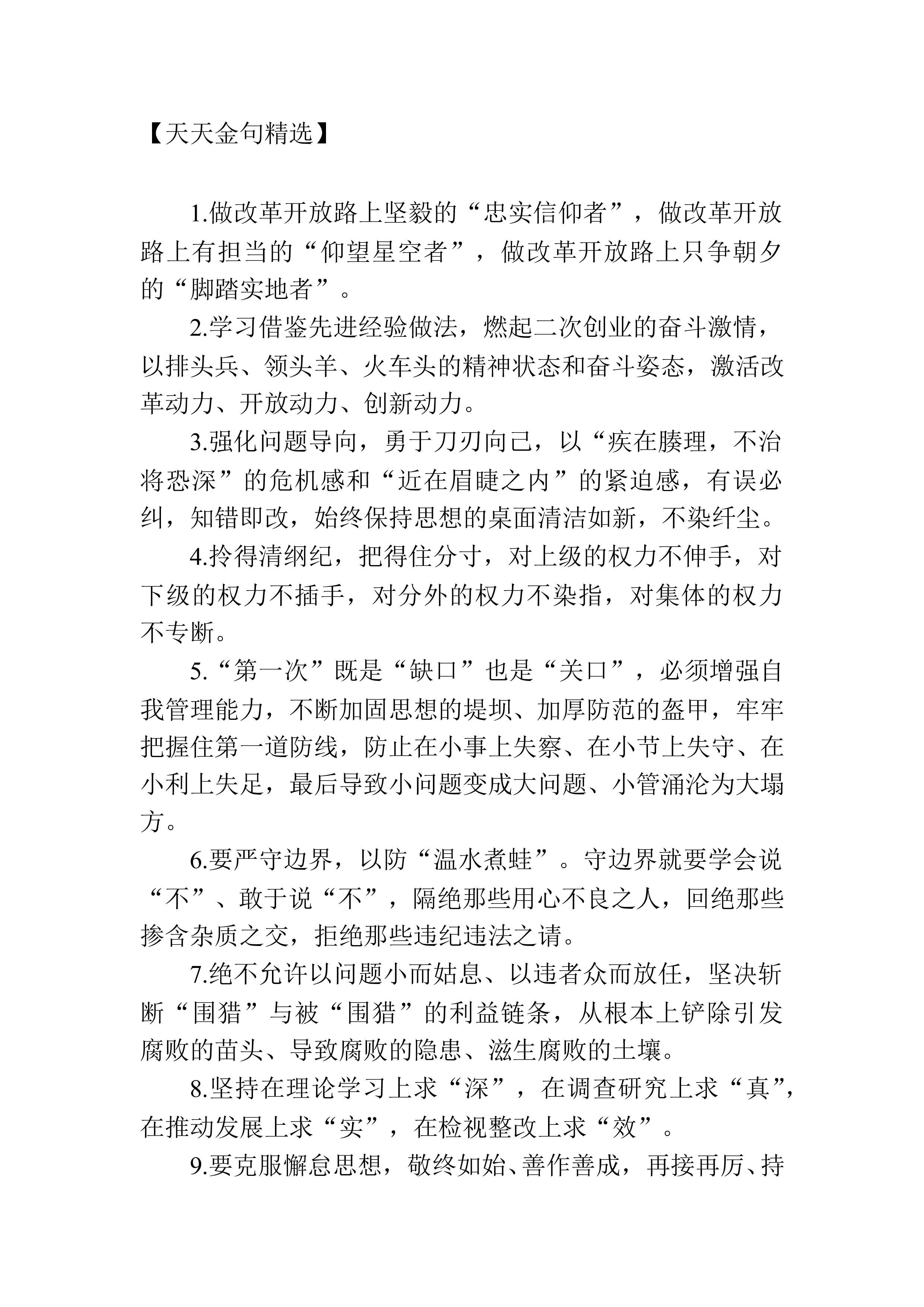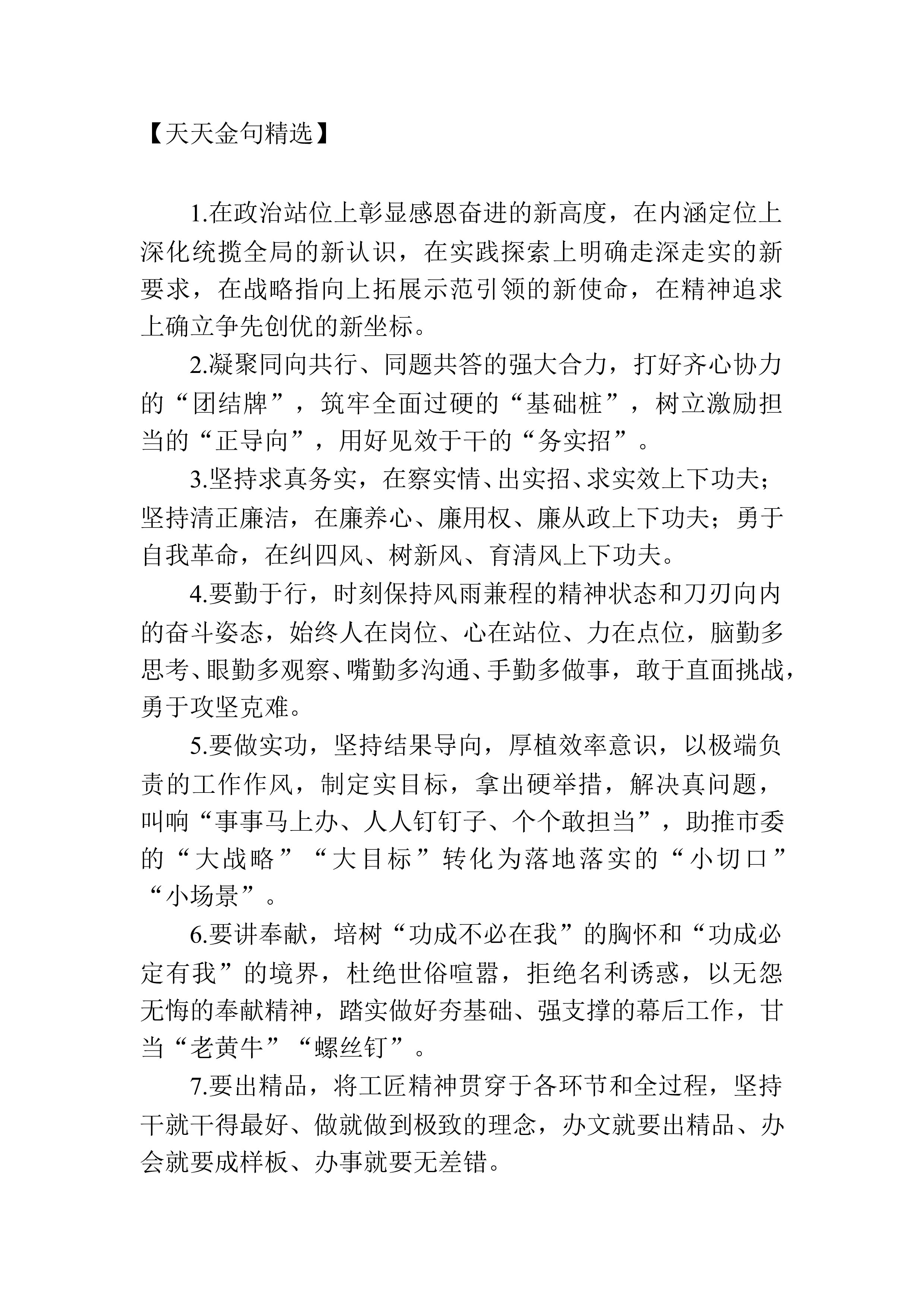 【天天金句精选】1.在探索探路中实现突破突围,在先行先试中树立标准标杆,在比武比拼中努力争先争优。2.砥砺追求卓越、勇争一流之志,力行攻坚克难、赶超跨越之举,务求人人尽责、事事落实之效。3.保持“一日无为、三日不安”的紧迫感和“一分部署、九分落实”的责任感,向一流看齐、往高峰攀登,撸起袖子加油干。4.以只争朝夕、发力奋进的姿态,按下能力提升快进键、跑出作风建设加速度、拼出争先进位新作为。5.有爬坡过坎之难、闯关夺隘之艰,更有夙兴夜寐之勤、一往无前之勇。6.以“绝知此事要躬行”的务实态度、“俯首甘为孺子牛”的敬业姿态、“不破楼兰终不还”的坚实决心,坚持调查研究、担当实干、攻坚克难。7.“怕得罪人...