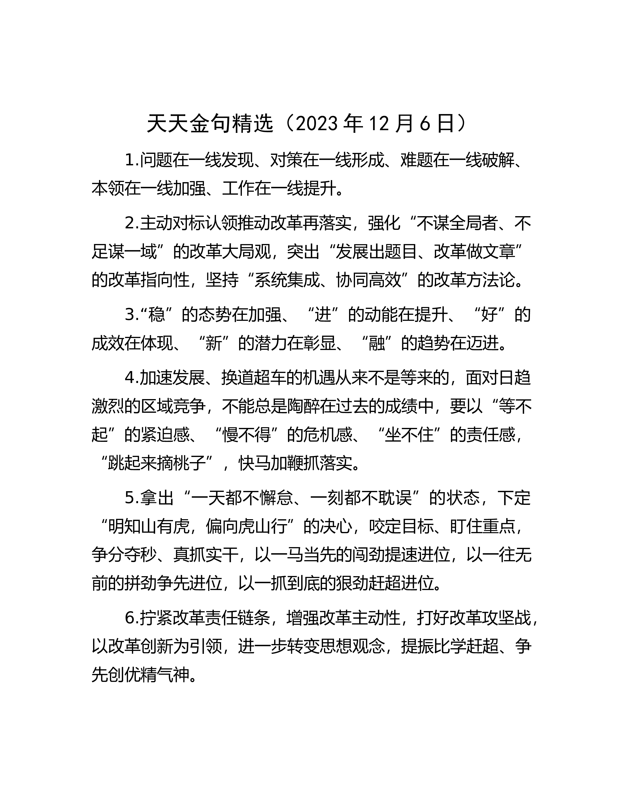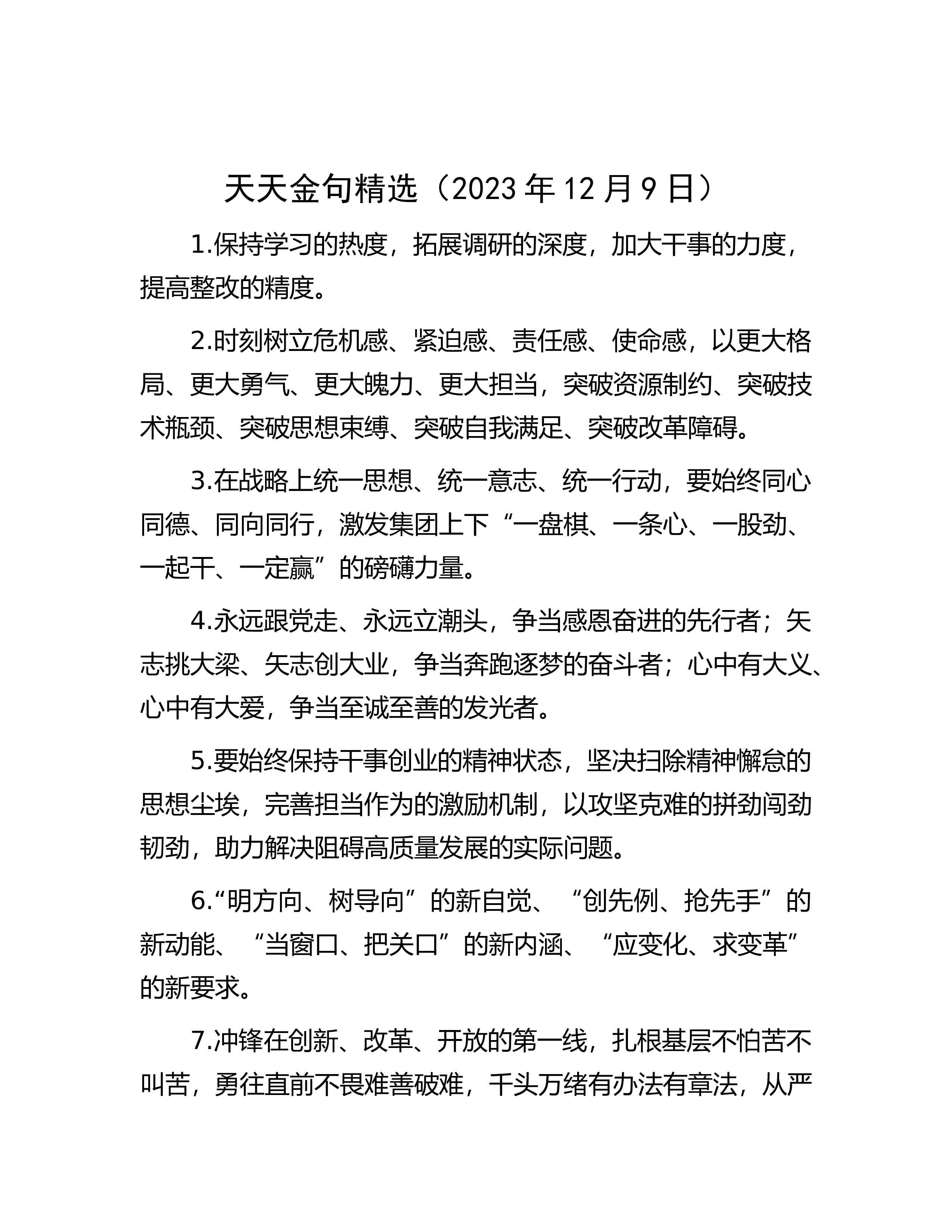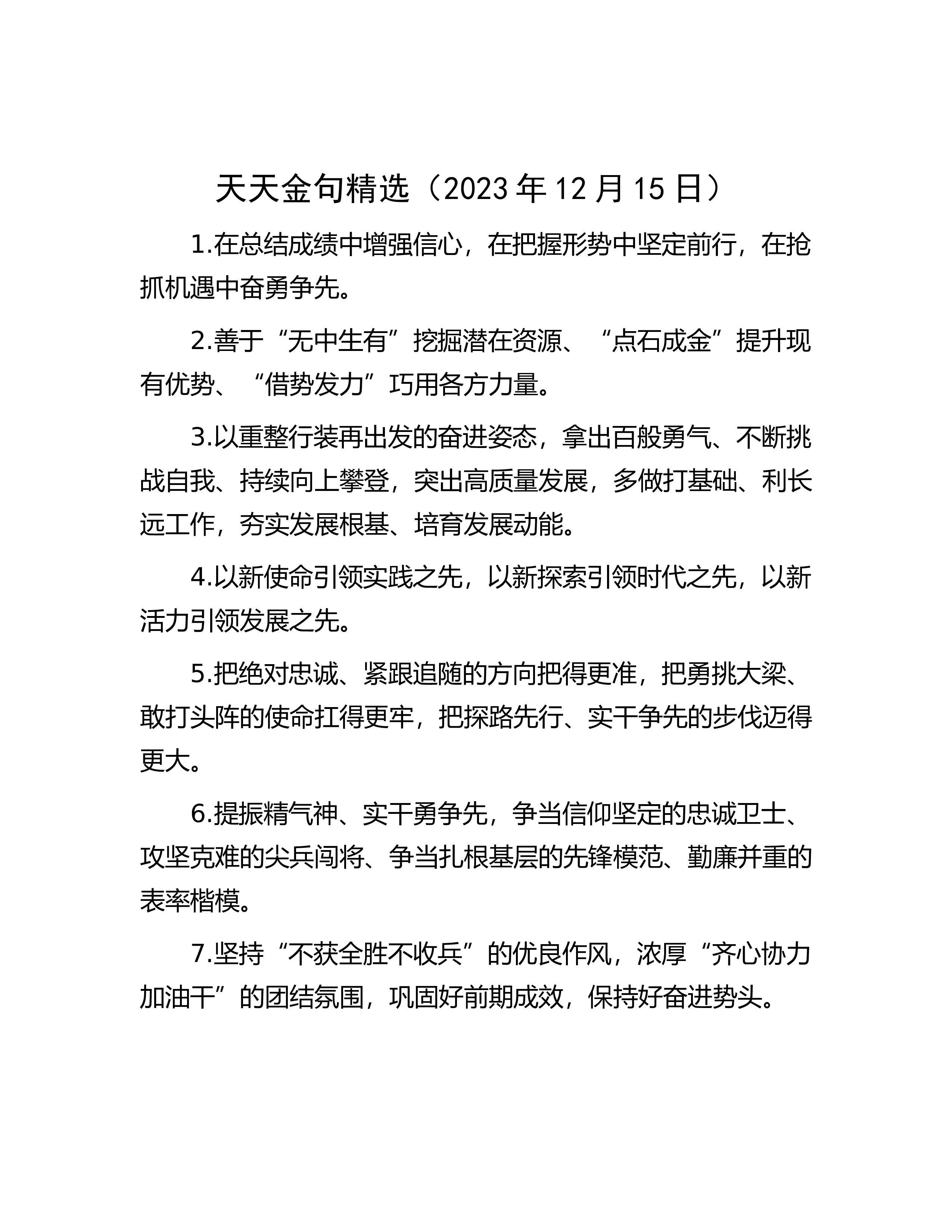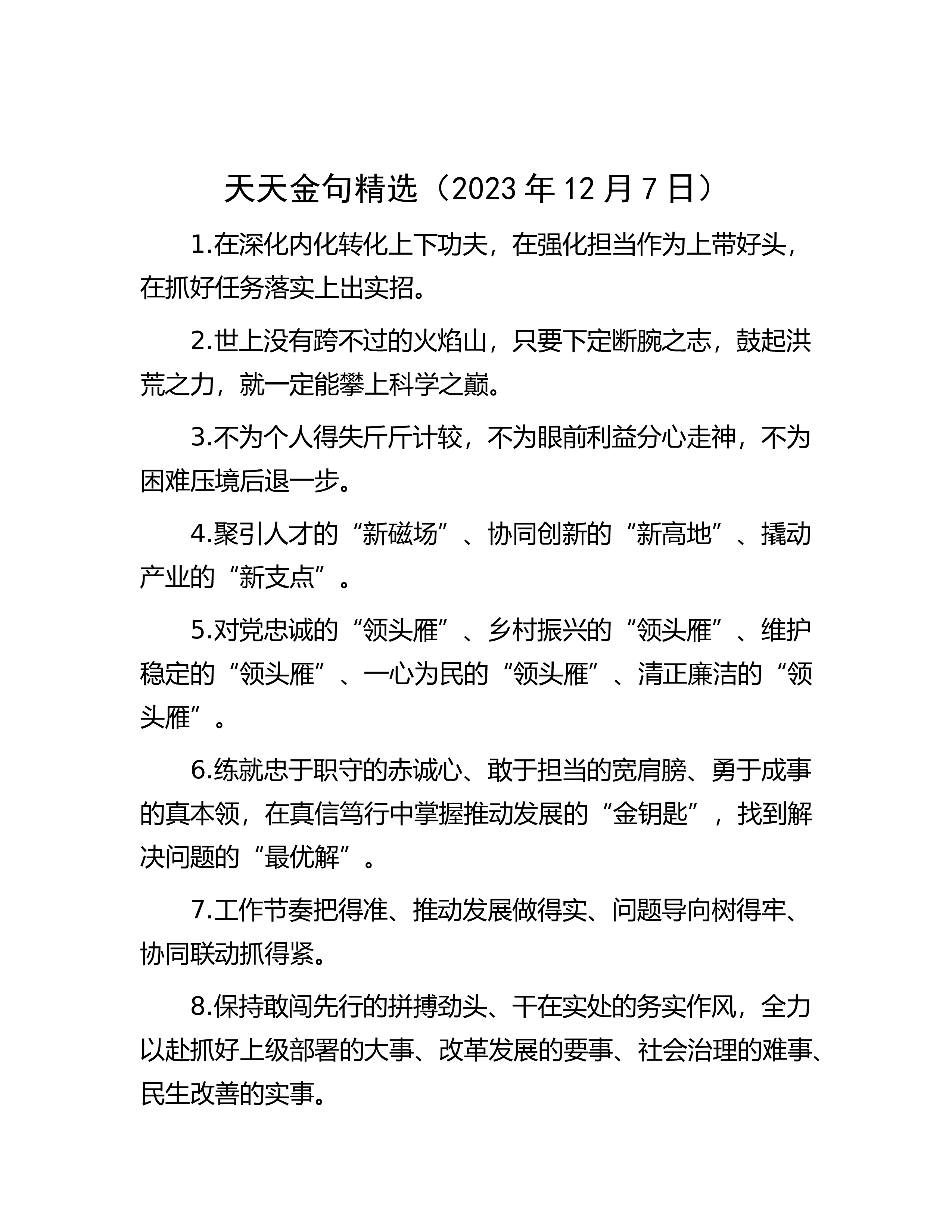 天天金句精选(2023年12月7日)1.在深化内化转化上下功夫,在强化担当作为上带好头,在抓好任务落实上出实招。2.世上没有跨不过的火焰山,只要下定断腕之志,鼓起洪荒之力,就一定能攀上科学之巅。3.不为个人得失斤斤计较,不为眼前利益分心走神,不为困难压境后退一步。4.聚引人才的“新磁场”、协同创新的“新高地”、撬动产业的“新支点”。5.对党忠诚的“领头雁”、乡村振兴的“领头雁”、维护稳定的“领头雁”、一心为民的“领头雁”、清正廉洁的“领头雁”。6.练就忠于职守的赤诚心、敢于担当的宽肩膀、勇于成事的真本领,在真信笃行中掌握推动发展的“金钥匙”,找到解决问题的“最优解”。7.工作节奏把得准、推动发...
