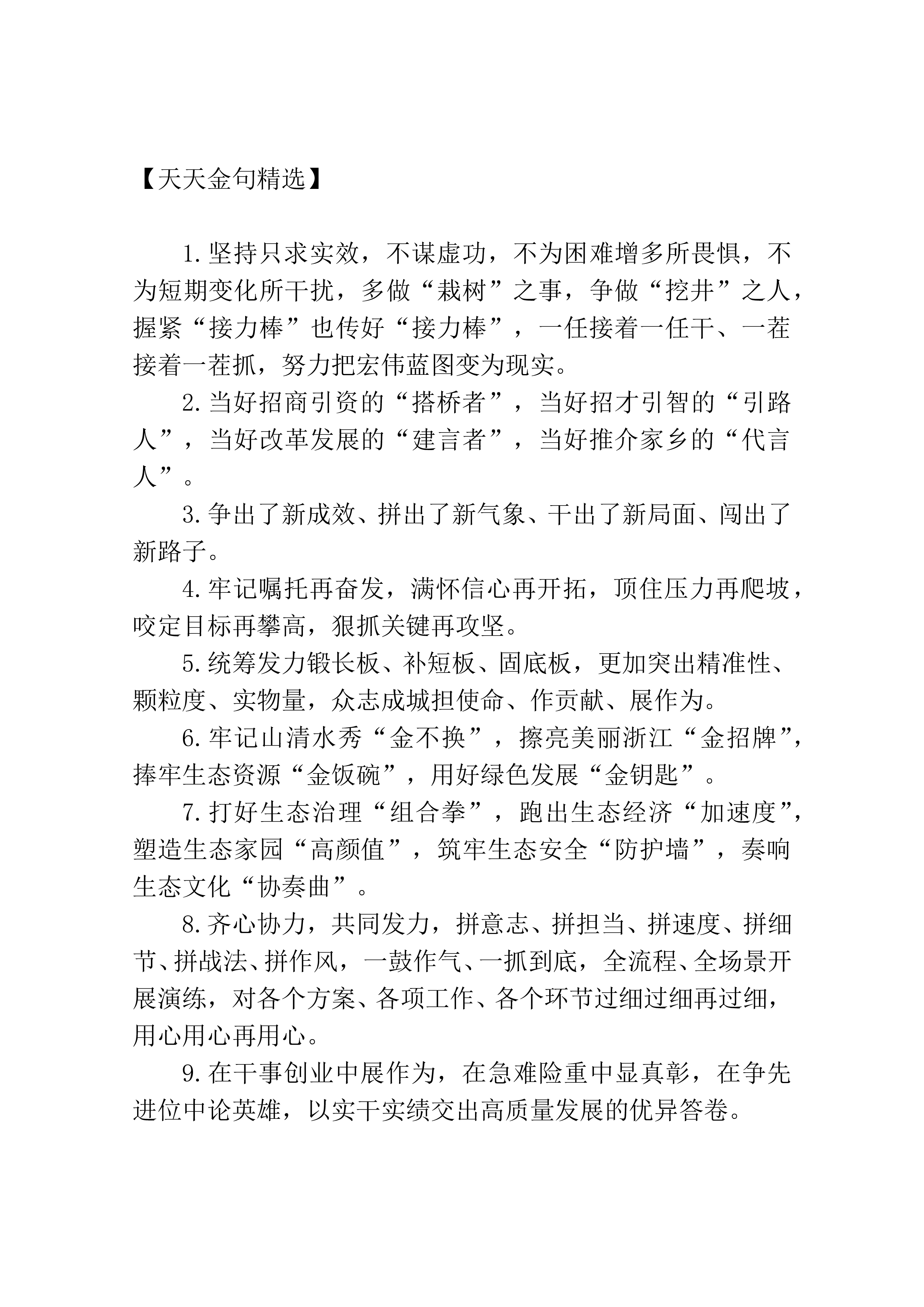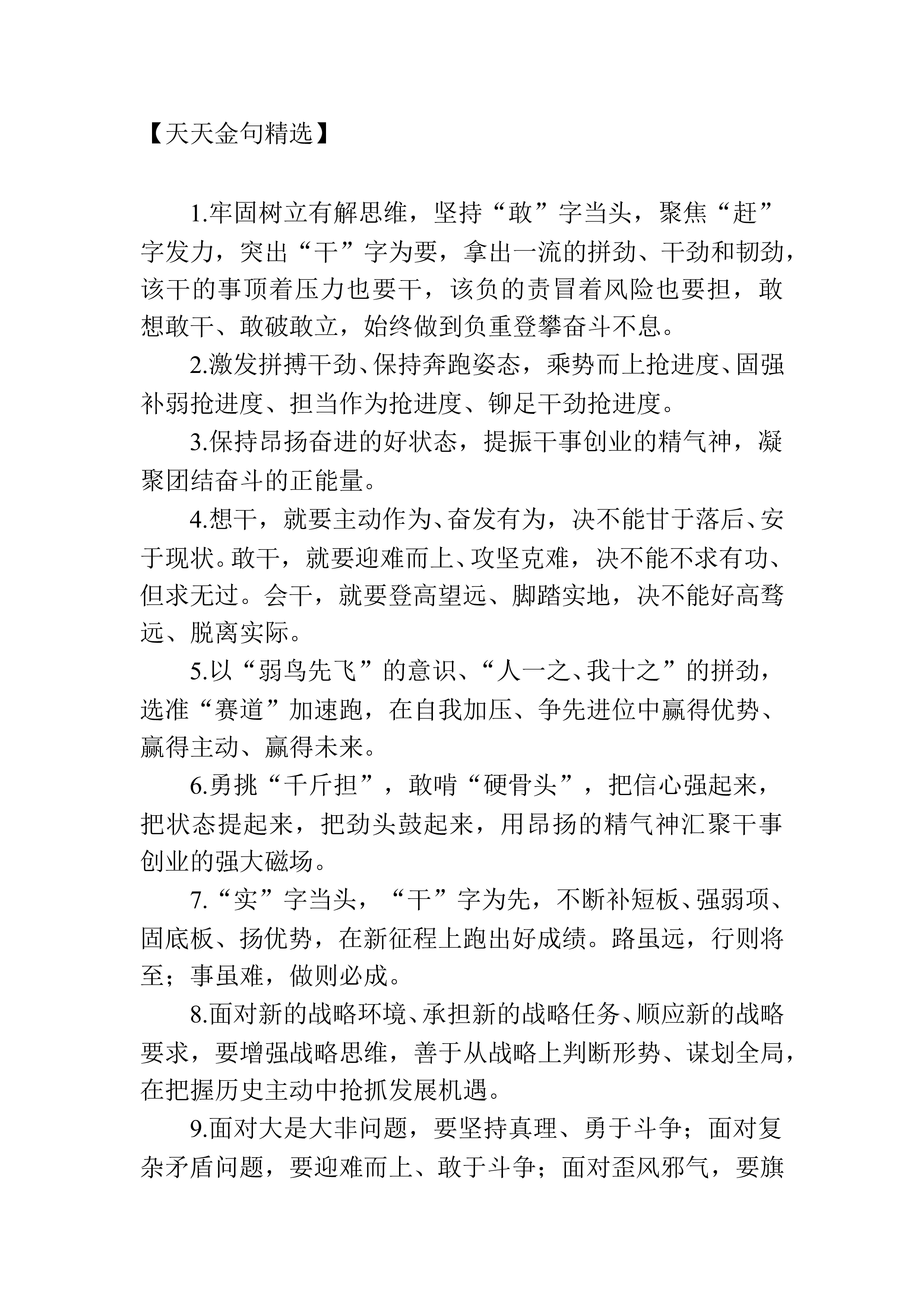 【天天金句精选】1.打破思维定势,大胆地想、大胆地谋、大胆地干、大胆地闯,敢于涉险滩、敢啃硬骨头,事不避难、义不逃责,使各项工作既为一域增光、也为全局添彩。2.以过硬的作风抓落实,保持紧张快干的状态,提振走在前列的志气,弘扬求真务实精神,优化干事创业环境。3.建设诚心待才平台,拿出真心引才诚意,保持悉心育才定力,营造实心爱才氛围。4.一心一意贯彻政治路线,一如既往恪守公道正派,一刻不停提高专业素养,一以贯之砥砺务实之风。5.遇事不推诿、不逃避,勇当改革发展的先锋,善做开拓进取的闯将,敢于跟最强者比拼、与最快者赛跑,一关接着一关闯,以一马当先的勇气和冲劲,带动干部群众万马奔腾。6.处理好蹄疾与步...
