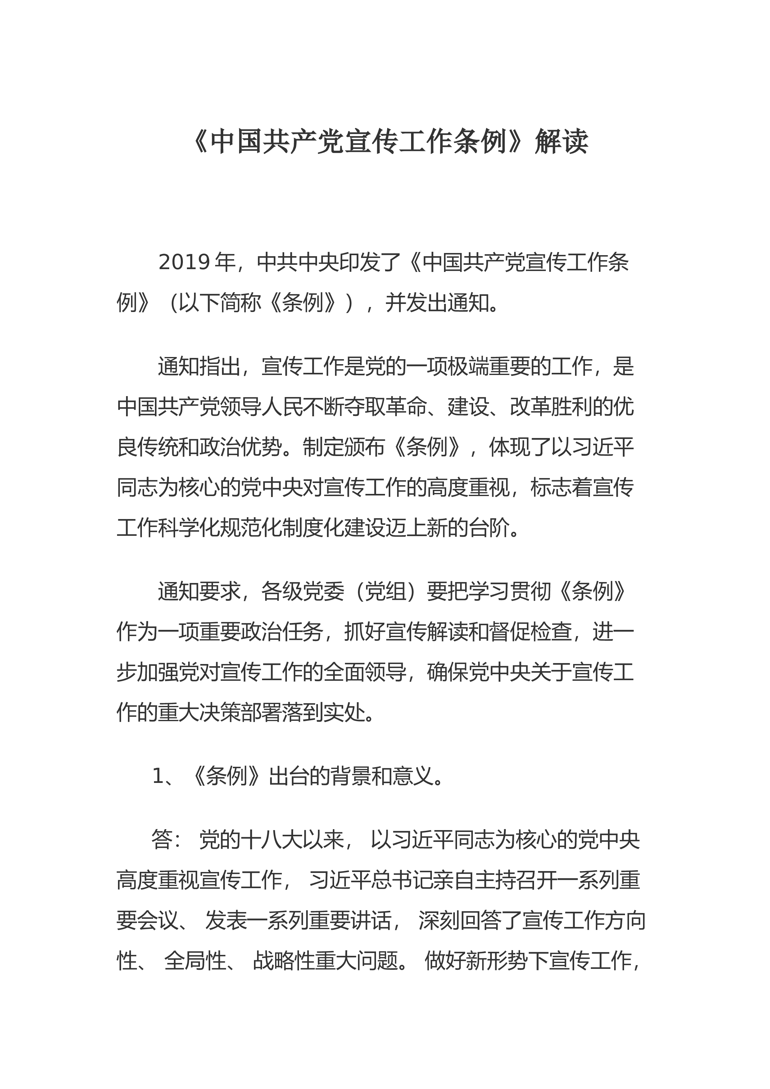 《中国共产党宣传工作条例》解读2019年,中共中央印发了《中国共产党宣传工作条例》(以下简称《条例》),并发出通知。 通知指出,宣传工作是党的一项极端重要的工作,是中国共产党领导人民不断夺取革命、建设、改革胜利的优良传统和政治优势。制定颁布《条例》,体现了以习近平同志为核心的党中央对宣传工作的高度重视,标志着宣传工作科学化规范化制度化建设迈上新的台阶。通知要求,各级党委(党组)要把学习贯彻《条例》作为一项重要政治任务,抓好宣传解读和督促检查,进一步加强党对宣传工作的全面领导,确保党中央关于宣传工作的重大决策部署落到实处。1、《条例》出台的背景和意义。答:党的十八大以来,以习近平同志为核心的党...