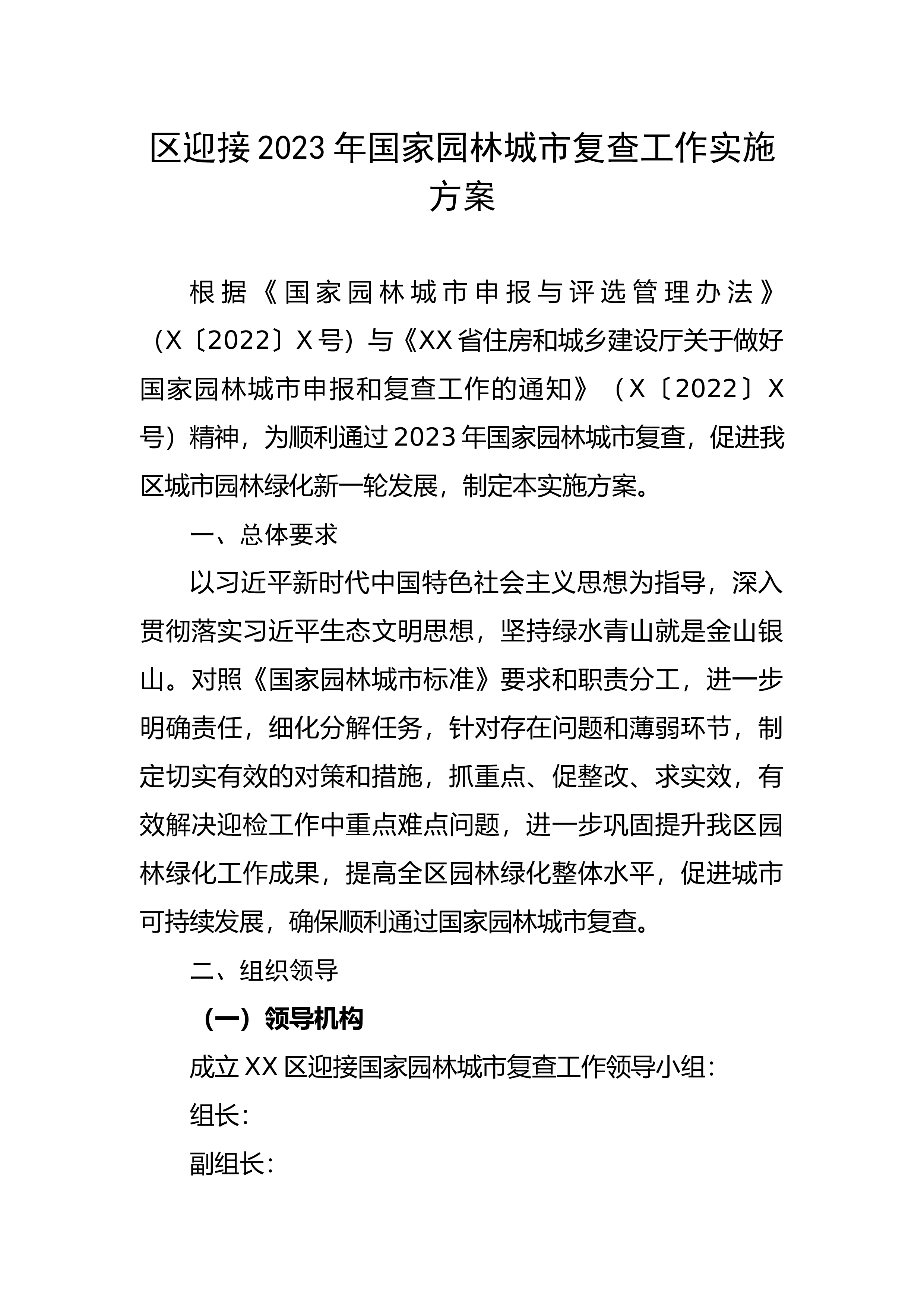 区迎接2023年国家园林城市复查工作实施方案根据《国家园林城市申报与评选管理办法》(X〔2022〕X号)与《XX省住房和城乡建设厅关于做好国家园林城市申报和复查工作的通知》(X〔2022〕X号)精神,为顺利通过2023年国家园林城市复查,促进我区城市园林绿化新一轮发展,制定本实施方案。一、总体要求以习近平新时代中国特色社会主义思想为指导,深入贯彻落实习近平生态文明思想,坚持绿水青山就是金山银山。对照《国家园林城市标准》要求和职责分工,进一步明确责任,细化分解任务,针对存在问题和薄弱环节,制定切实有效的对策和措施,抓重点、促整改、求实效,有效解决迎检工作中重点难点问题,进一步巩固提升我区园林绿化...