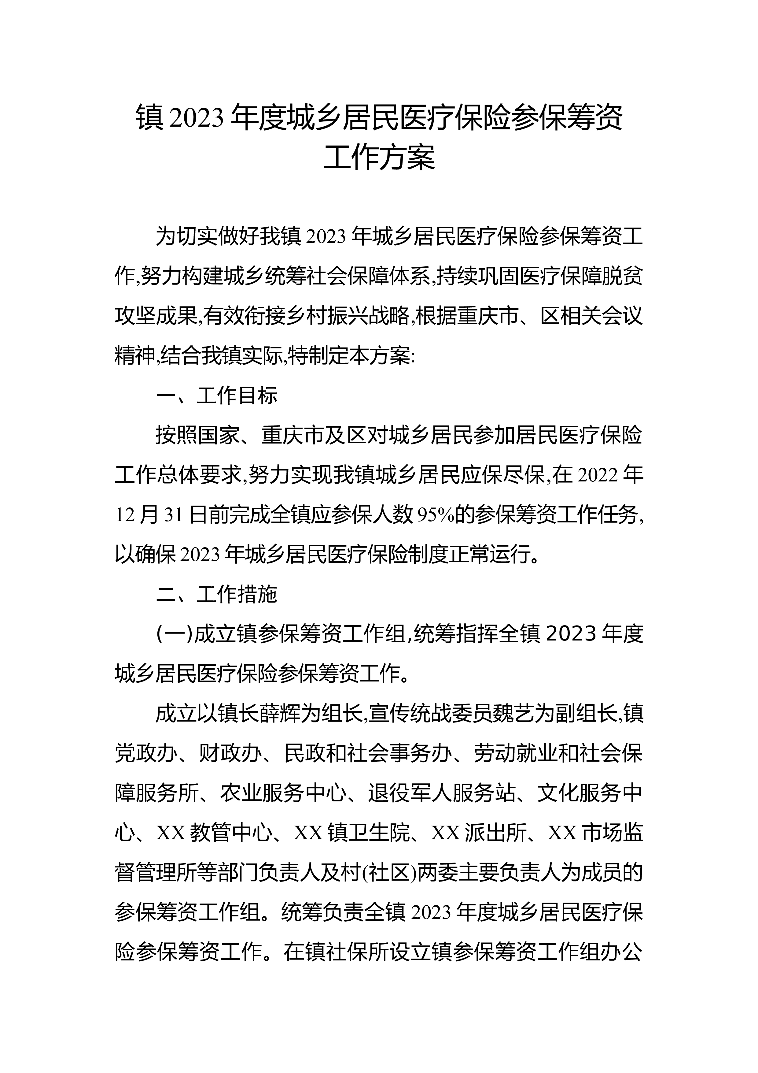 镇2023年度城乡居民医疗保险参保筹资工作方案为切实做好我镇2023年城乡居民医疗保险参保筹资工作,努力构建城乡统筹社会保障体系,持续巩固医疗保障脱贫攻坚成果,有效衔接乡村振兴战略,根据重庆市、区相关会议精神,结合我镇实际,特制定本方案:一、工作目标按照国家、重庆市及区对城乡居民参加居民医疗保险工作总体要求,努力实现我镇城乡居民应保尽保,在2022年12月31日前完成全镇应参保人数95%的参保筹资工作任务,以确保2023年城乡居民医疗保险制度正常运行。二、工作措施(一)成立镇参保筹资工作组,统筹指挥全镇2023年度城乡居民医疗保险参保筹资工作。成立以镇长薛辉为组长,宣传统战委员魏艺为副组长,镇...