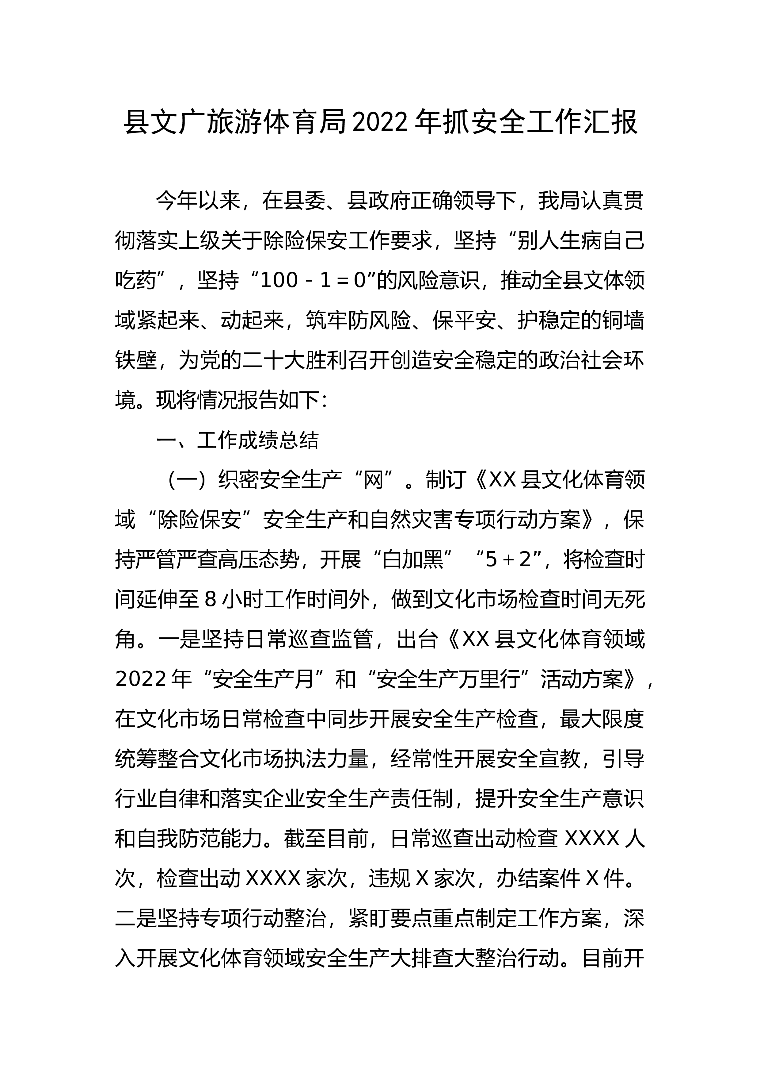 、县政府正确领导下,我局认真贯彻落实上级关于除险保安工作要求,坚持“别人生病自己吃药”,坚持“100-1=0”的风险意识,推动全县文体领域紧起来、动起来,筑牢防风险、保平安、护稳定的铜墙铁壁,为党的二十大胜利召开创造安全稳定的政治社会环境。现将情况报告如下:一、工作成绩总结(一)织密安全生产“网”。制订《XX县文化体育领域“除险保安”安全生产和自然灾害专项行动方案》,保持严管严查高压态势,开展“白加黑”“5+2”,将检查时间延伸至8小时工作时间外,做到文化市场检查时间无死角。一是坚持日常巡查监管,出台《XX县文化体育领域2022年“安全生...