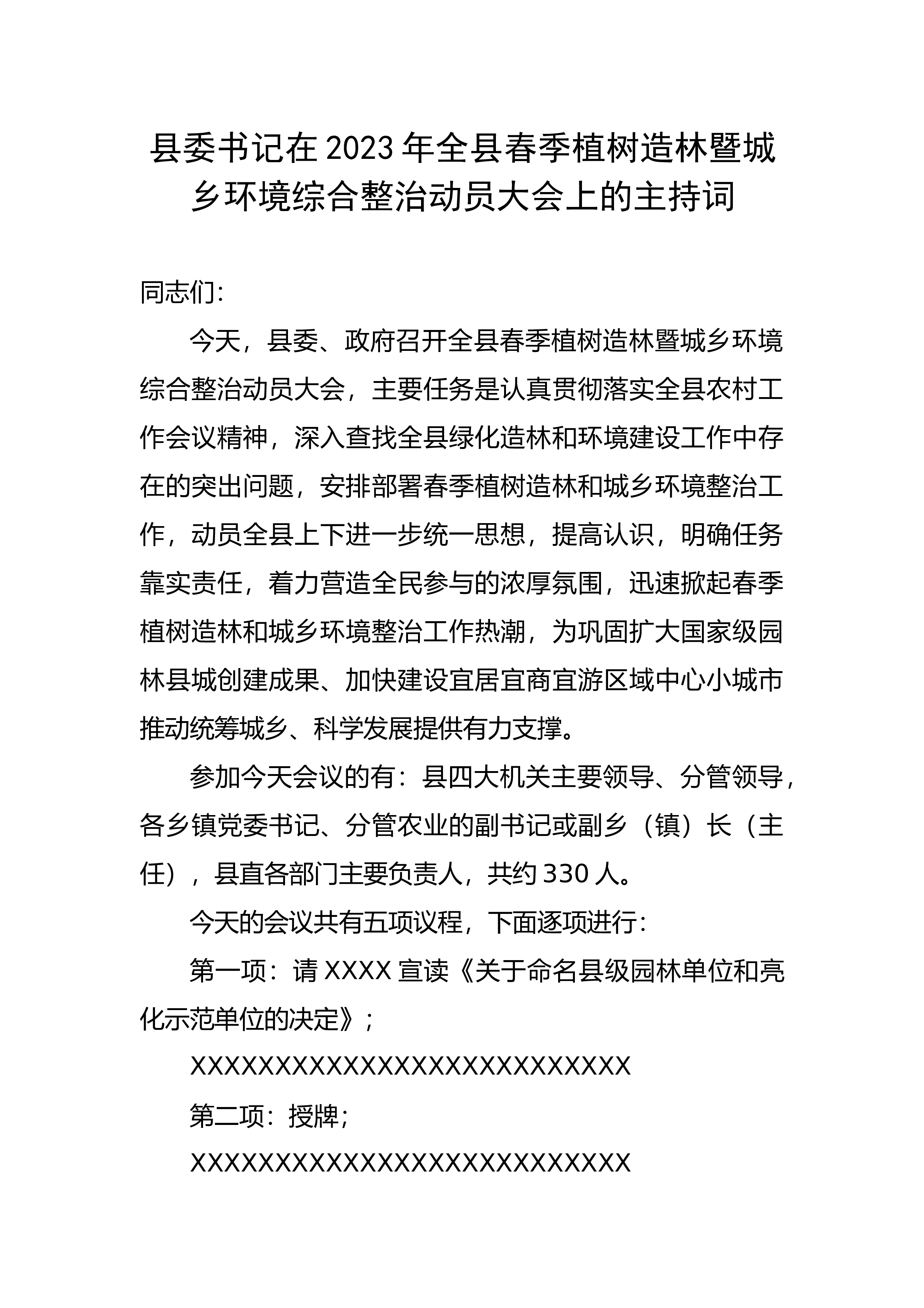 在2023年全县春季植树造林暨城乡环境综合整治动员大会上的主持词同志们:今天,县委、政府召开全县春季植树造林暨城乡环境综合整治动员大会,主要任务是认真贯彻落实全县农村工作会议精神,深入查找全县绿化造林和环境建设工作中存在的突出问题,安排部署春季植树造林和城乡环境整治工作,动员全县上下进一步统一思想,提高认识,明确任务靠实责任,着力营造全民参与的浓厚氛围,迅速掀起春季植树造林和城乡环境整治工作热潮,为巩固扩大国家级园林县城创建成果、加快建设宜居宜商宜游区域中心小城市推动统筹城乡、科学发展提供有力支撑。参加今天会议的有:县四大机关主要领导、分管领导,各乡镇党委书记、分管农业的副书记或副乡(...