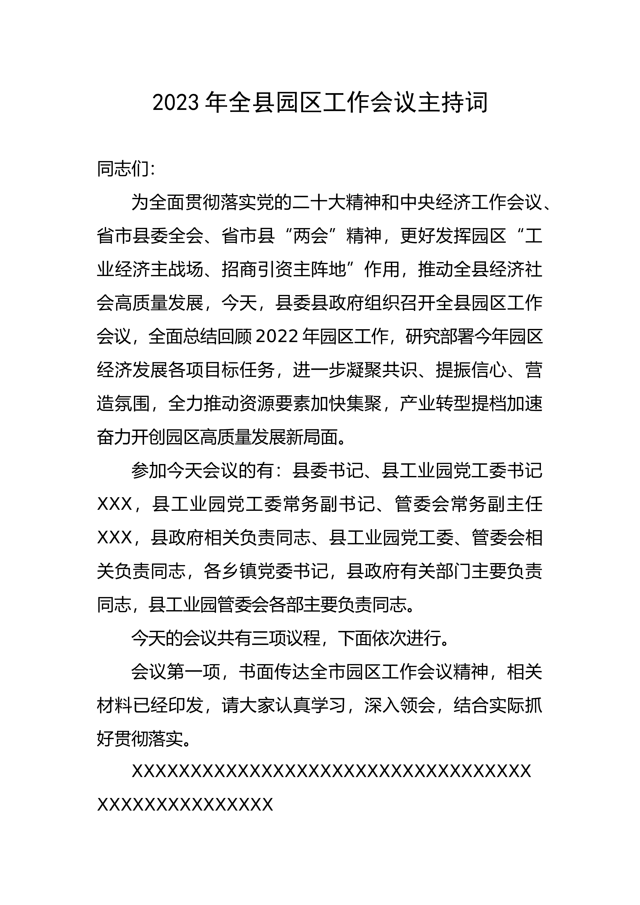 2023年全县园区工作会议主持词同志们:为全面贯彻落实党的二十大精神和中央经济工作会议、省市县委全会、省市县“两会”精神,更好发挥园区“工业经济主战场、招商引资主阵地”作用,推动全县经济社会高质量发展,今天,县委县政府组织召开全县园区工作会议,全面总结回顾2022年园区工作,研究部署今年园区经济发展各项目标任务,进一步凝聚共识、提振信心、营造氛围,全力推动资源要素加快集聚,产业转型提档加速奋力开创园区高质量发展新局面。参加今天会议的有: