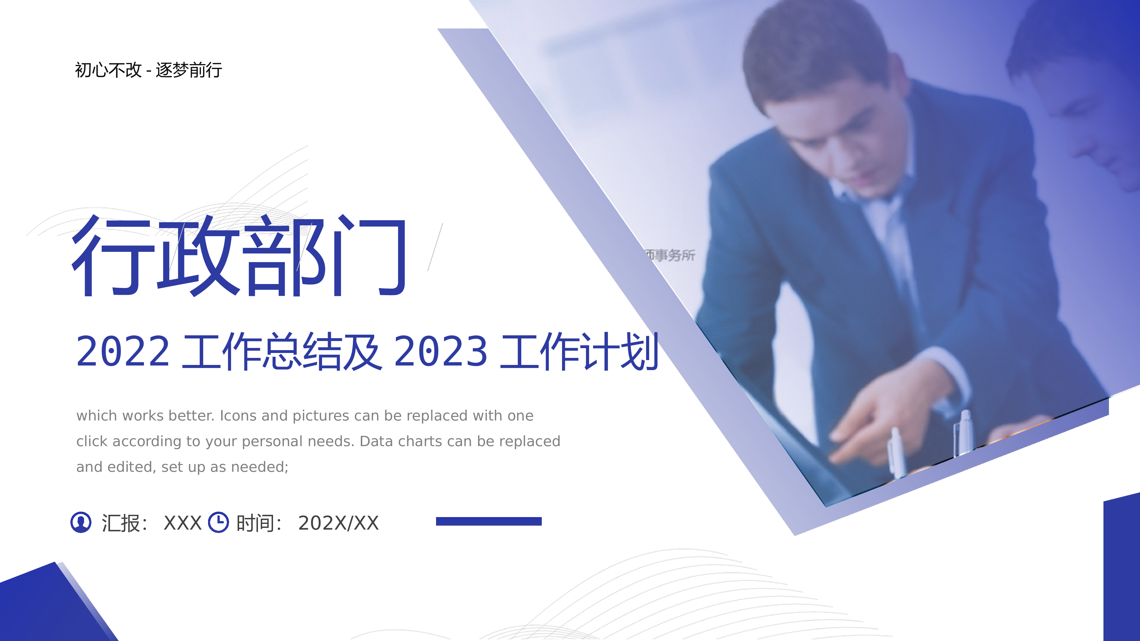 2022工作总结及2023工作计划行政部门初心不改-逐梦前行whichworksbetter.Iconsandpicturescanbereplacedwithoneclickaccordingtoyourpersonalneeds.Datachartscanbereplacedandedited,setupasneeded;汇报:XXX时间:202X/XX初心不改-逐梦前行目录CATALOG此处输入标题此处输入标题此处输入标题此处输入标题01020304Datachartscanbereplacedandedited,setupasneeded;Datachartscanbereplaced...