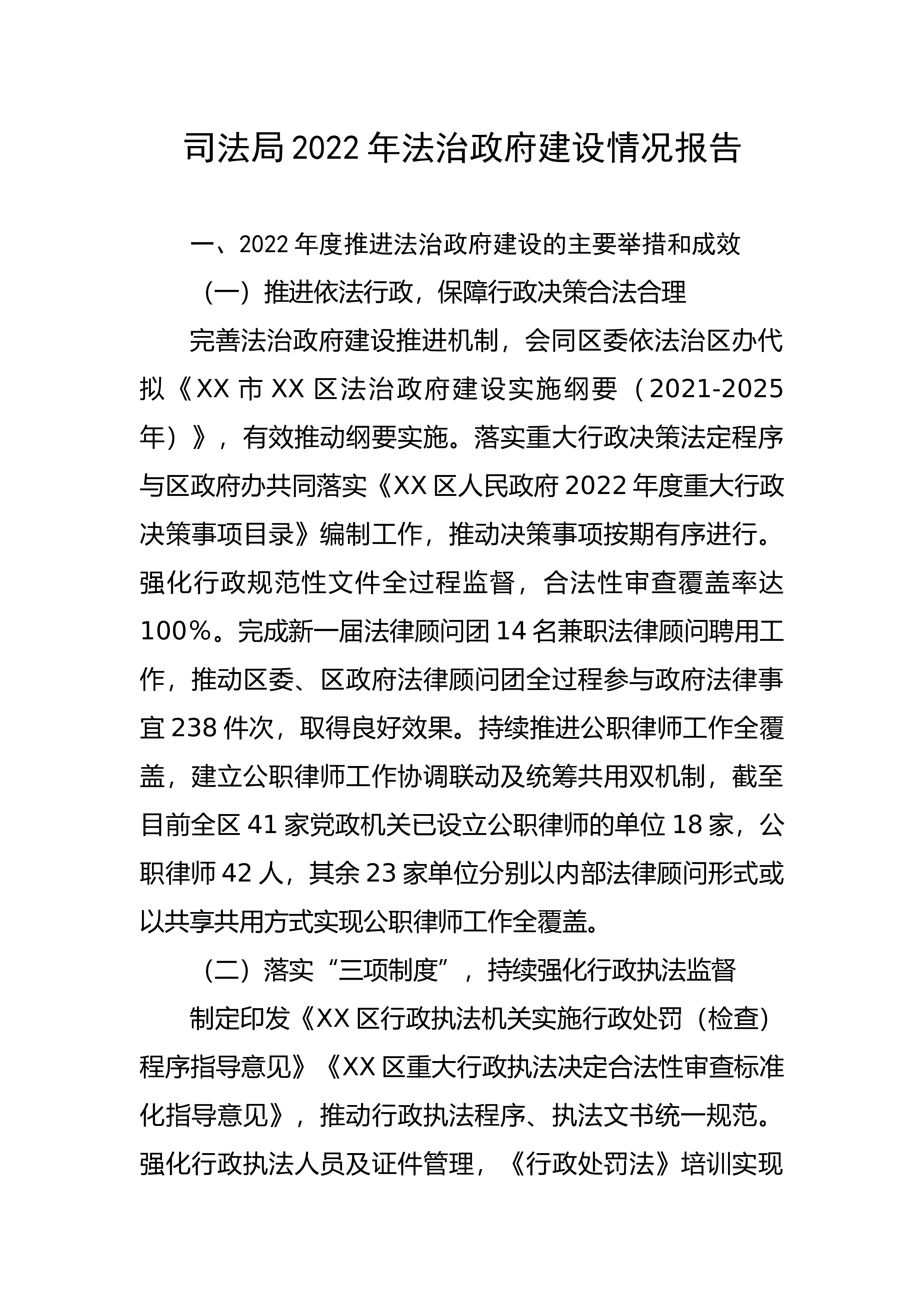 司法局2022年法治政府建设情况报告一、2022年度推进法治政府建设的主要举措和成效(一)推进依法行政,保障行政决策合法合理完善法治政府建设推进机制,会同区委依法治区办代拟《XX市XX区法治政府建设实施纲要(2021-2025年)》,有效推动纲要实施。落实重大行政决策法定程序与区政府办共同落实《XX区人民政府2022年度重大行政决策事项目录》编制工作,推动决策事项按期有序进行。强化行政规范性文件全过程监督,合法性审查覆盖率达100%。完成新一届法律顾问团14名兼职法律顾问聘用工作,推动区委、区政府法律顾问团全过程参与政府法律事宜238件次,取得良好效果。持续推进公职律师工作全覆盖,建立公职律师...