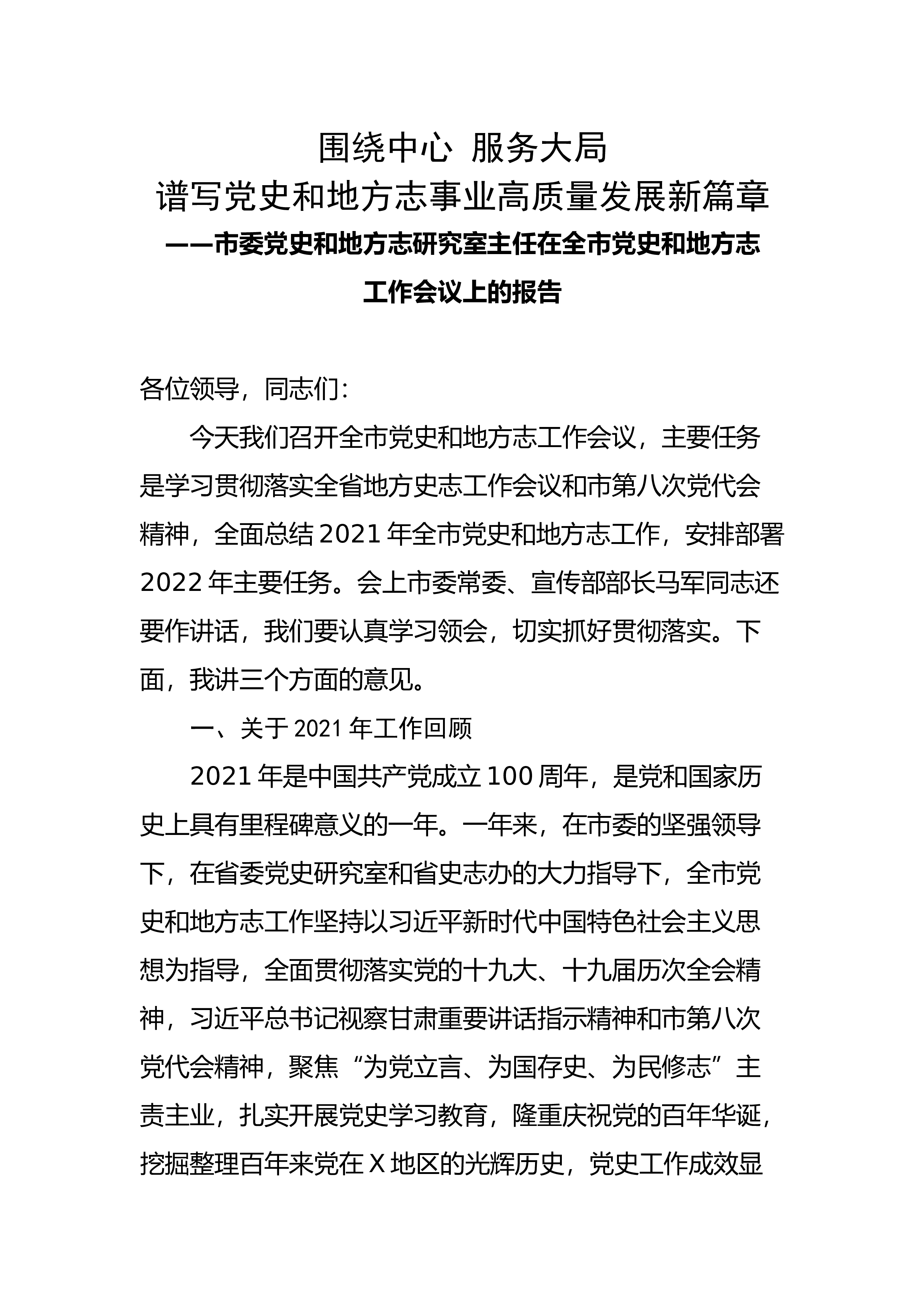 围绕中心服务大局谱写党史和地方志事业高质量发展新篇章——市委党史和地方志研究室主任在全市党史和地方志工作会议上的报告各位领导,同志们:今天我们召开全市党史和地方志工作会议,主要任务是学习贯彻落实全省地方史志工作会议和市第八次党代会精神,全面总结2021年全市党史和地方志工作,安排部署2022年主要任务。会上市委常委、