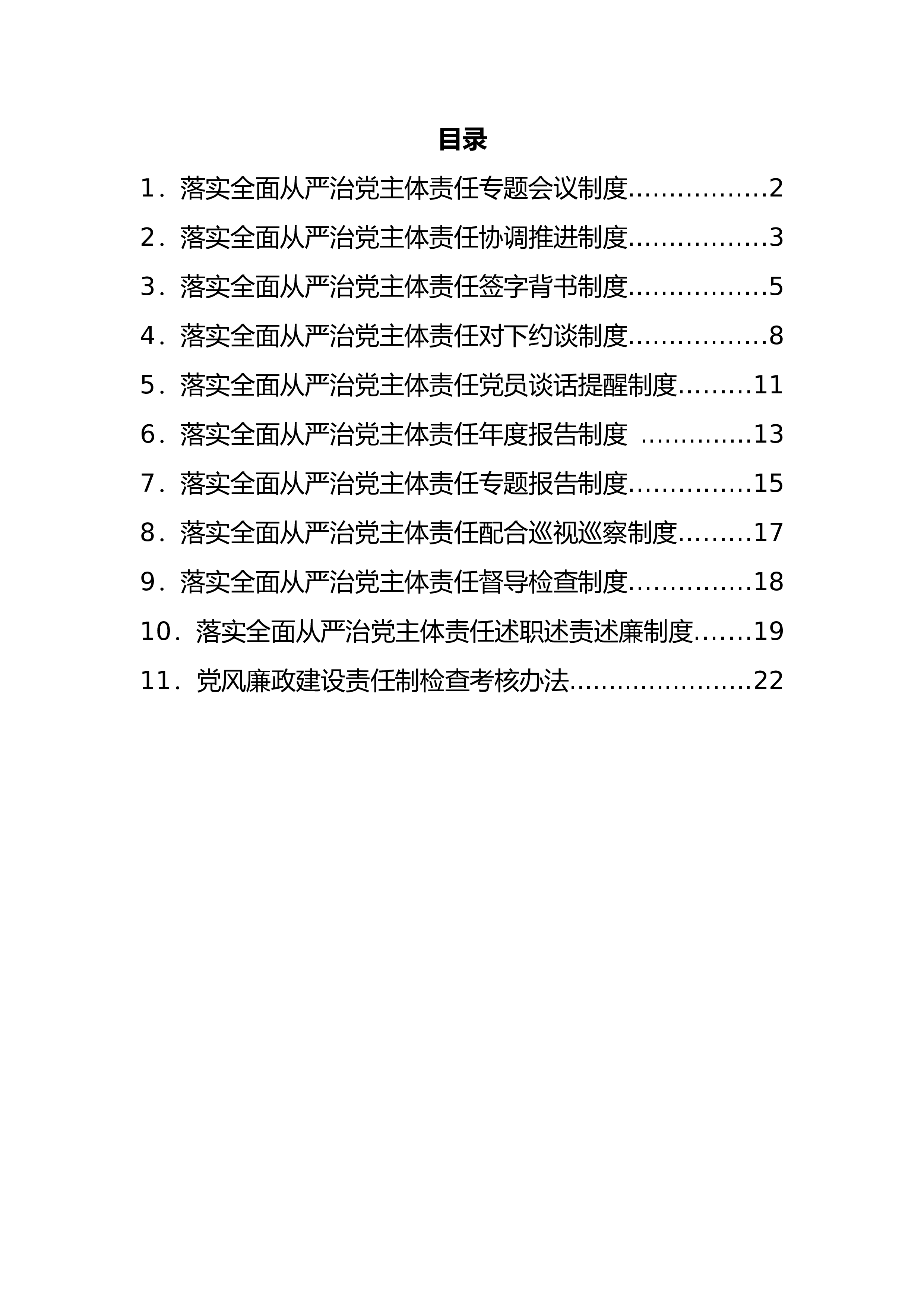 目录1.落实全面从严治党主体责任专题会议制度.................22.落实全面从严治党主体责任协调推进制度.................33.落实全面从严治党主体责任签字背书制度.................54.落实全面从严治党主体责任对下约谈制度.................85.落实全面从严治党主体责任党员谈话提醒制度.........116.落实全面从严治党主体责任年度报告制度 ..............137.落实全面从严治党主体责任专题报告制度...............158.落实全面从严治党主体责任配合巡视
