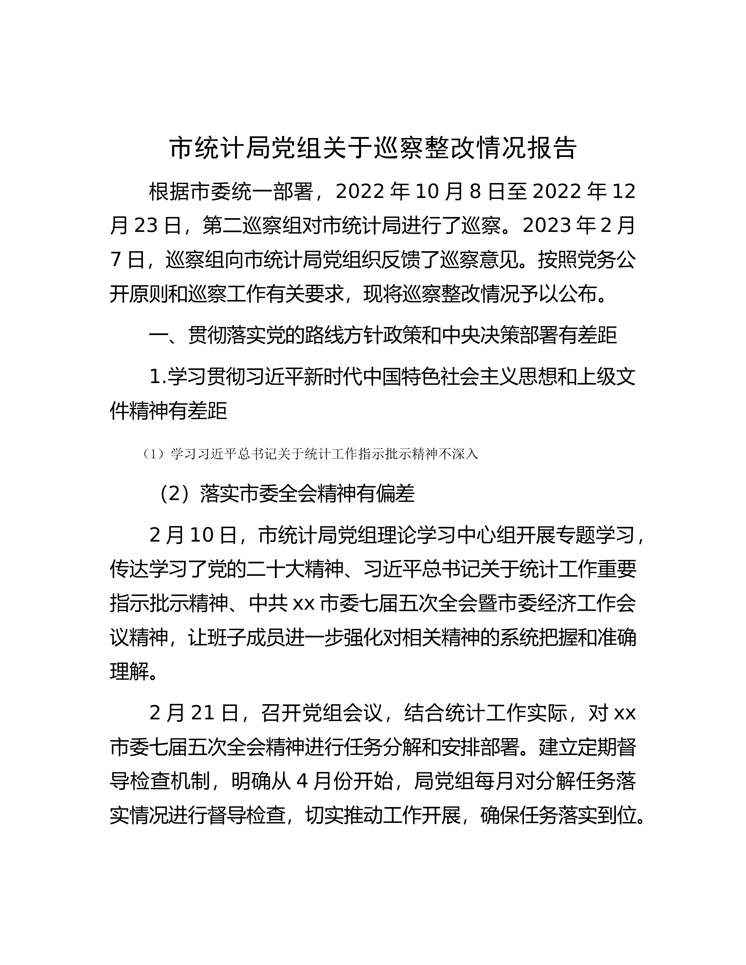 市统计局党组关于巡察整改情况报告根据市委统一部署,2022年10月8日至2022年12月23日,第二巡察组对市统计局进行了巡察。2023年2月7日,巡察组向市统计局党组织反馈了巡察意见。按照党务公开原则和巡察工作有关要求,现将巡察整改情况予以公布。一、贯彻落实党的路线方针政策和中央决策部署有差距1.学习贯彻习近平新时代中国特色社会主义思想和上级文件精神有差距(1)学习习近平总书记关于统计工作指示批示精神不深入(2)落实市委全会精神有偏差2月10日,市统计局党组理论学习中心组开展专题学习,传达学习了党的二十大精神、习近平总书记关于统计工作重要指示批示精神、中共xx市委七届五次全会暨市委经济工作会...
