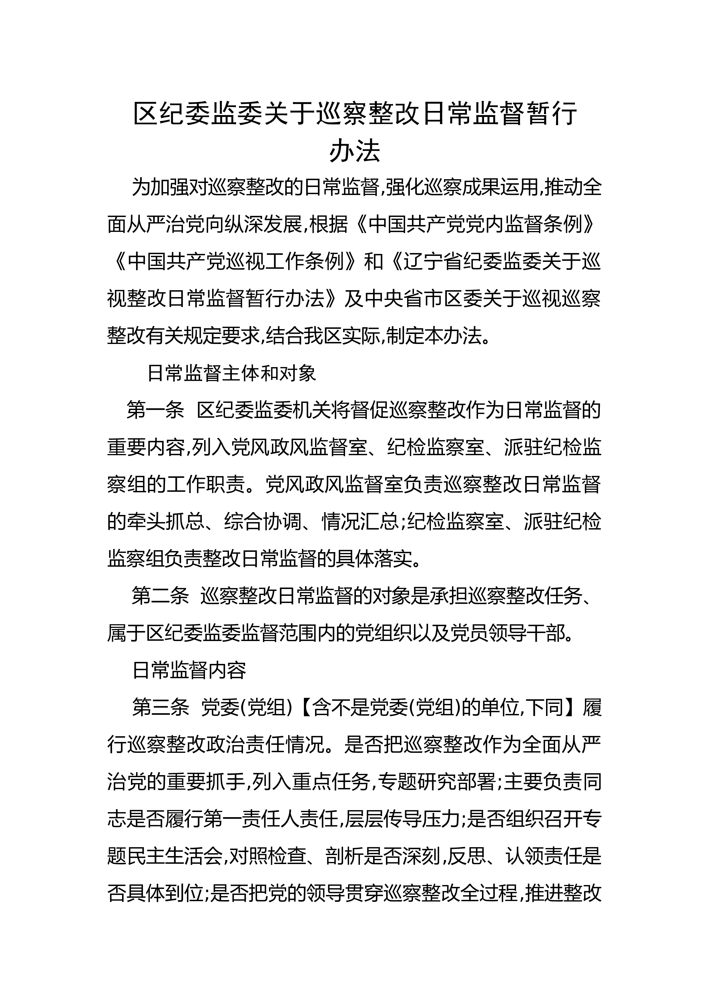 区纪委监委关于巡察整改日常监督暂行办法为加强对巡察整改的日常监督,强化巡察成果运用,推动全面从严治党向纵深发展,根据《中国共产党党内监督条例》《中国共产党巡视工作条例》和《辽宁省纪委监委关于巡视整改日常监督暂行办法》及中央省市区委关于巡视巡察整改有关规定要求,结合我区实际,制定本办法。日常监督主体和对象第一条区纪委监委机关将督促巡察整改作为日常监督的重要内容,列入党风政风监督室、纪检监察室、派驻纪检监察组的工作职责。党风政风监督室负责巡察整改日常监督的牵头抓总、综合协调、情况汇总;纪检监察室、派驻纪检监察组负责整改日常监督的具体落实。第二条巡察整改日常监督的对象是承担巡察整改任务、属于区纪委监...
