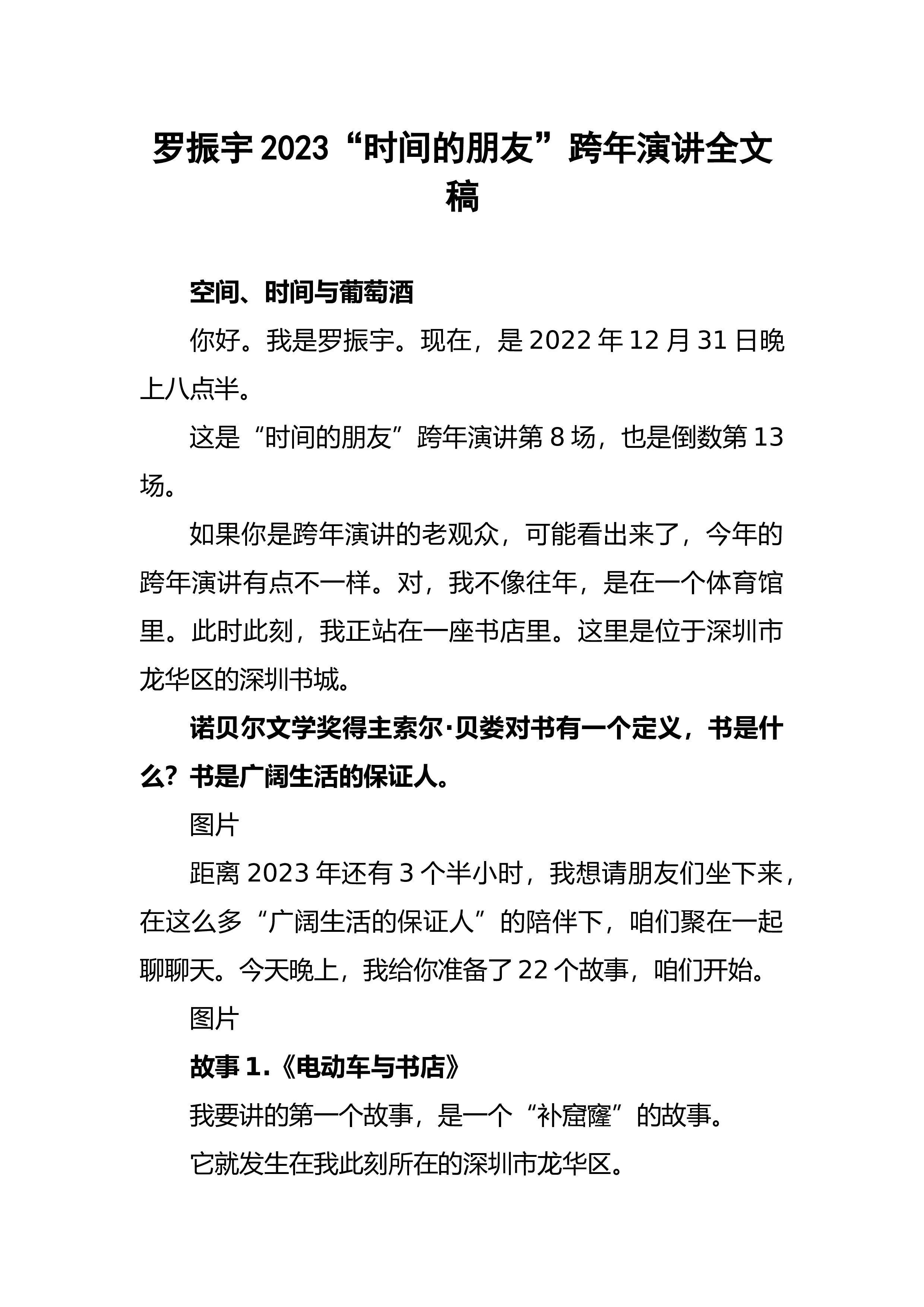 罗振宇2023“时间的朋友”跨年演讲全文稿空间、时间与葡萄酒你好。我是罗振宇。现在,是2022年12月31日晚上八点半。这是“时间的朋友”跨年演讲第8场,也是倒数第13场。如果你是跨年演讲的老观众,可能看出来了,今年的跨年演讲有点不一样。对,我不像往年,是在一个体育馆里。此时此刻,我正站在一座书店里。这里是位于深圳市龙华区的深圳书城。诺贝尔文学奖得主索尔·贝娄对书有一个定义,书是什么?书是广阔生活的保证人。图片距离2023年还有3个半小时,我想请朋友们坐下来,在这么多“广阔生活的保证人”的陪伴下,咱们聚在一起聊聊天。今天晚上,我给你准备了22个故事,咱们开始。图片故事1.《电动车与书店》我要讲...