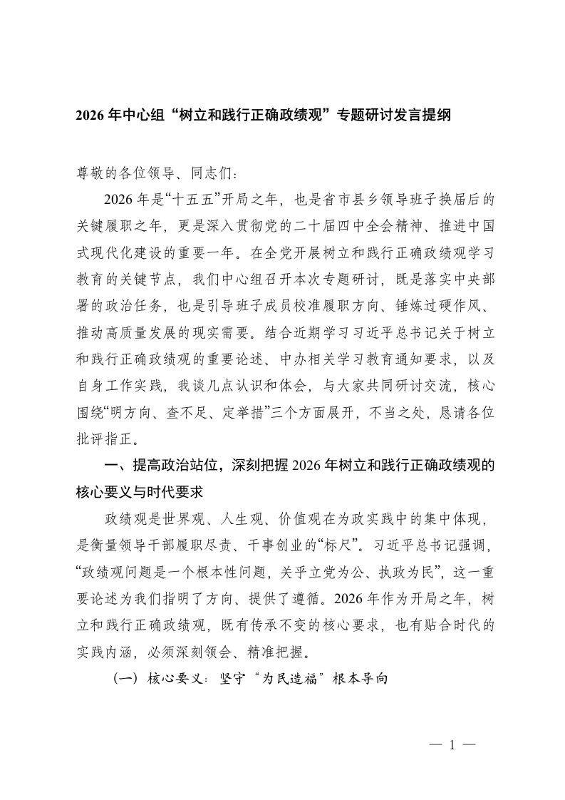 提纲,正确政绩观,发言,发言提纲,专题研讨,专题2026年中心组树立和践行正确政绩观专题