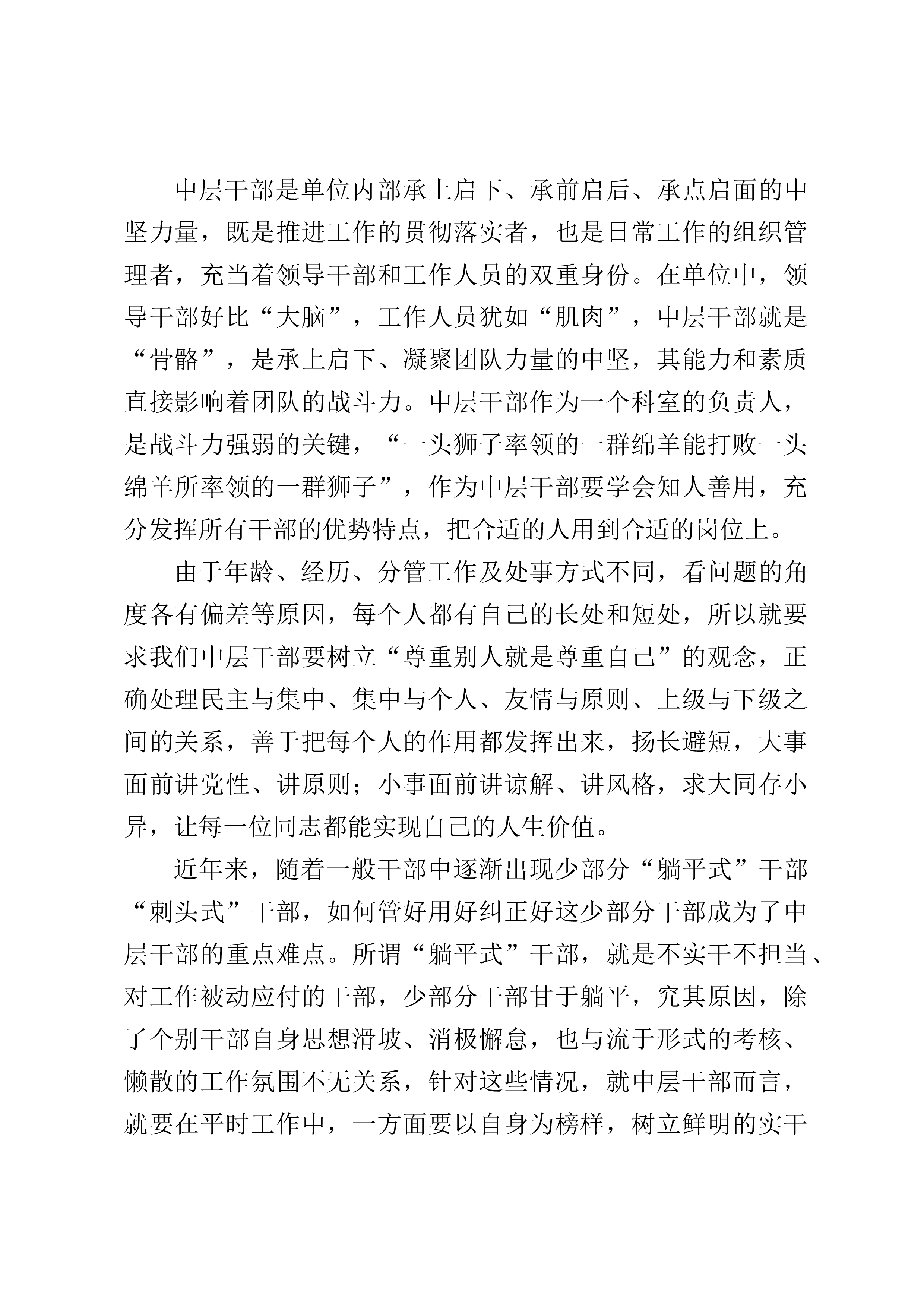中层干部是单位内部承上启下、承前启后、承点启面的中坚力量,既是推进工作的贯彻落实者,也是日常工作的组织管理者,充当着领导干部和工作人员的双重身份。在单位中,领导干部好比“大脑”,工作人员犹如“肌肉”,中层干部就是“骨骼”,是承上启下、凝聚团队力量的中坚,其能力和素质直接影响着团队的战斗力。中层干部作为一个科室的负责人,是战斗力强弱的关键,“一头狮子率领的一群绵羊能打败一头绵羊所率领的一群狮子”,作为中层干部要学会知人善用,充分发挥所有干部的优势特点,把合适的人用到合适的岗位上。由于年龄、经历、分管工作及处事方式不同,看问题的角度各有偏差等原因,每个人都有自己的长处和短处,所以就要求我们中层干部...