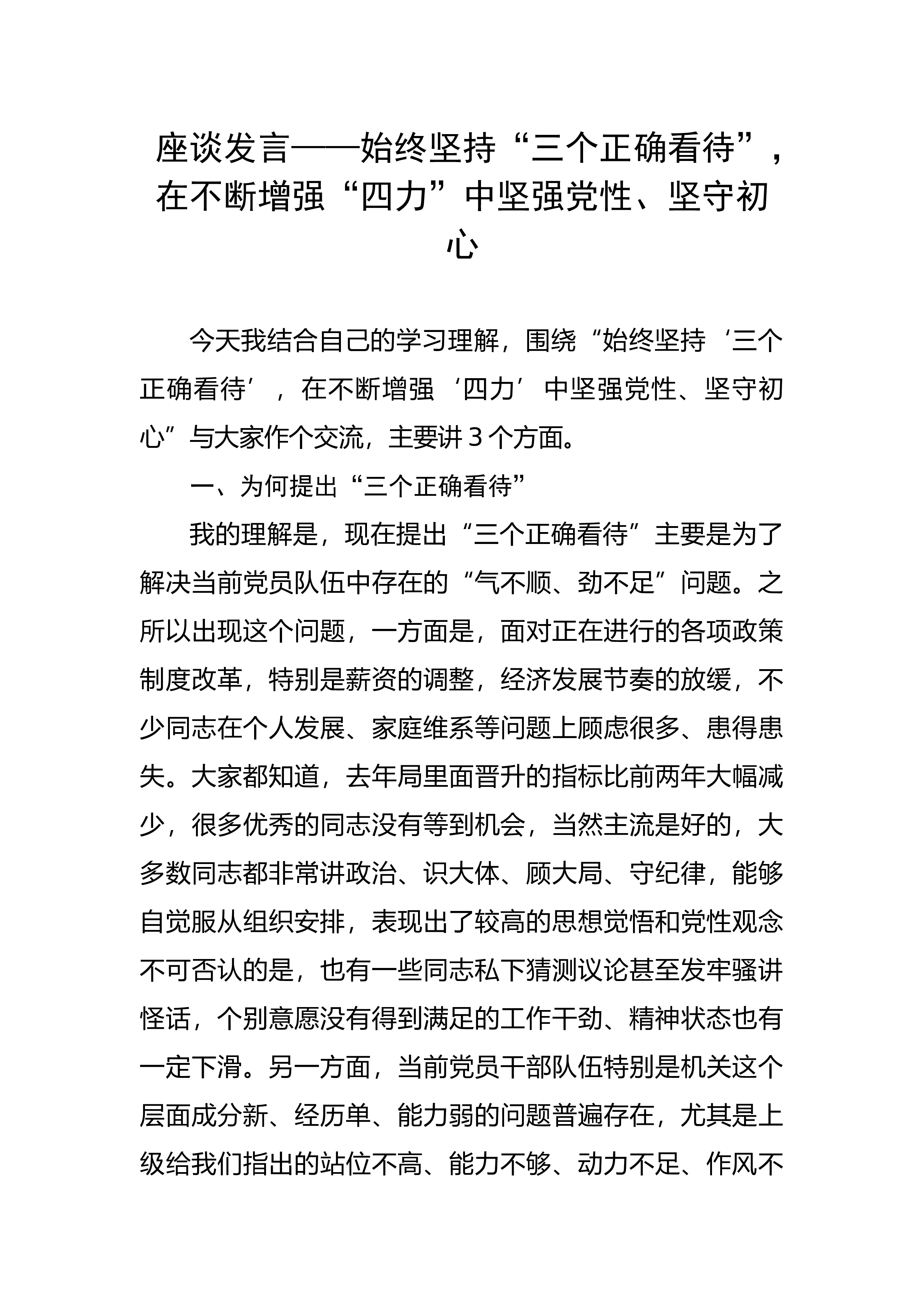 座谈交流发言:坚定捍卫“两个确立”忠诚履职尽责担当作为党的二十大通过的关于《中国共产党章程(修正案)》的决议强调,“两个确立”是党在新时代取得的重大政治成果,是推动党和国家事业取得历史性成就、发生历史性变革的决定性因素。作为新时代党员干部,我们要深入学习贯彻党的二十大精神,切实把思想和行动统一到党的二十大精神上来,以忠诚担当、高度负责、昂扬向上的精神状态扎实做好各项工作。一、要在“学”上用心,信念更加坚定。党的二十大报告提出,要坚持不懈用新时代中国特色社会主义思想凝心铸魂,全面加强党的思想建设,加强理想信念教育,引导全党牢记党的宗旨,自觉做共产主义远大理想和中国特色社会主义共同理想的坚定信仰者...