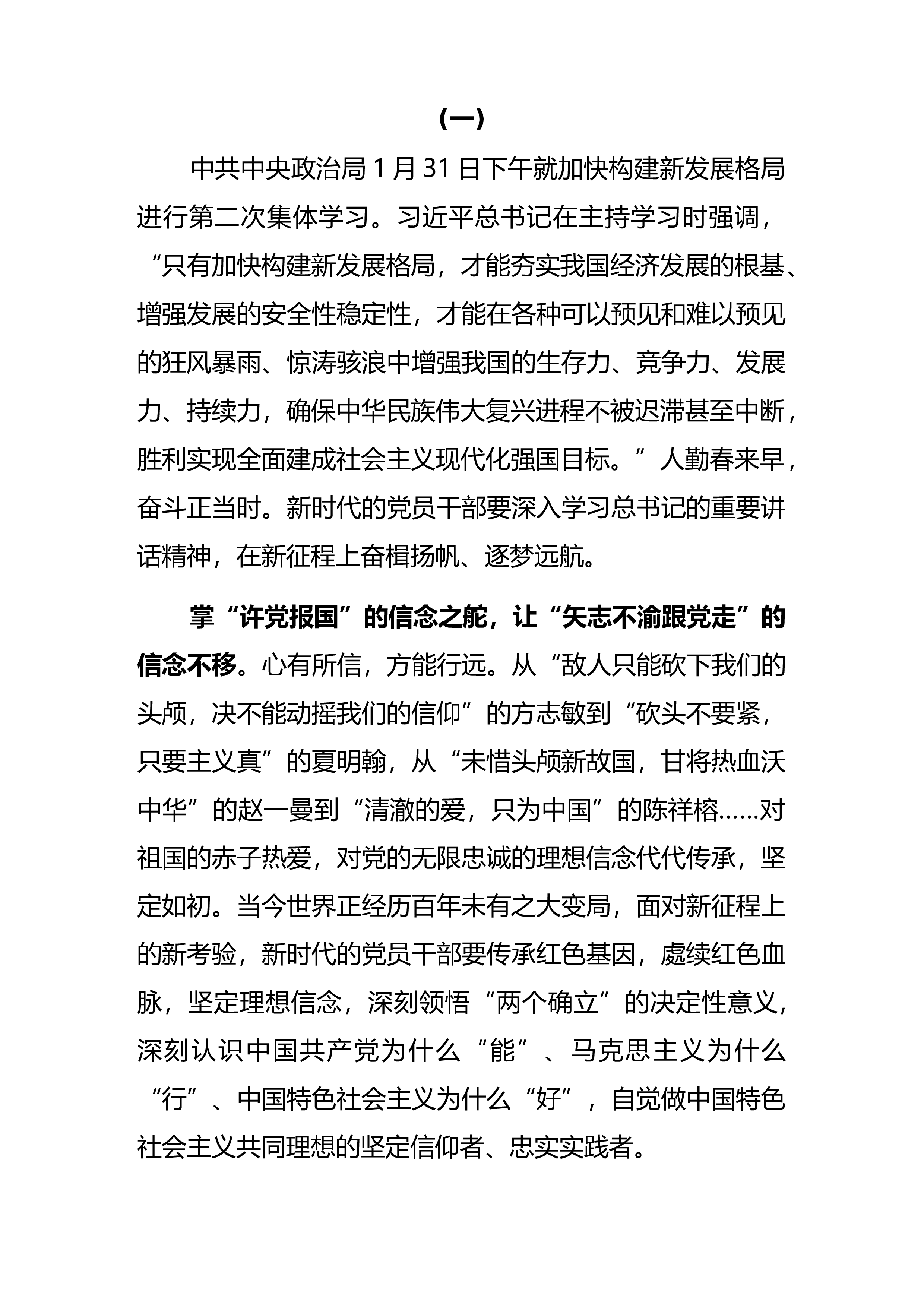 (一)中共中央政治局1月31日下午就加快构建新发展格局进行第二次集体学习。习近平总书记在主持学习时强调,“只有加快构建新发展格局,才能夯实我国经济发展的根基、增强发展的安全性稳定性,才能在各种可以预见和难以预见的狂风暴雨、惊涛骇浪中增强我国的生存力、竞争力、发展力、持续力,确保中华民族伟大复兴进程不被迟滞甚至中断,胜利实现全面建成社会主义现代化强国目标。”人勤春来早,奋斗正当时。新时代的党员干部要深入学习总书记的重要讲话精神,在新征程上奋楫扬帆、逐梦远航。掌“许党报国”的信念之舵,让“矢志不渝跟党走”的信念不移。心有所信,方能行远。从“敌人只能砍下我们的头颅,决不能动摇我们的信仰”的方志敏到“...
