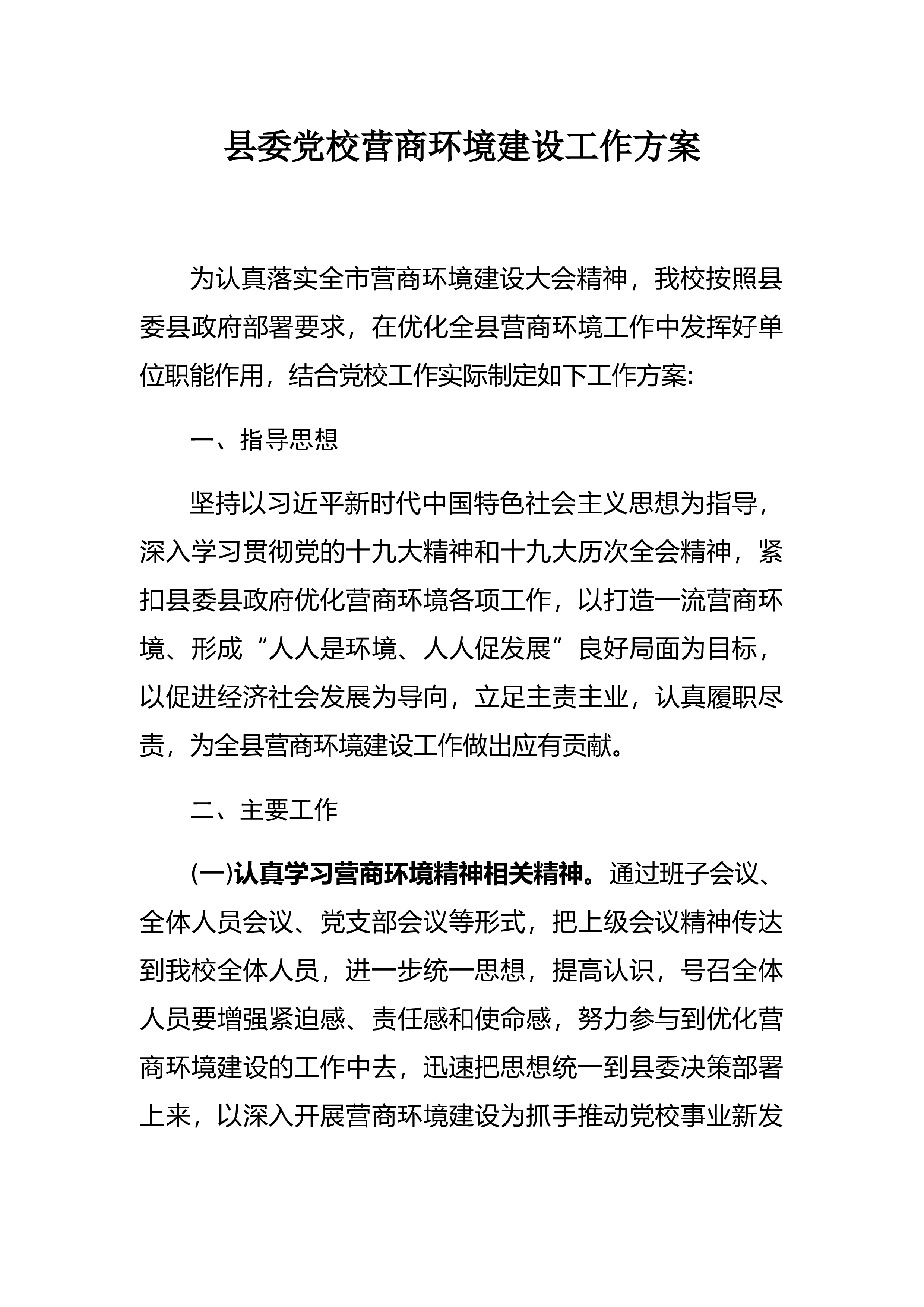 县委党校营商环境建设工作方案为认真落实全市营商环境建设大会精神,我校按照县委县政府部署要求,在优化全县营商环境工作中发挥好单位职能作用,结合党校工作实际制定如下工作方案:一、指导思想坚持以习近平新时代中国特色社会主义思想为指导,深入学习贯彻党的十九大精神和十九大历次全会精神,紧扣县委县政府优化营商环境各项工作,以打造一流营商环境、形成“人人是环境、人人促发展”良好局面为目标,以促进经济社会发展为导向,立足主责主业,认真履职尽责,为全县营商环境建设工作做出应有贡献。二、主要工作(一)认真学习营商环境精神相关精神。通过班子会议、全体人员会议、党支部会议等形式,把上级会议精神传达到我校全体人员,进一...