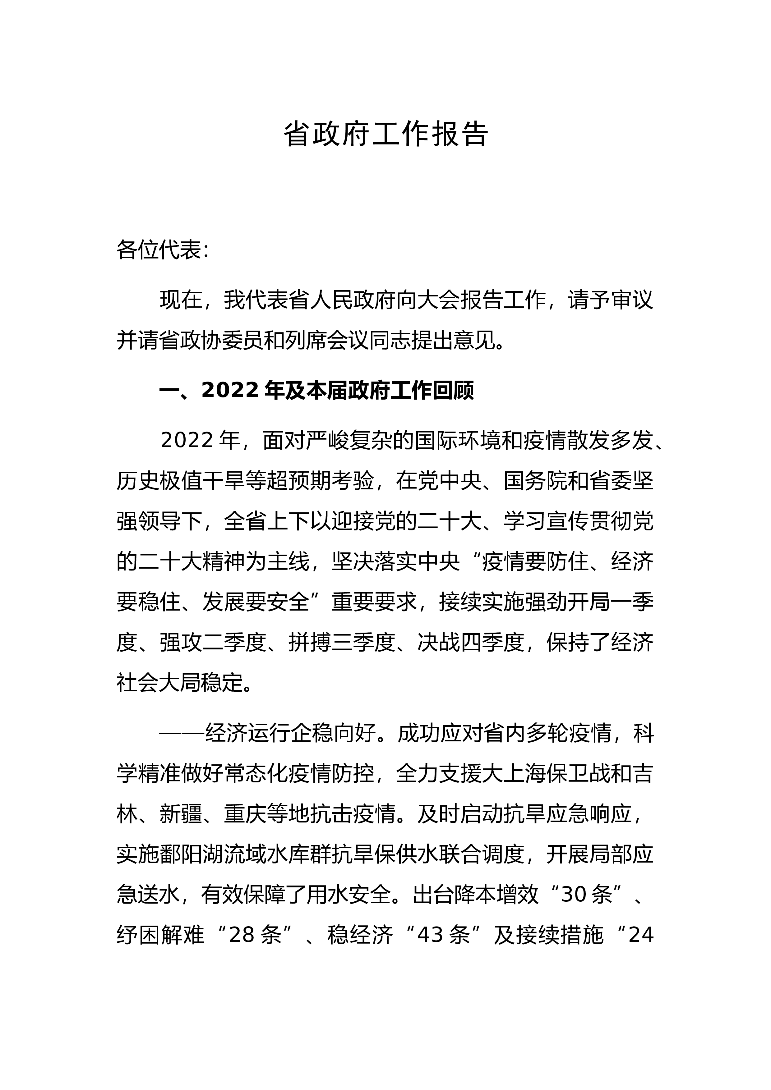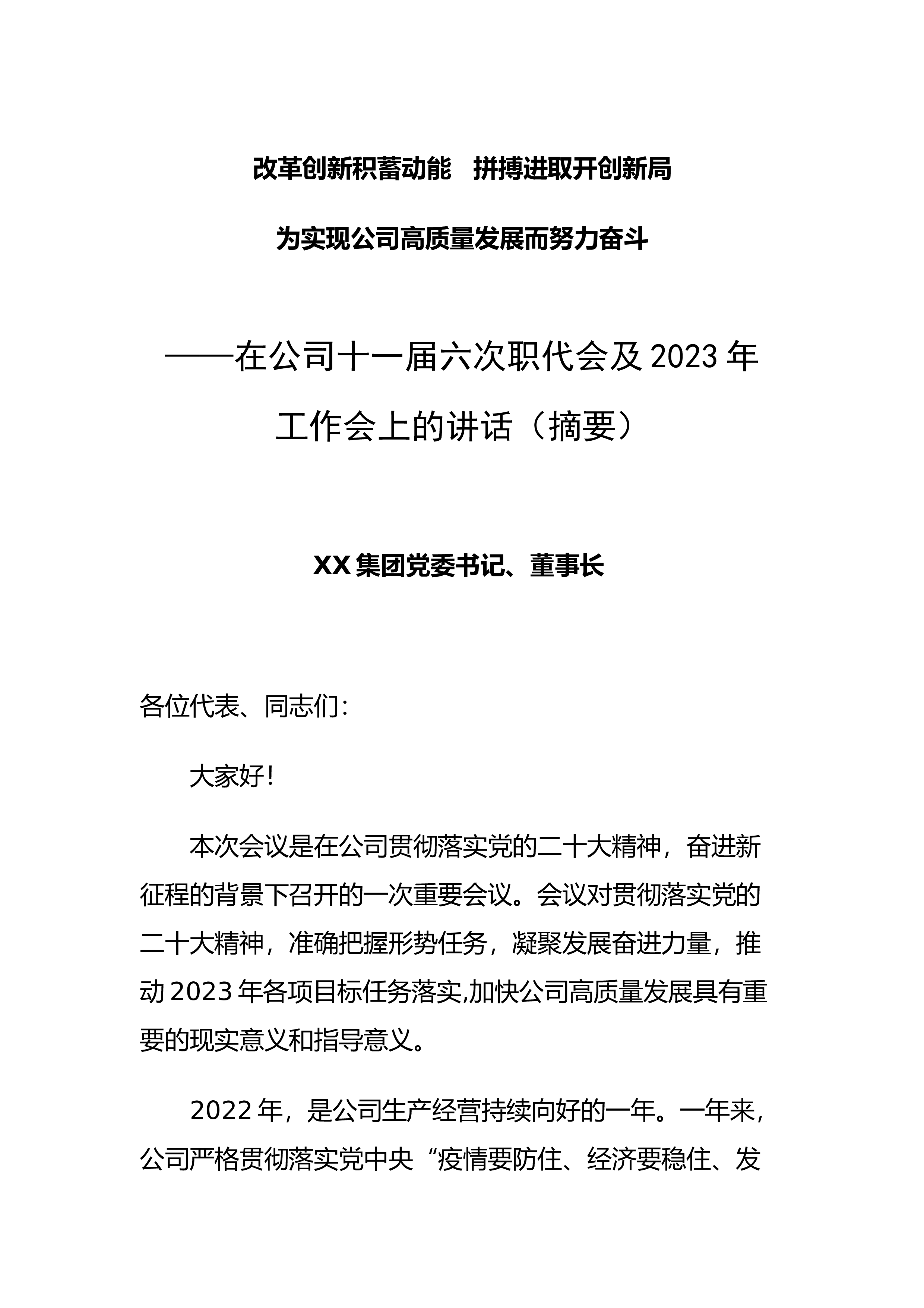 改革创新积蓄动能拼搏进取开创新局为实现公司高质量发展而努力奋斗——在公司十一届六次职代会及2023年工作会上的讲话(摘要)XX集团党委书记、董事长各位代表、同志们:大家好!本次会议是在公司贯彻落实党的二十大精神,奋进新征程的背景下召开的一次重要会议。会议对贯彻落实党的二十大精神,准确把握形势任务,凝聚发展奋进力量,推动2023年各项目标任务落实,加快公司高质量发展具有重要的现实意义和指导意义。2022年,是公司生产经营持续向好的一年。一年来,公司严格贯彻落实党中央“疫情要防住、经济要稳住、发展要安全”的总要求,牢牢把握市场机遇,紧紧围绕年初目标不动摇,全力以赴促发展、提效益、控风险、保稳定,整...