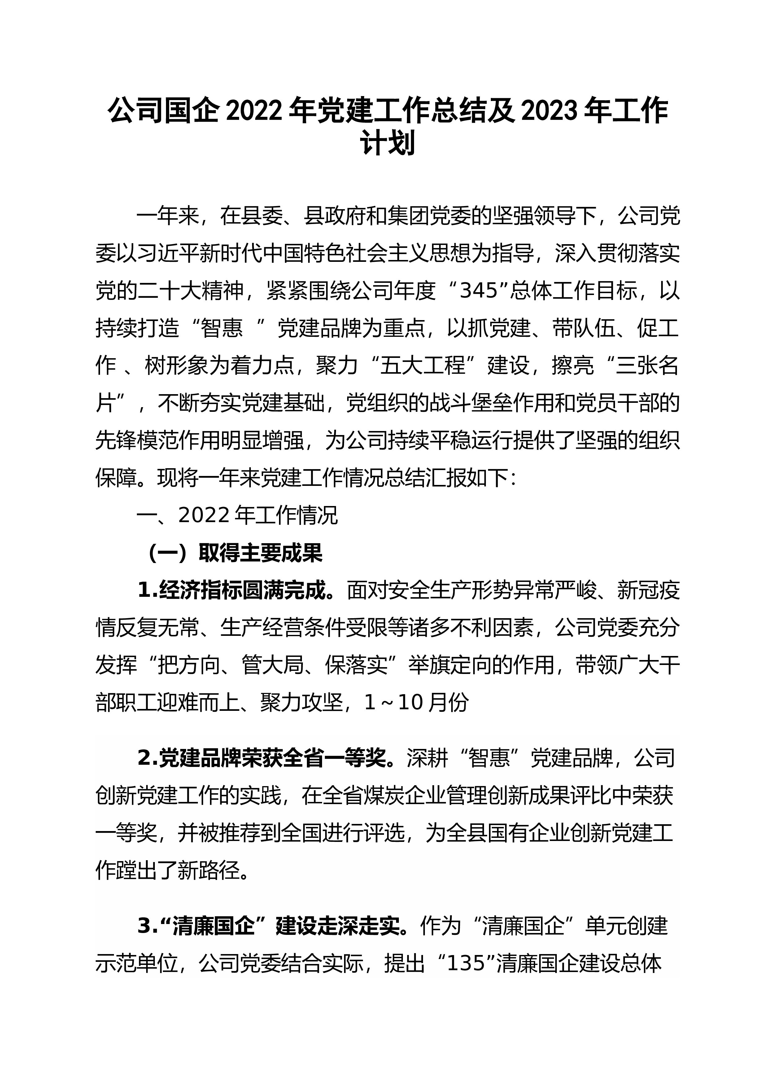 2022年某国企党委换届工作报告同志们:下面,我代表中国共产党XXX委员会向大会做报告。本次大会的主题是:高举习近平新时代中国特色社会主义思想伟大旗帜,深入贯彻党的二十大及省委十五次党代会精神,全面对标XXX、服务争当XXX,认真落实XXX党代会部署要求,踔厉奋发、勇毅前行,在高质量发展新征程上行稳致远,全力向XXX领军企业迈进。一、过去五年的工作过去的五年,是极不寻常、极不平凡的五年。面对复杂严峻的国内外发展环境,特别是新冠肺炎全球大流行、中美经贸摩擦等重大风险挑战,我们在XXX的坚强领导下,坚持稳中求进总基调,坚持党建引领促发展,统筹推进疫情防控和生产经营,在危机中育先机、于变局中开新局,...