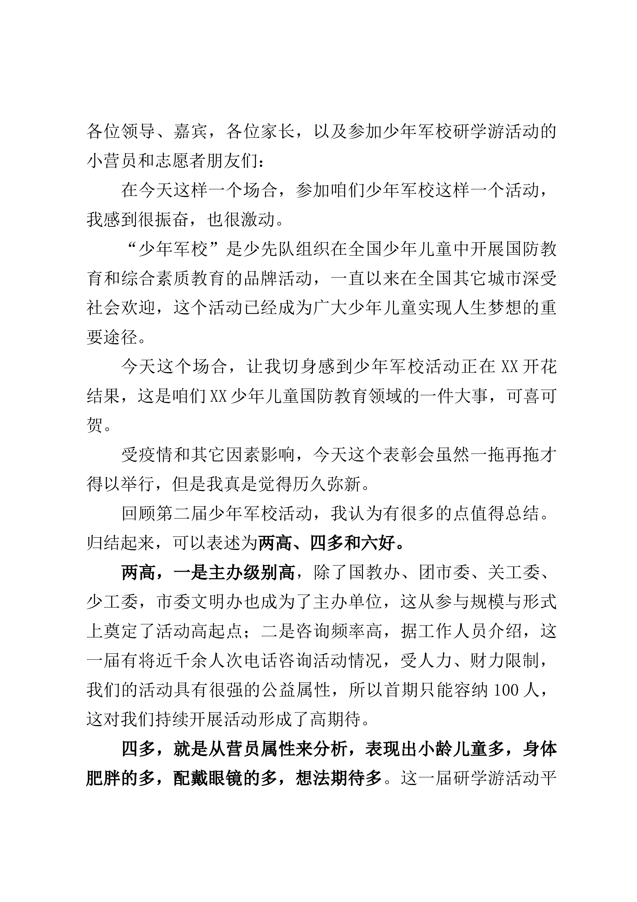 各位领导、嘉宾,各位家长,以及参加少年军校研学游活动的小营员和志愿者朋友们:在今天这样一个场合,参加咱们少年军校这样一个活动,我感到很振奋,也很激动。“少年军校”是少先队组织在全国少年儿童中开展国防教育和综合素质教育的品牌活动,一直以来在全国其它城市深受社会欢迎,这个活动已经成为广大少年儿童实现人生梦想的重要途径。今天这个场合,让我切身感到少年军校活动正在XX开花结果,这是咱们XX少年儿童国防教育领域的一件大事,可喜可贺。受疫情和其它因素影响,今天这个表彰会虽然一拖再拖才得以举行,但是我真是觉得历久弥新。回顾第二届少年军校活动,我认为有很多的点值得总结。归结起来,可以表述为两高、四多和六好。两...