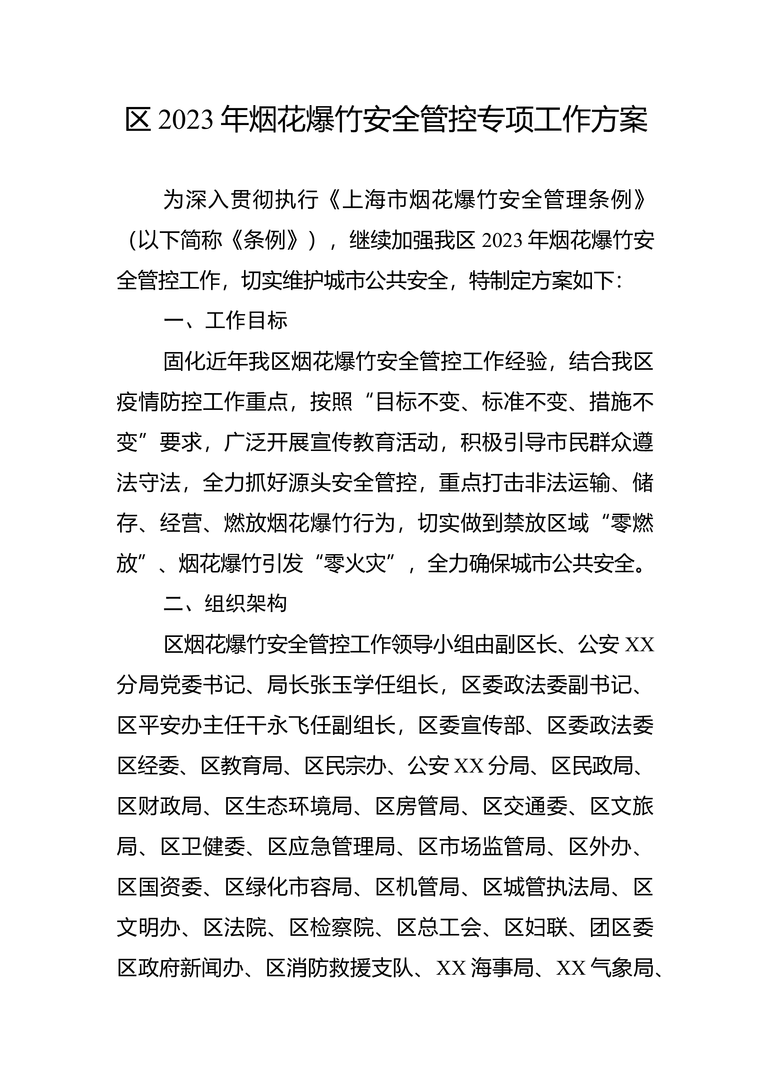 区2023年烟花爆竹安全管控专项工作方案为深入贯彻执行《上海市烟花爆竹安全管理条例》(以下简称《条例》),继续加强我区2023年烟花爆竹安全管控工作,切实维护城市公共安全,特制定方案如下:一、工作目标固化近年我区烟花爆竹安全管控工作经验,结合我区疫情防控工作重点,按照“目标不变、标准不变、措施不变”要求,广泛开展宣传教育活动,积极引导市民群众遵法守法,全力抓好源头安全管控,重点打击非法运输、储存、经营、燃放烟花爆竹行为,切实做到禁放区域“零燃放”、烟花爆竹引发“零火灾”,全力确保城市公共安全。二、组织架构区烟花爆竹安全管控工作领导小组由副区长、公安XX分局党委书记、局长张玉学任组长,...