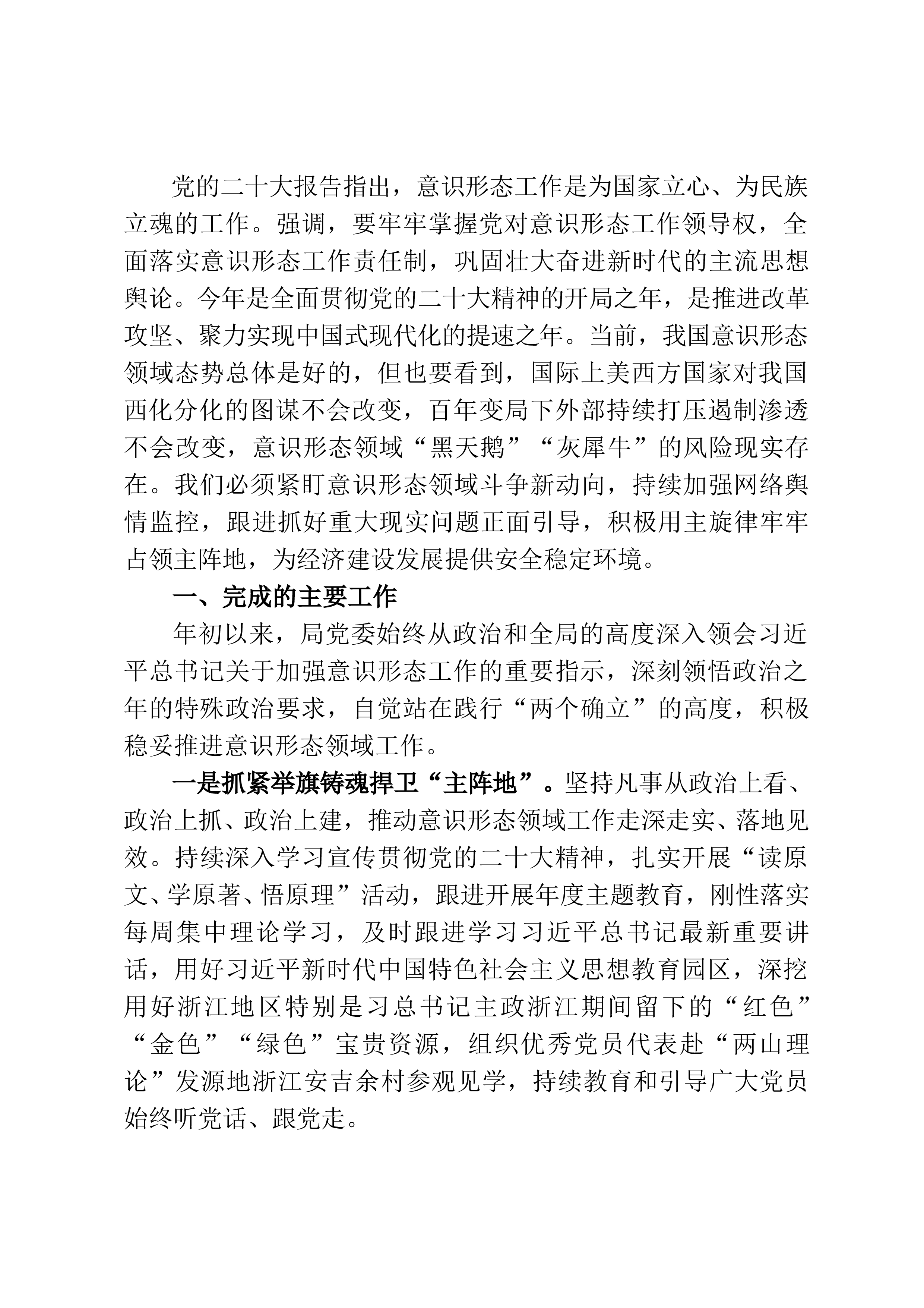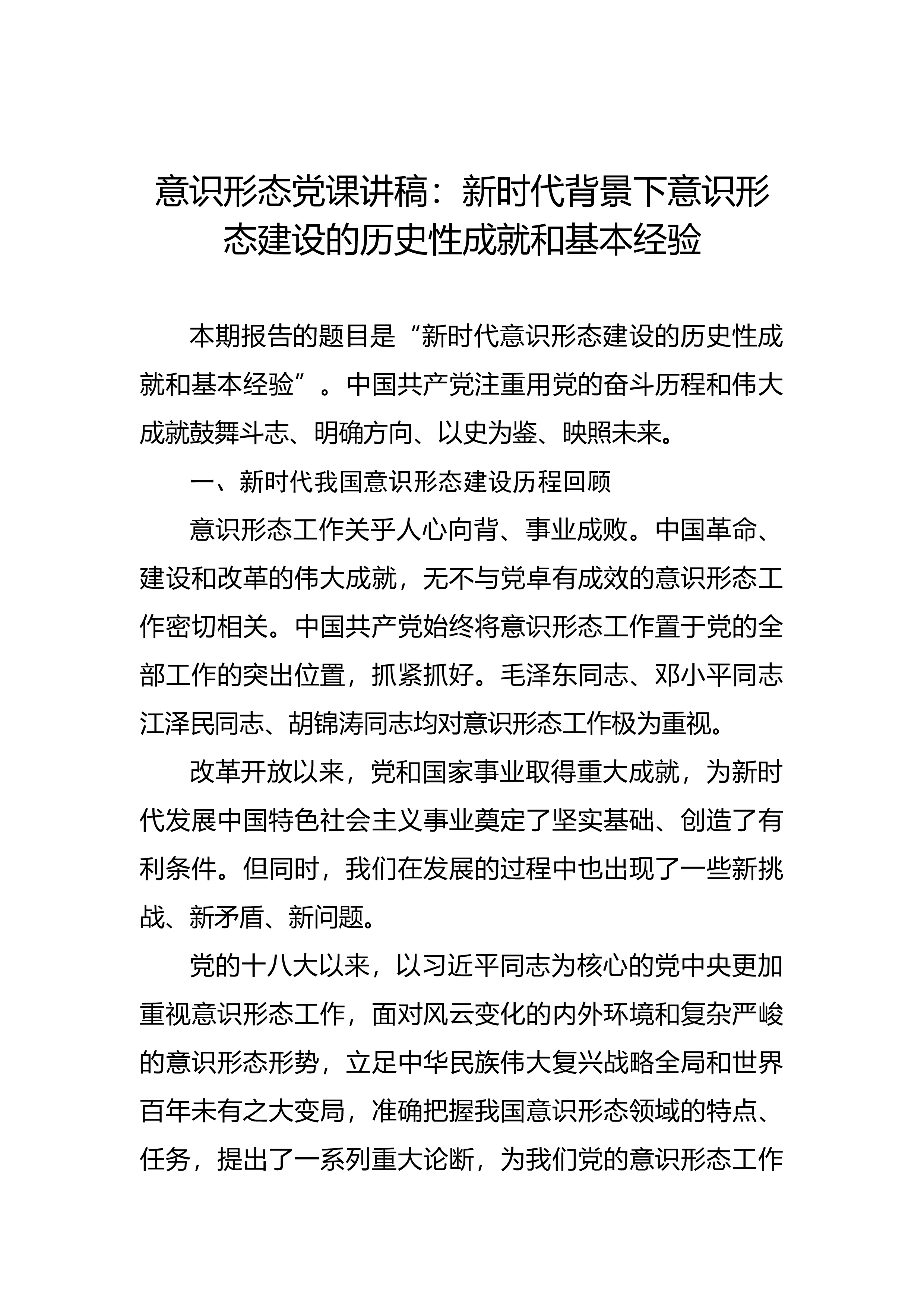 意识形态党课讲稿:新时代背景下意识形态建设的历史性成就和基本经验本期报告的题目是“新时代意识形态建设的历史性成就和基本经验”。中国共产党注重用党的奋斗历程和伟大成就鼓舞斗志、明确方向、以史为鉴、映照未来。一、新时代我国意识形态建设历程回顾意识形态工作关乎人心向背、事业成败。中国革命、建设和改革的伟大成就,无不与党卓有成效的意识形态工作密切相关。中国共产党始终将意识形态工作置于党的全部工作的突出位置,抓紧抓好。毛泽东同志、邓小平同志江泽民同志、胡锦涛同志均对意识形态工作极为重视。改革开放以来,党和国家事业取得重大成就,为新时代发展中国特色社会主义事业奠定了坚实基础、创造了有利条件。但同时,我们在...