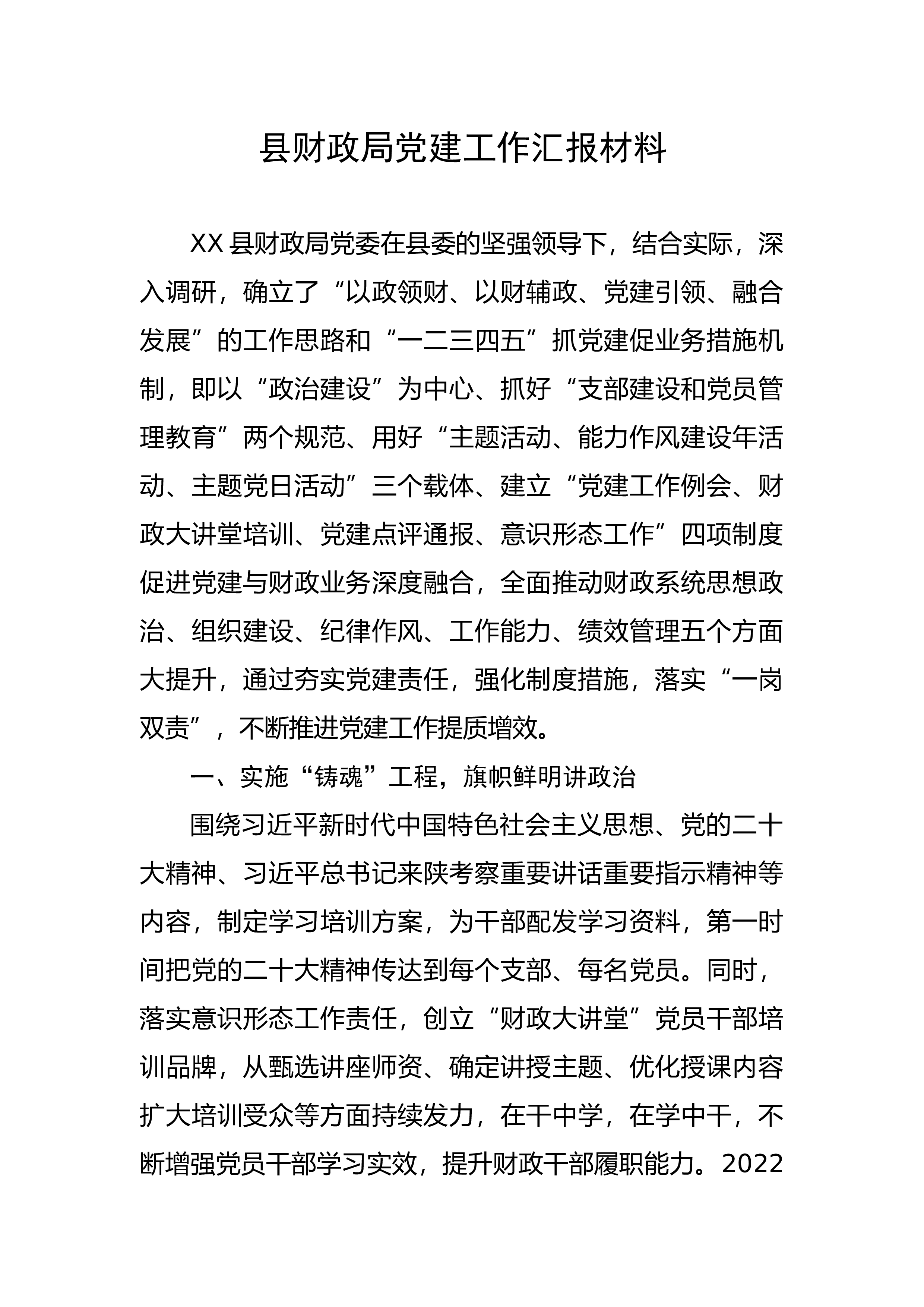 县财政局党建工作汇报材料XX县财政局党委在县委的坚强领导下,结合实际,深入调研,确立了“以政领财、以财辅政、党建引领、融合发展”的工作思路和“一二三四五”抓党建促业务措施机制,即以“政治建设”为中心、抓好“支部建设和党员管理教育”两个规范、用好“主题活动、能力作风建设年活动、主题党日活动”三个载体、建立“党建工作例会、财政大讲堂培训、党建点评通报、