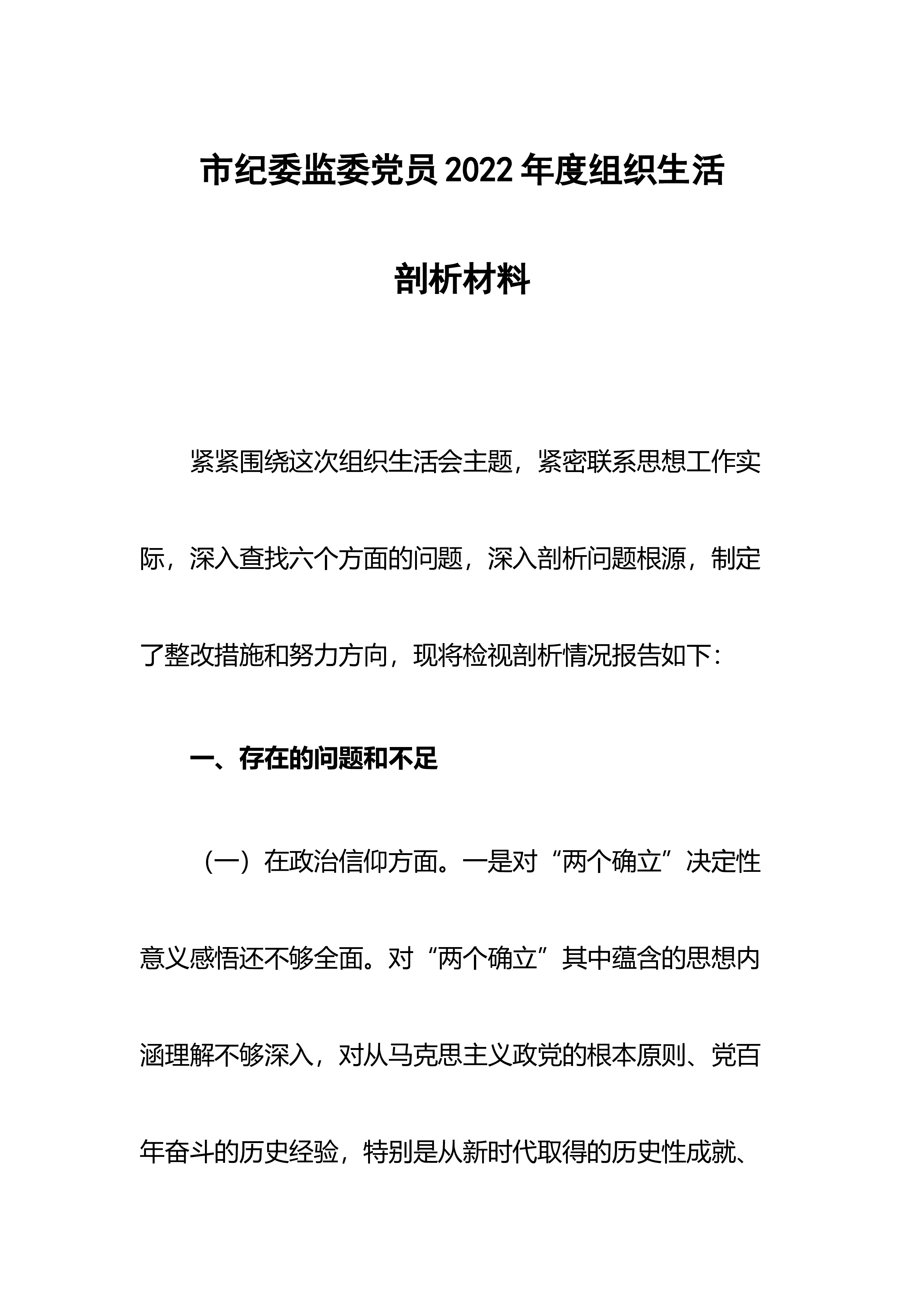 市纪委监委党员2022年度组织生活剖析材料紧紧围绕这次组织生活会主题,紧密联系思想工作实际,深入查找六个方面的问题,深入剖析问题根源,制定了整改措施和努力方向,现将检视剖析情况报告如下: 一、存在的问题和不足 (一)在政治信仰方面。一是对“两个确立”决定性意义感悟还不够全面。对“两个确立”其中蕴含的思想内涵理解不够深入,对从马克思主义政党的根本原则、党百年奋斗的历史经验,特别是从新时代取得的历史性成就、发生的历史性变革中领会和把握“两个确立”的决定性意义方面研究还不够深入。二是政治敏感性有待提高。对新时期党面临的“四大危险”“四大考验”认识不深,对一些敏感问题,特别是